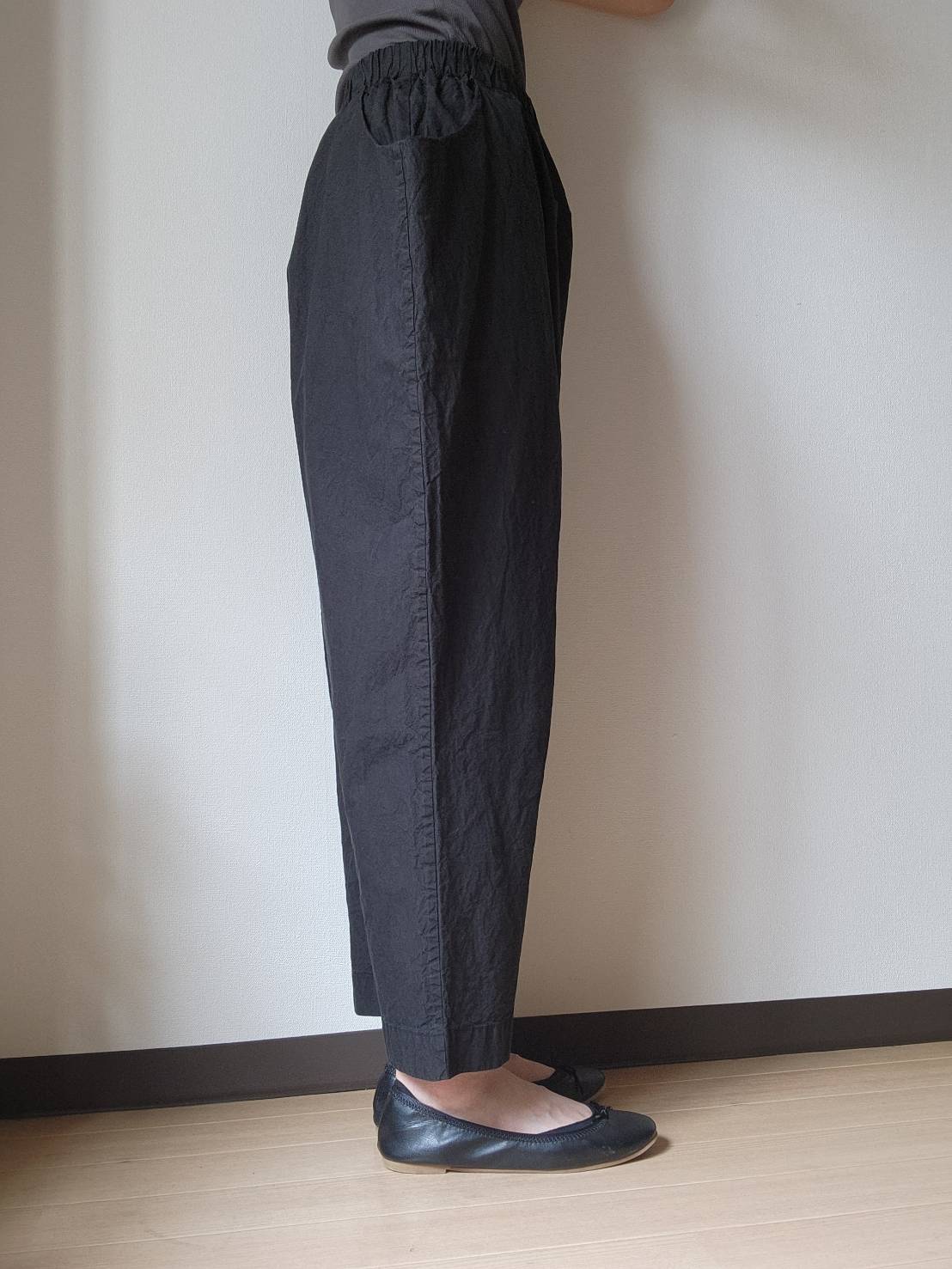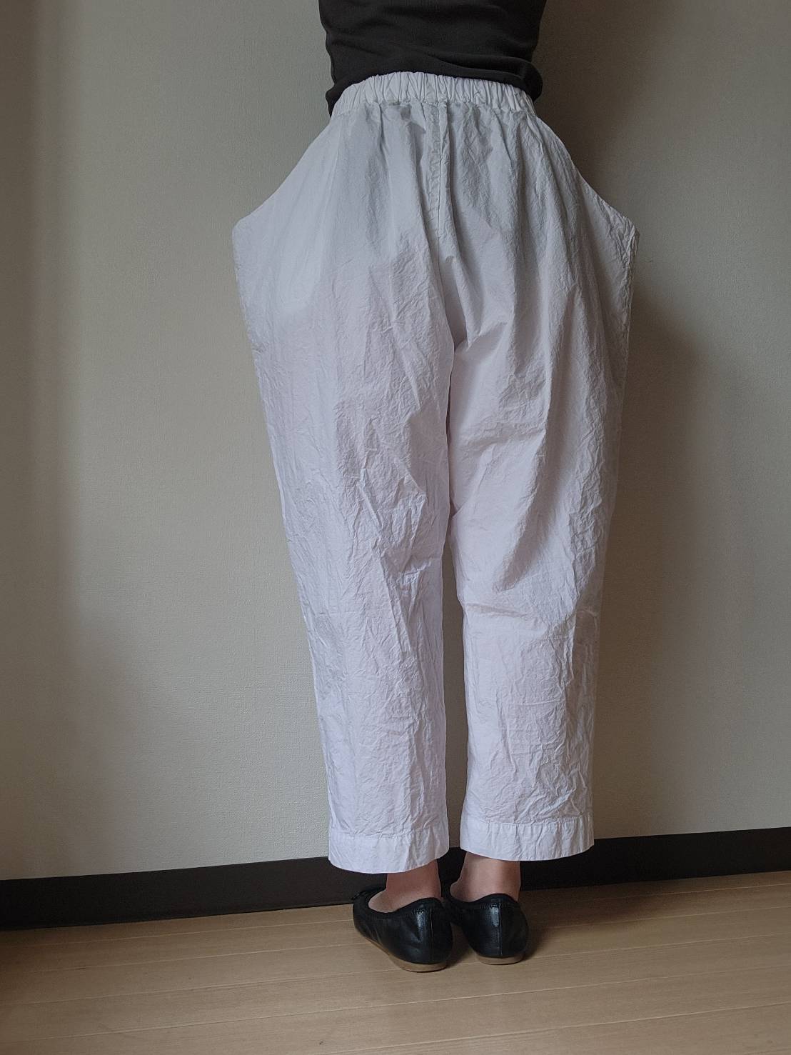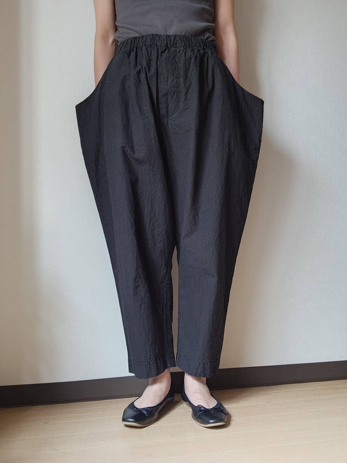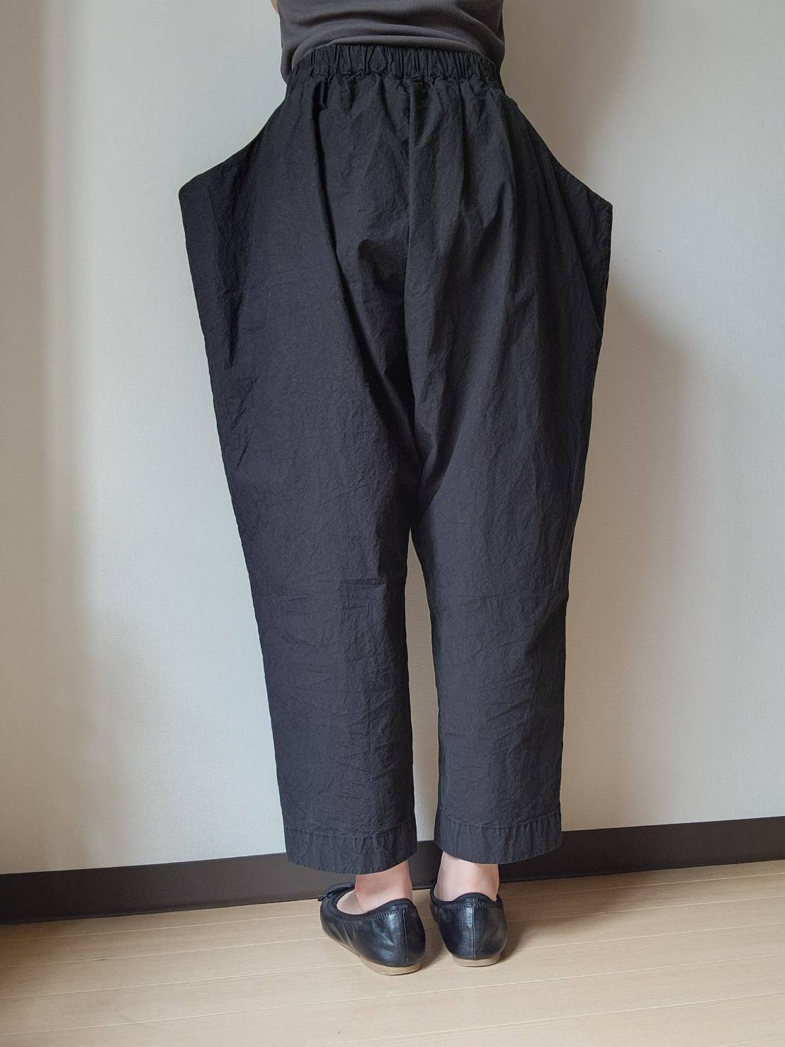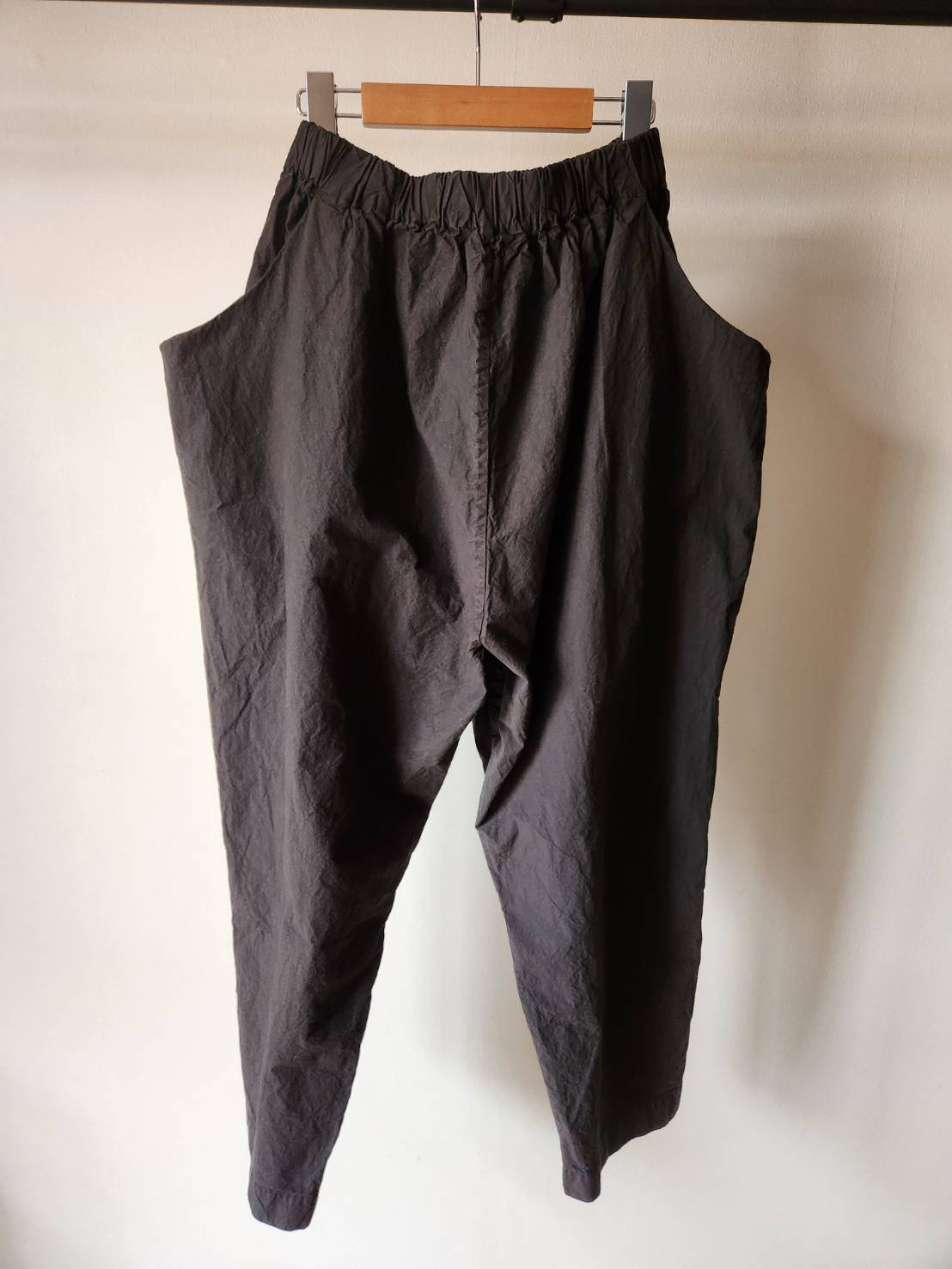 シンプルなデザインながら、ウエストの切り替えを利用した大きなサイドポケットが特徴的な1着。ゆとりのある腰回りから、裾に掛けて細くなるテーパードシルエットです。ウエストはゴム+紐によるイージー仕様です。