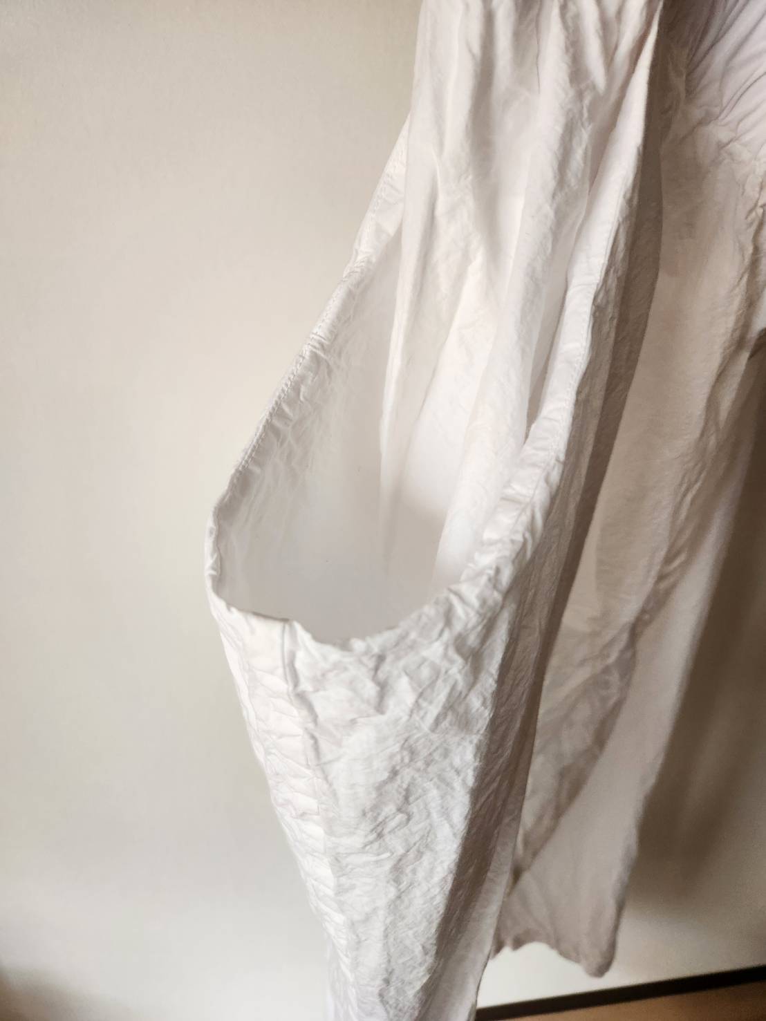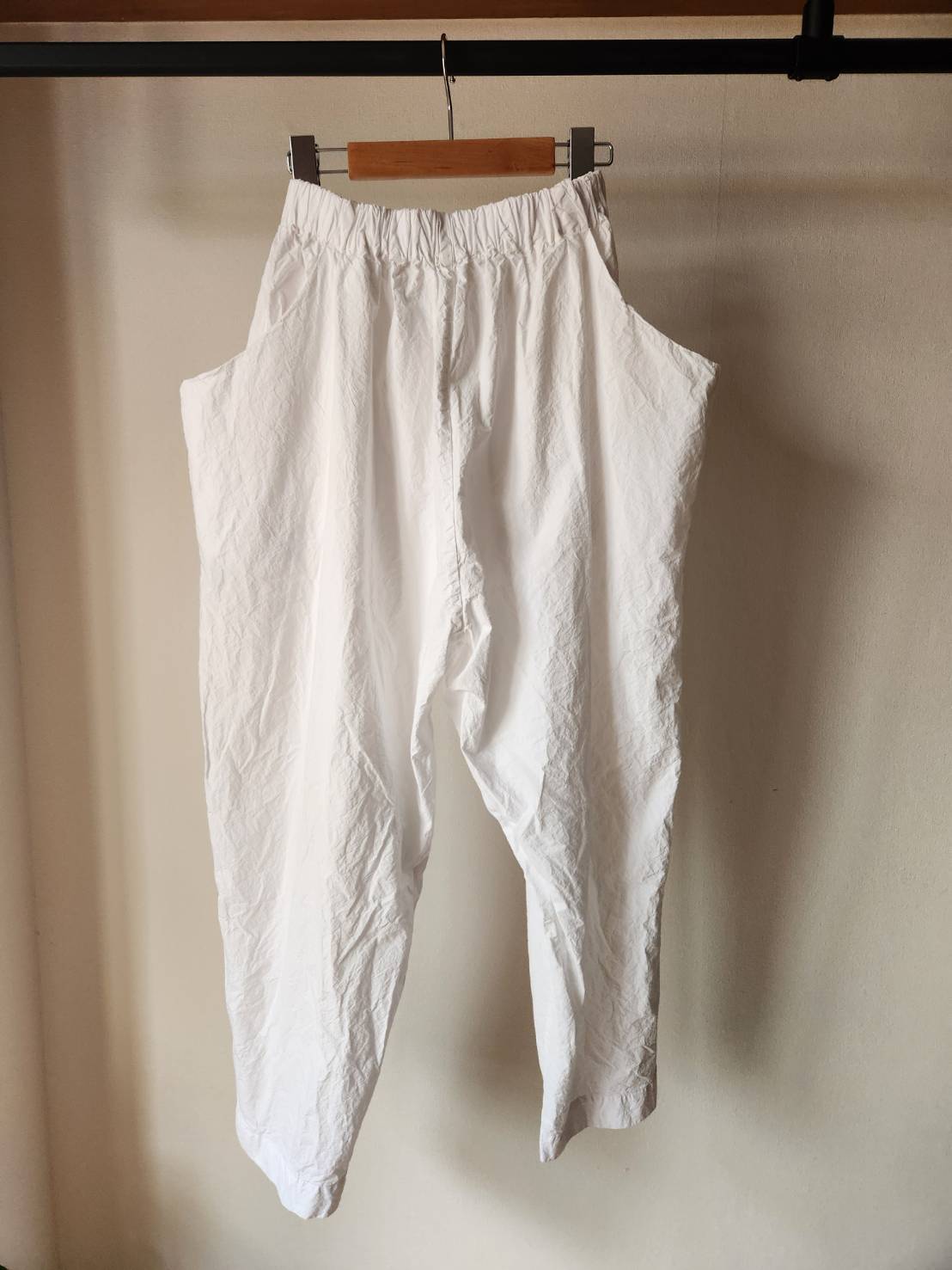 薄手のコットンタイプライター生地を使用したパンツです。製品染めにより随所にパッカリングが起こり、カジュアルな表情に仕上がっています。
