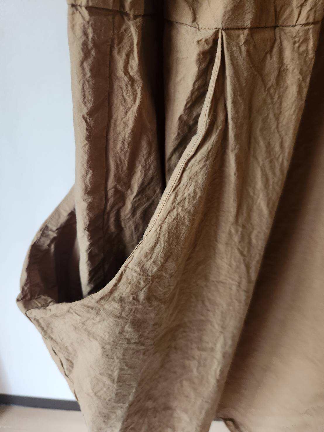 シンプルなデザインながら、ウエストの切り替えを利用した大きなサイドポケットが特徴的な 1 着です。