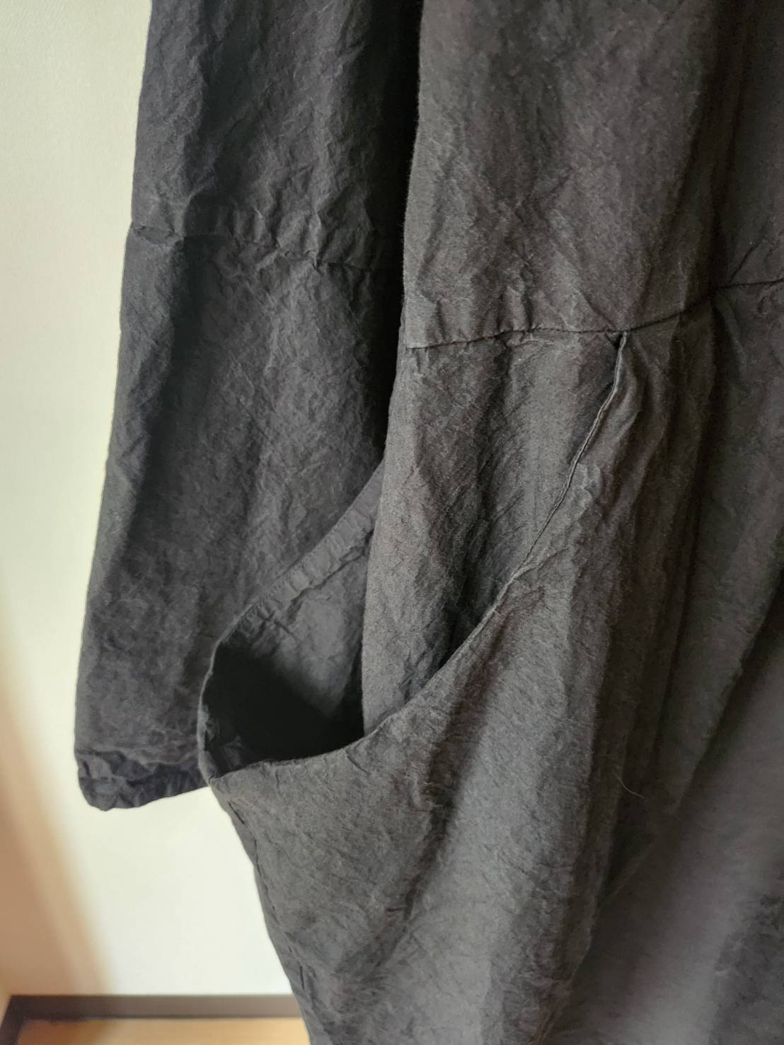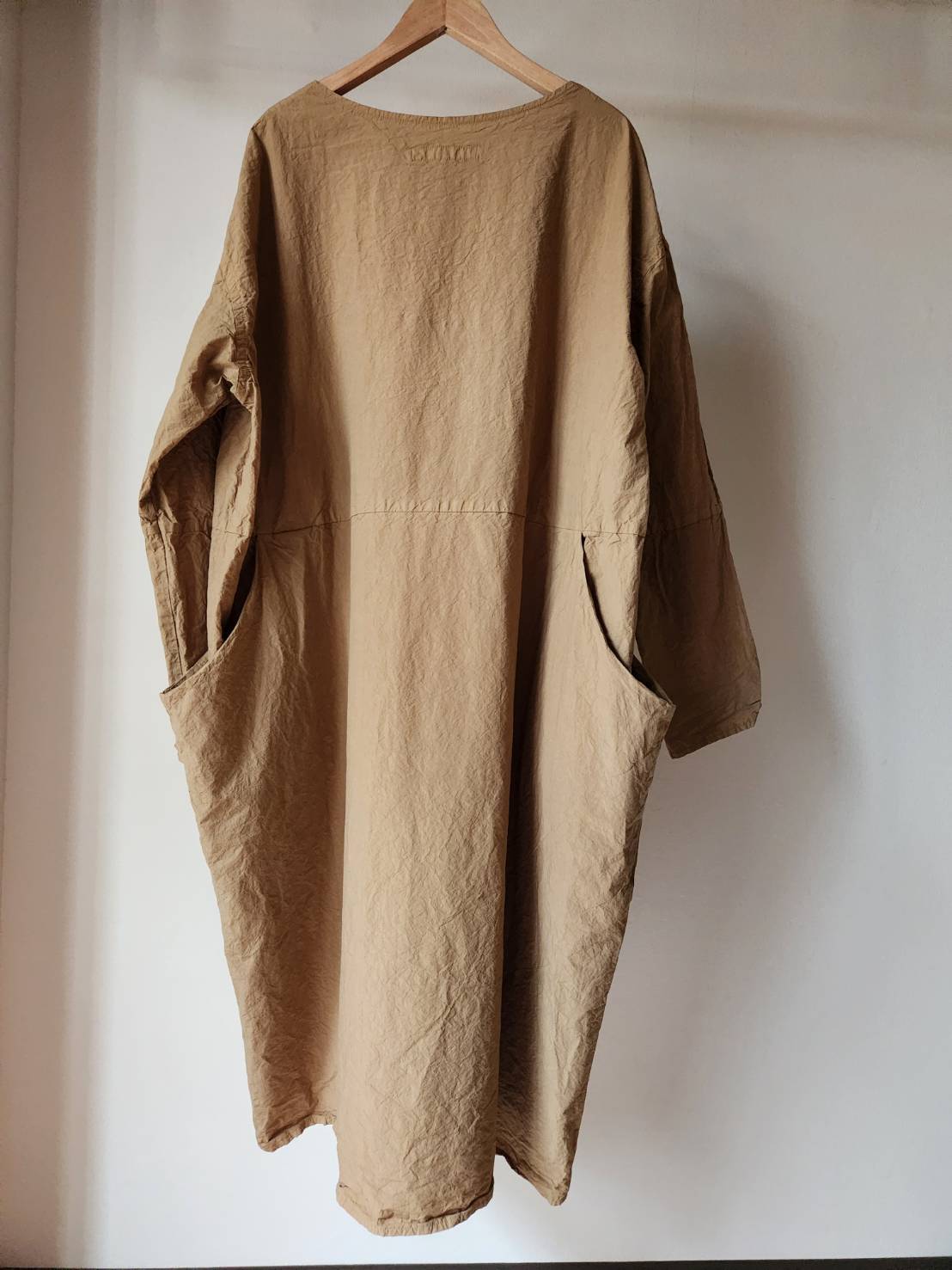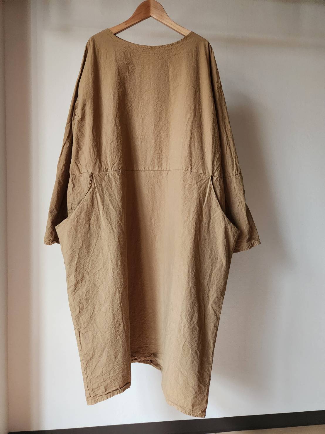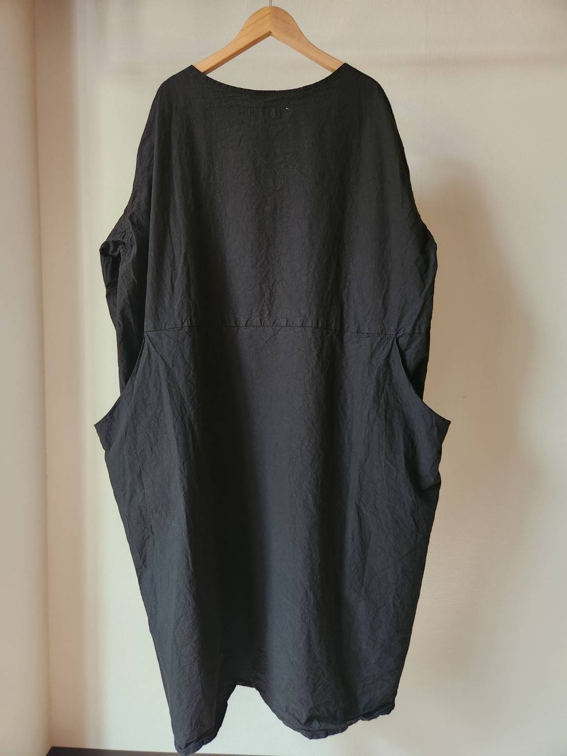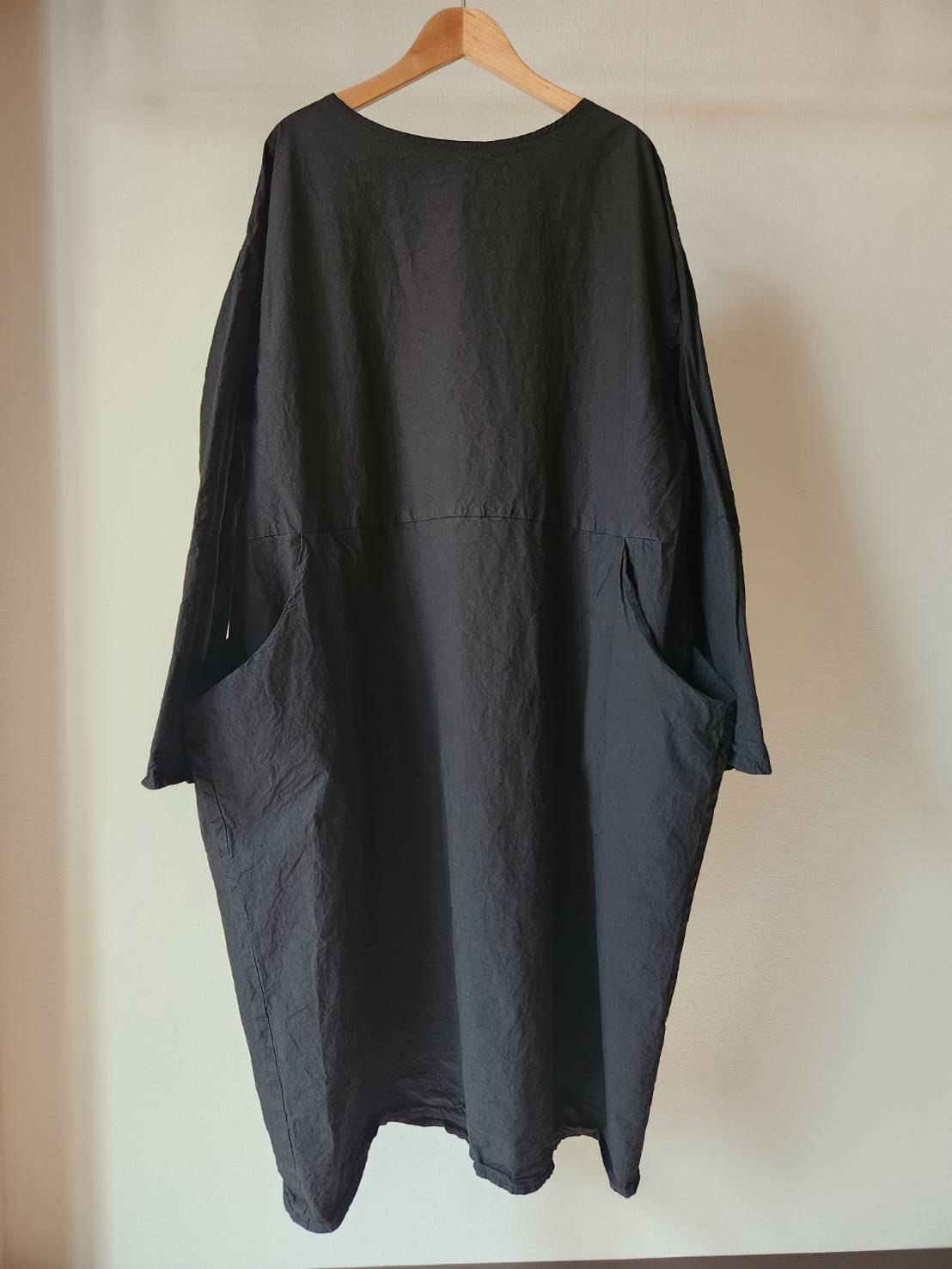 薄手のコットンタイプライター生地を使用したワンピースです。製品染めにより随所にパッカリングが起こり、カジュアルな表情に仕上がっています。