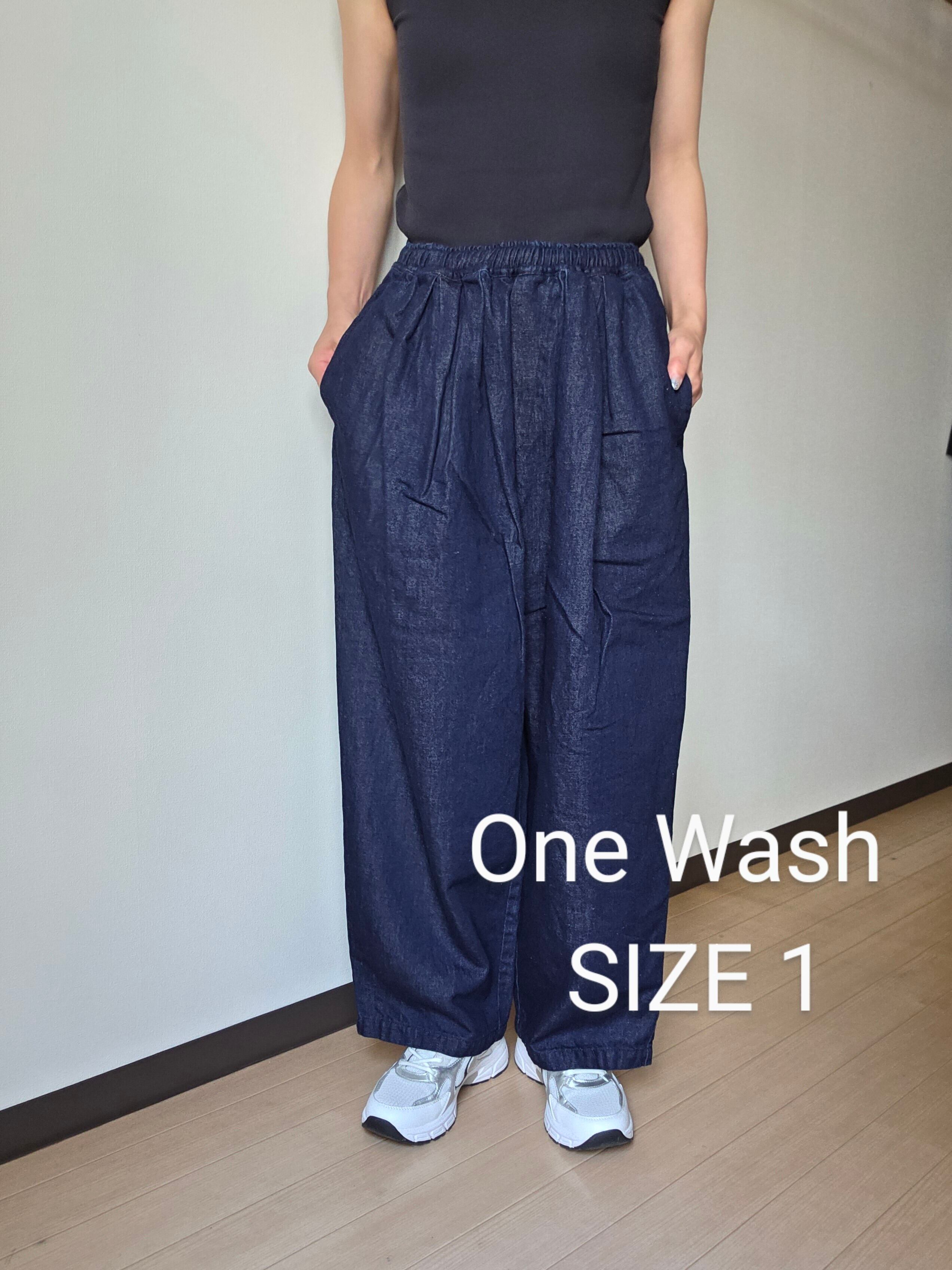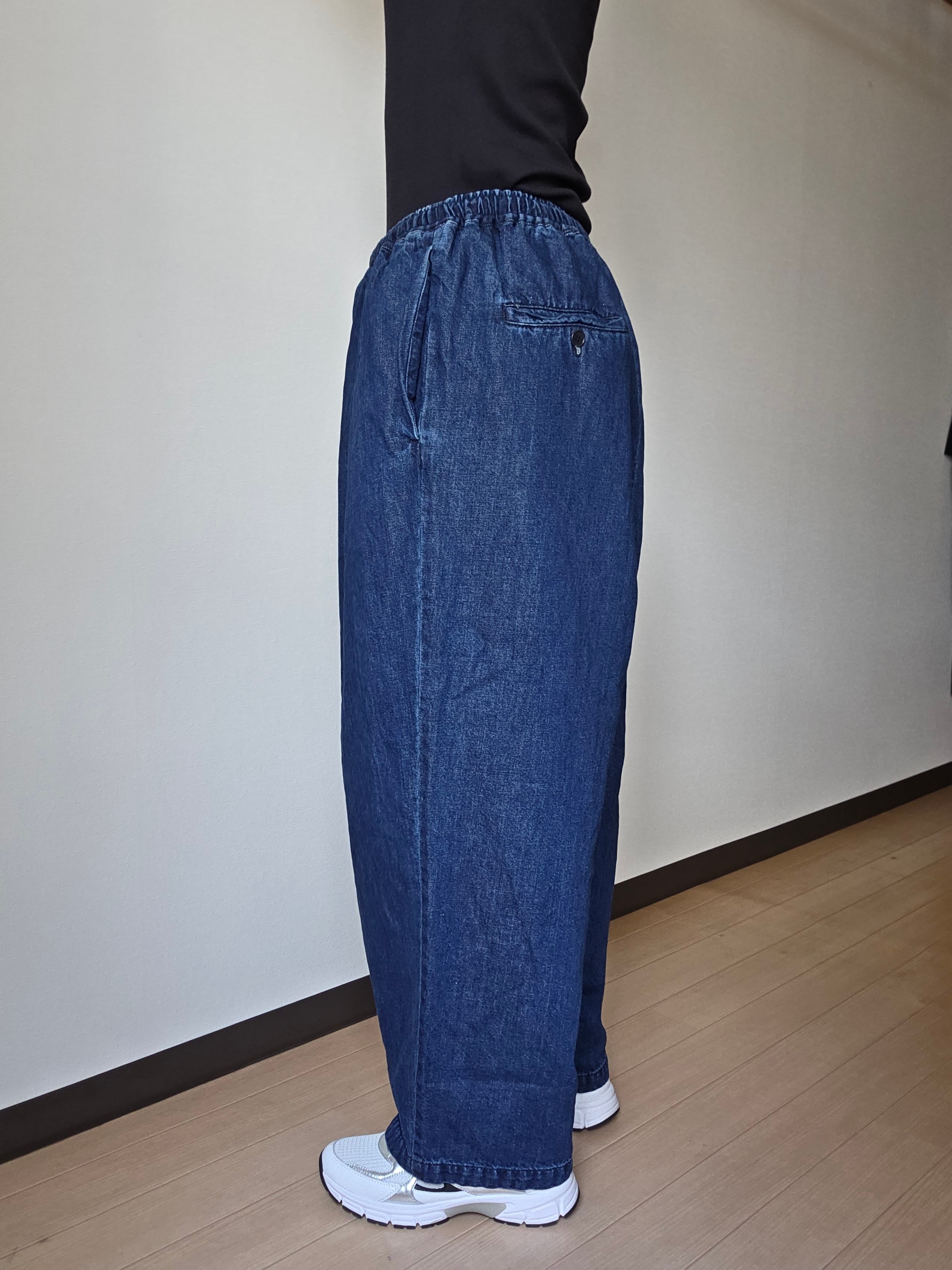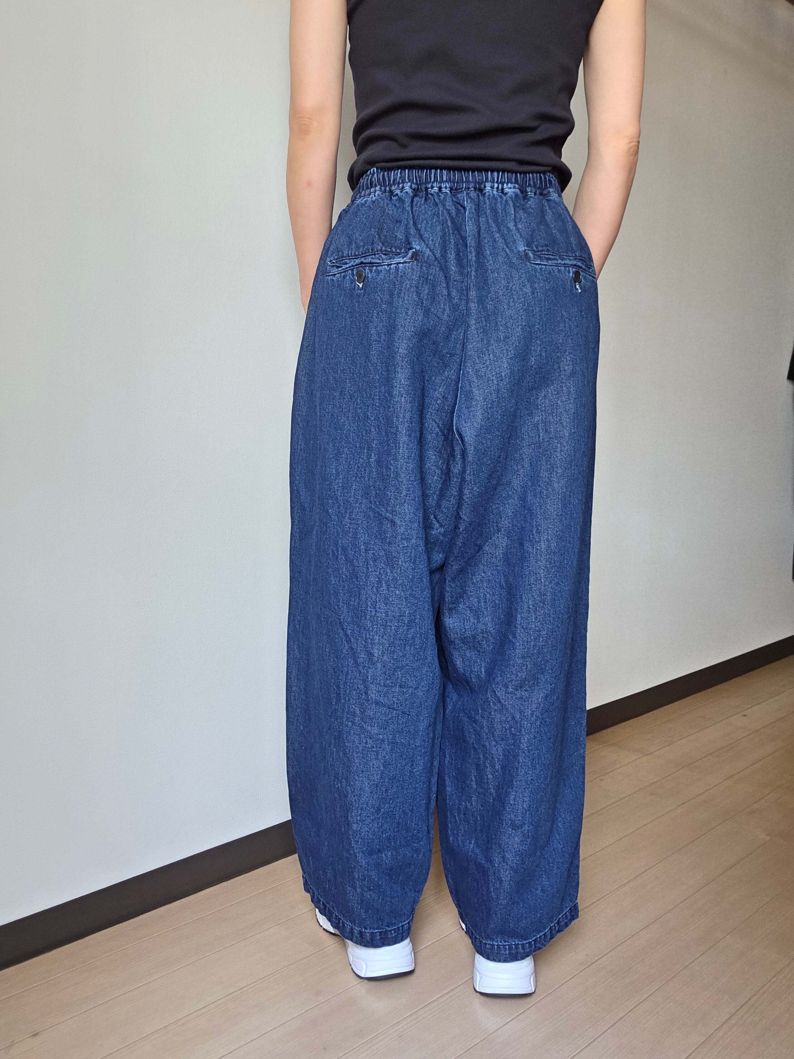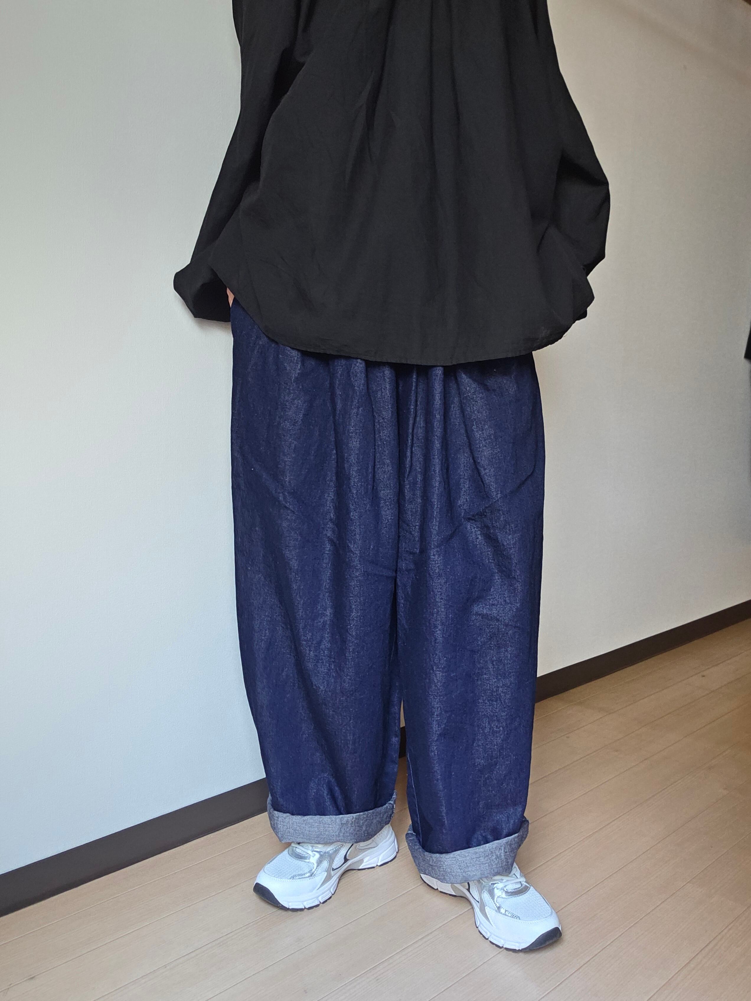 9.5ozのデニムを使用し、フロントに大きくボリュームをとり、ヒップにもゆとりを持たせたテーパードシルエット。ウエストはゴム+ひものイージー仕様です。