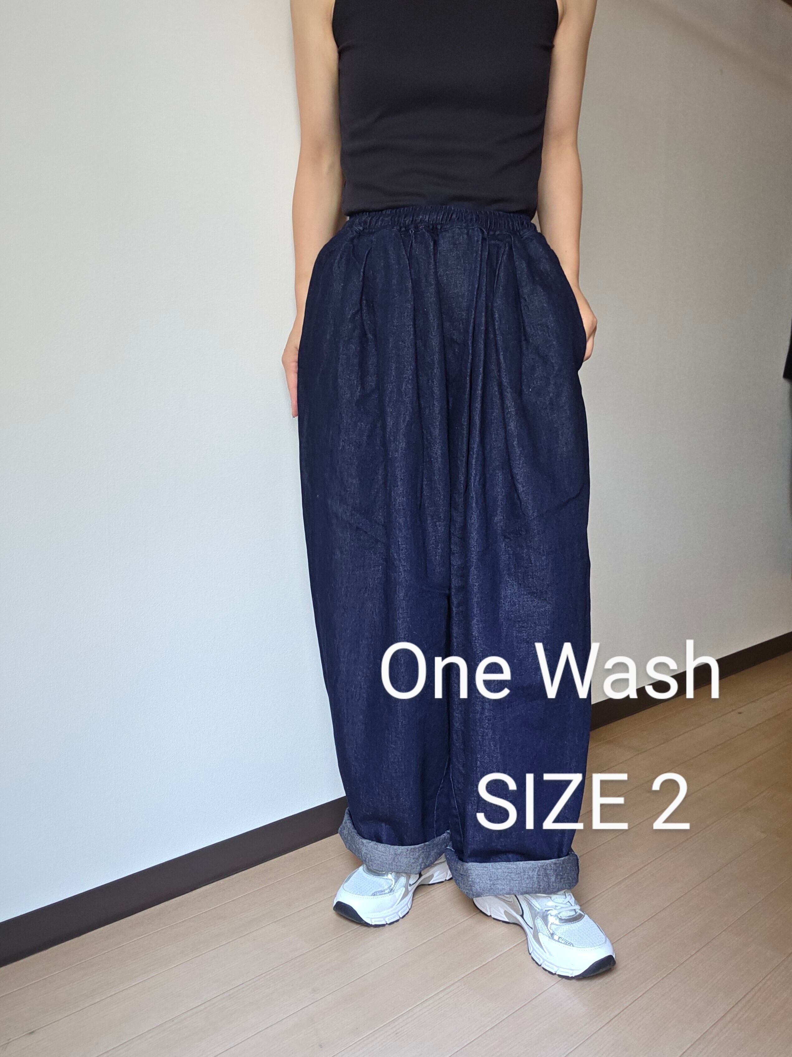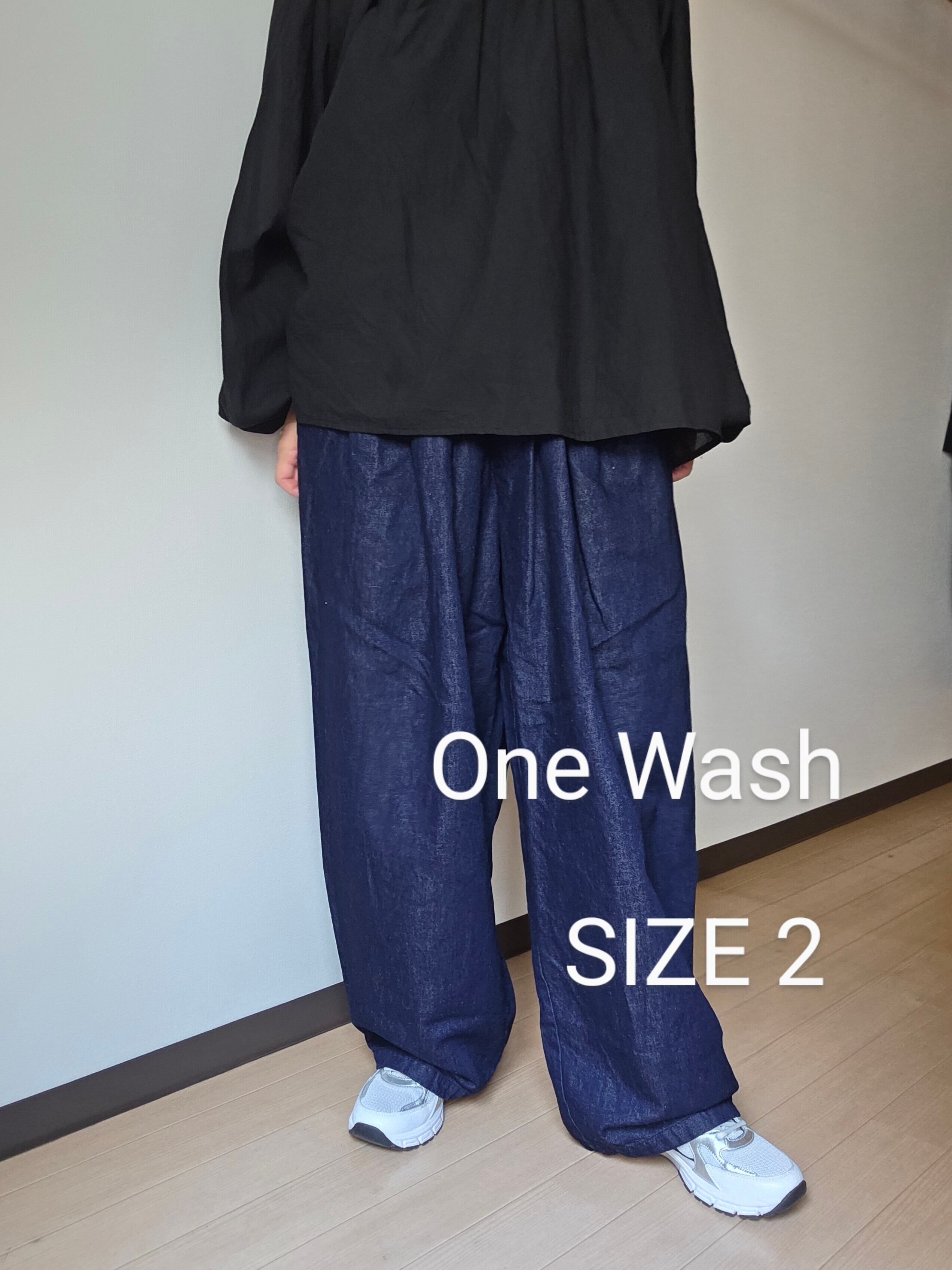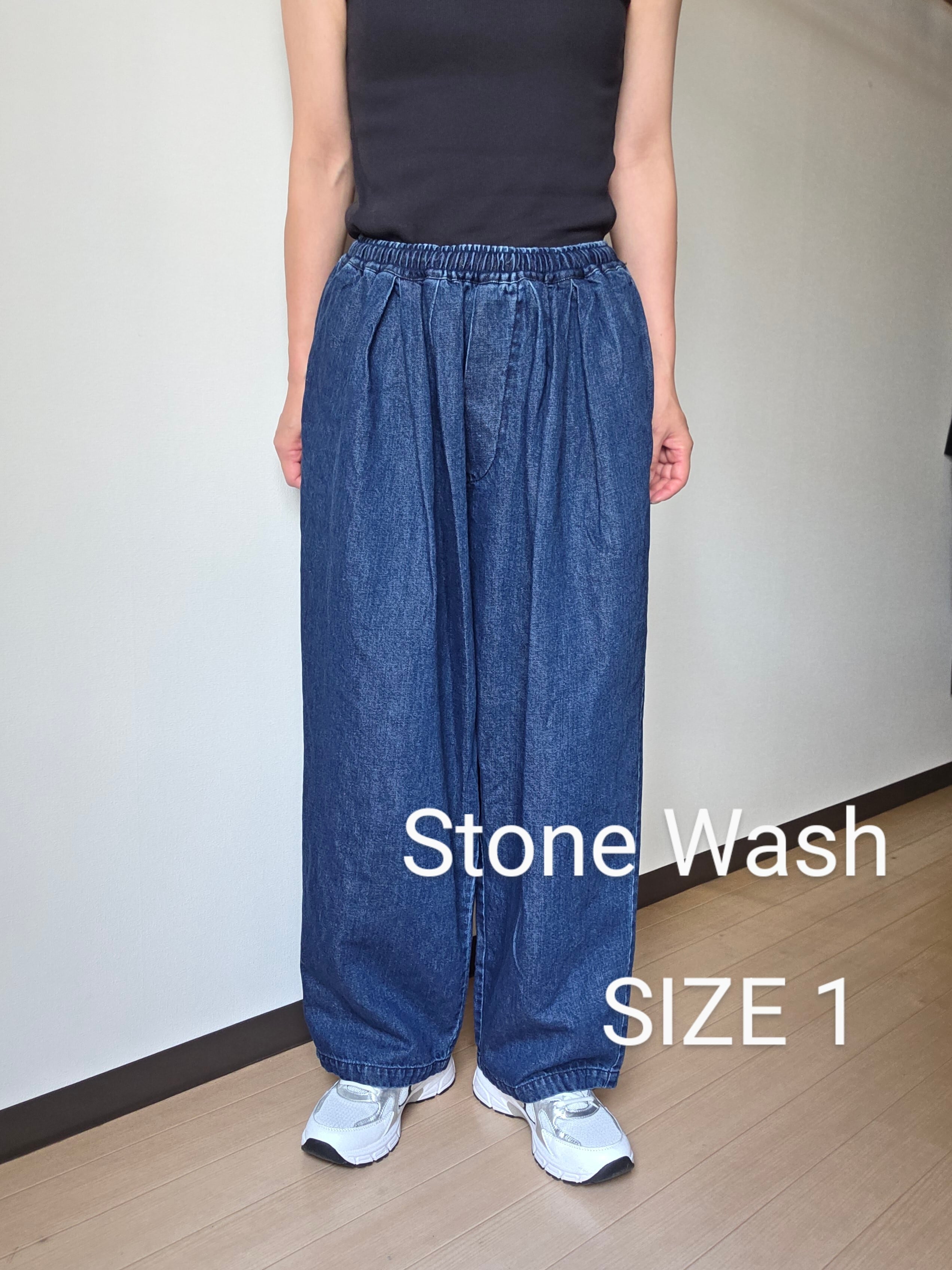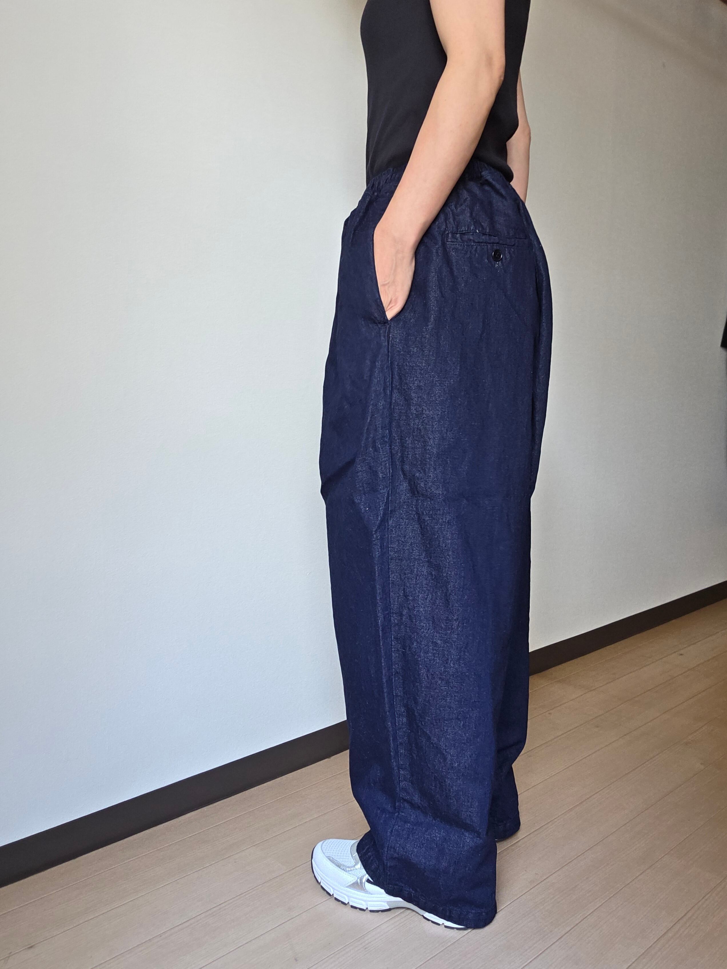 9.5ozのデニムを使用し、フロントに大きくボリュームをとり、ヒップにもゆとりを持たせたテーパードシルエット。ウエストはゴム+ひものイージー仕様です。