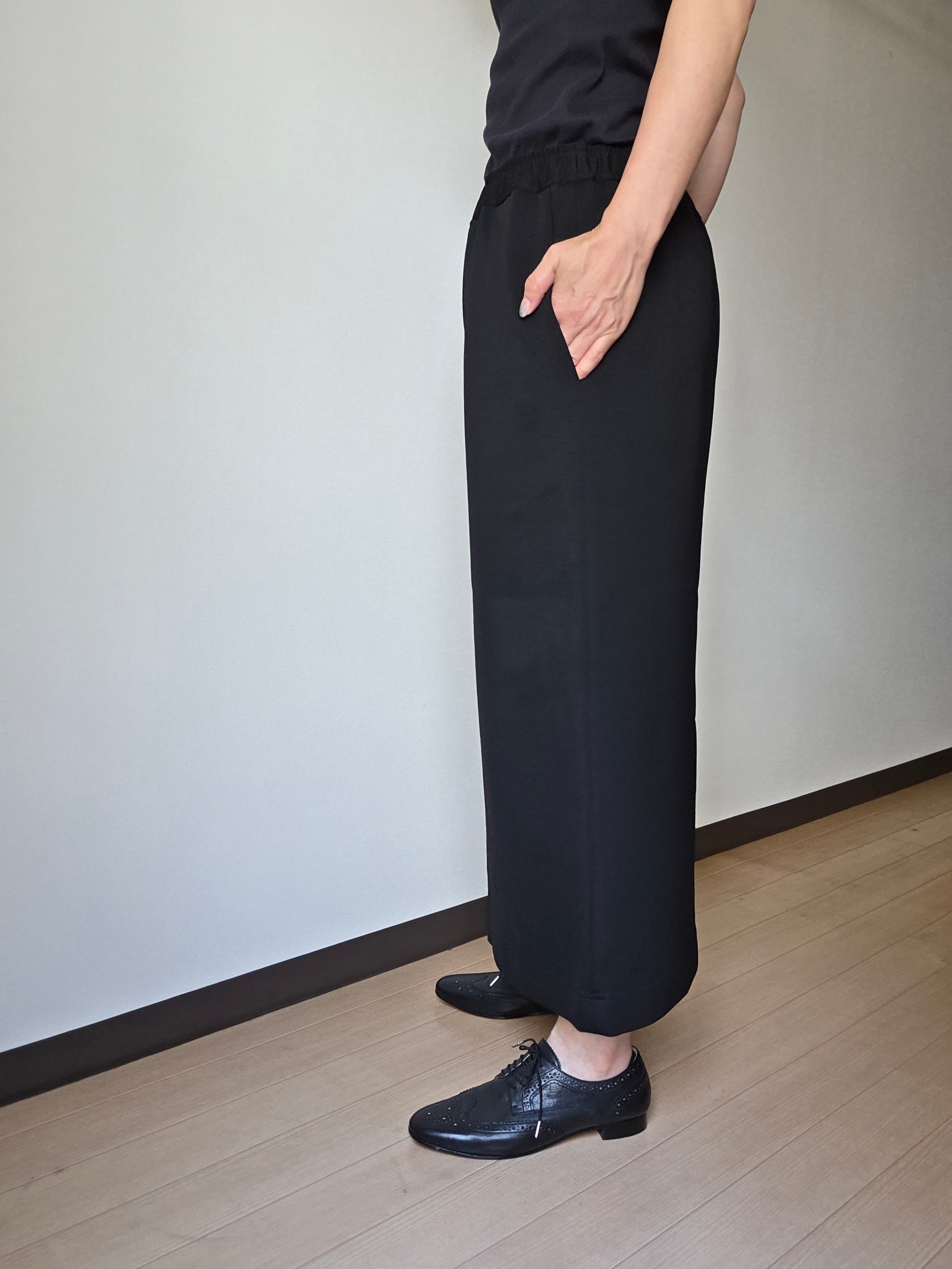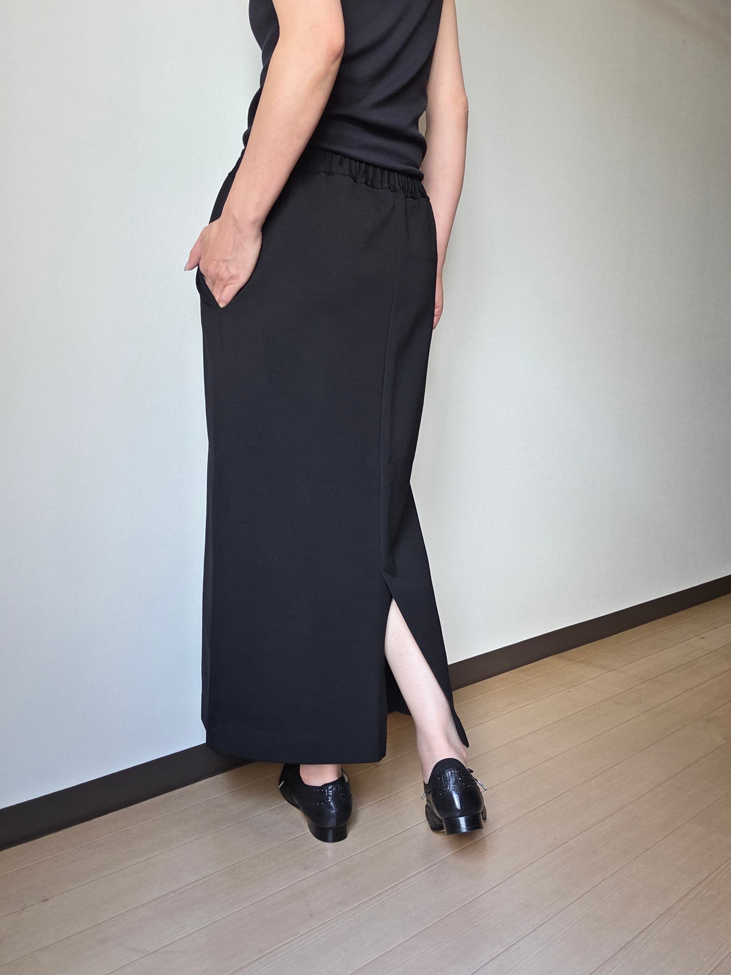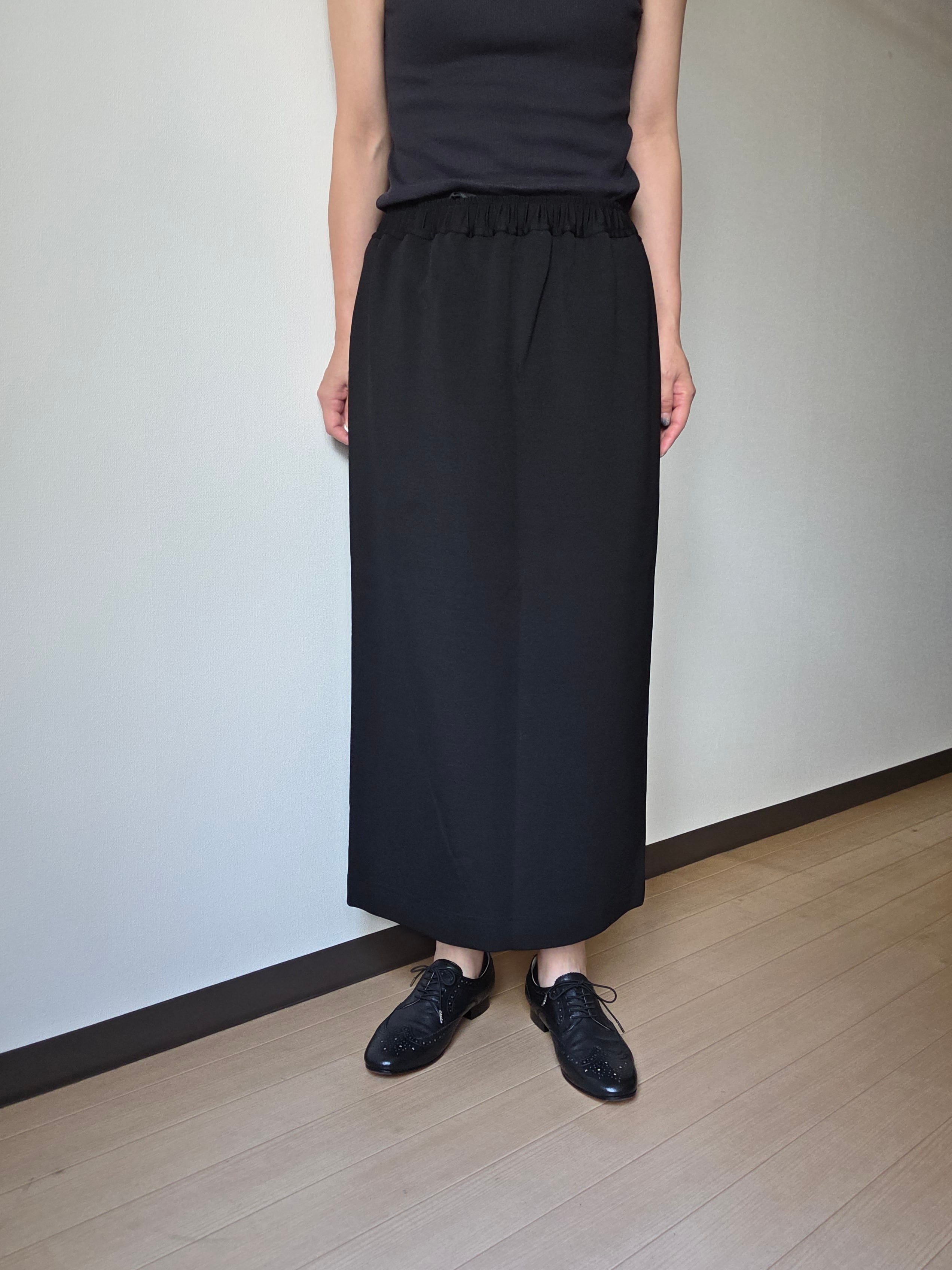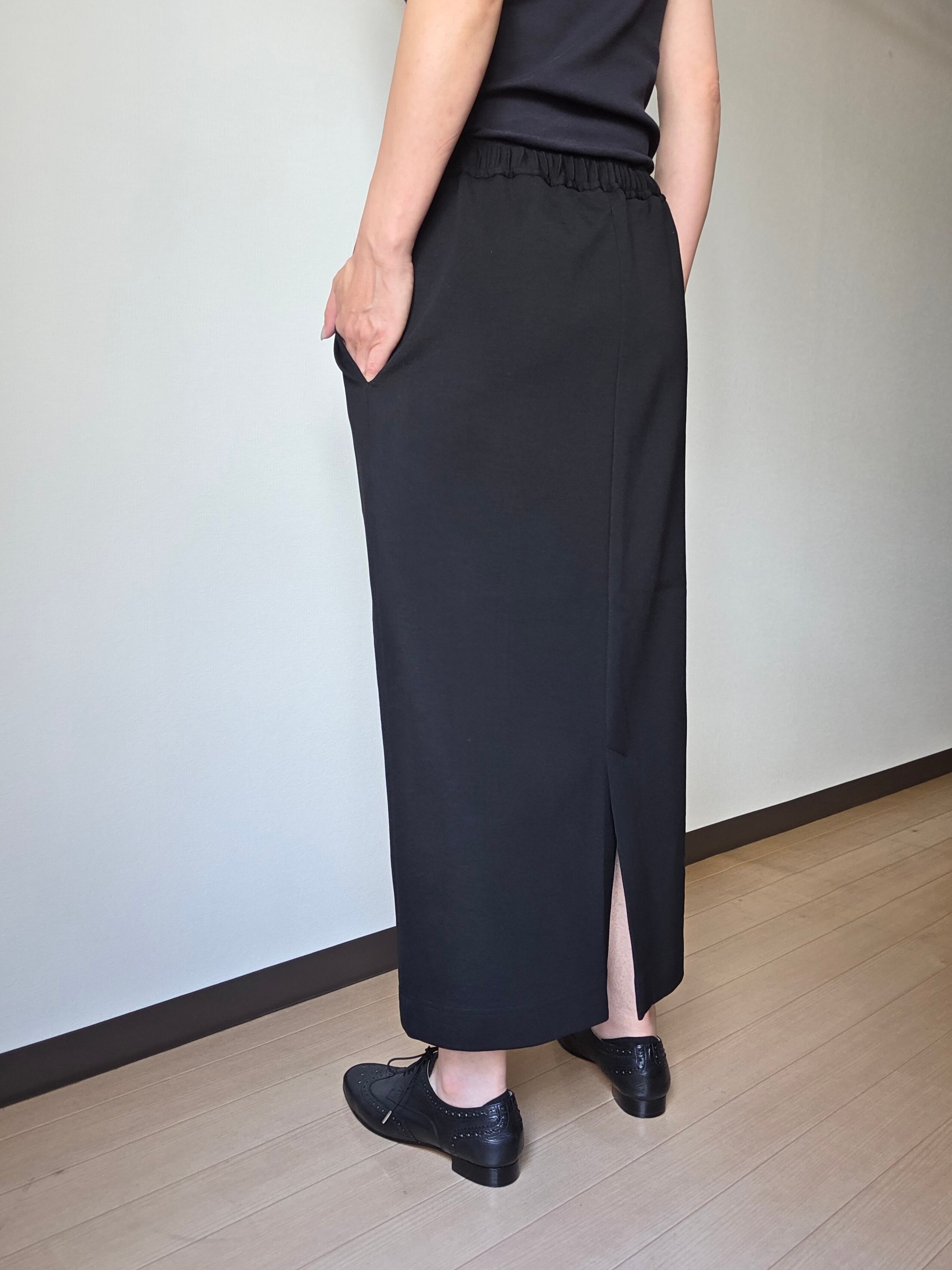 カジュアルなストレッチ素材のスカート。ウエストとヒップにややゆとりを持たせ、裾に向かって緩やかに細くなる I ラインシルエット。
