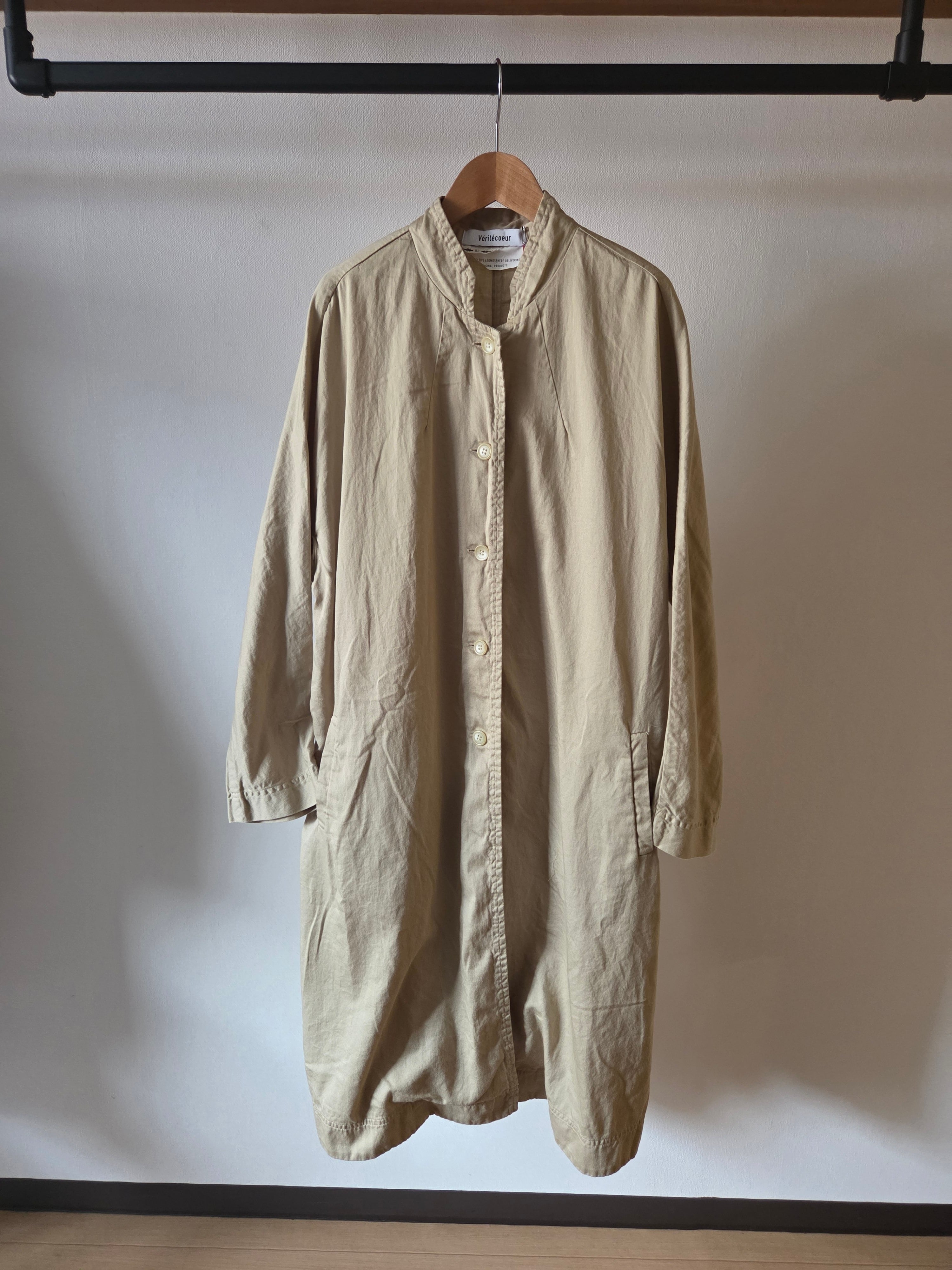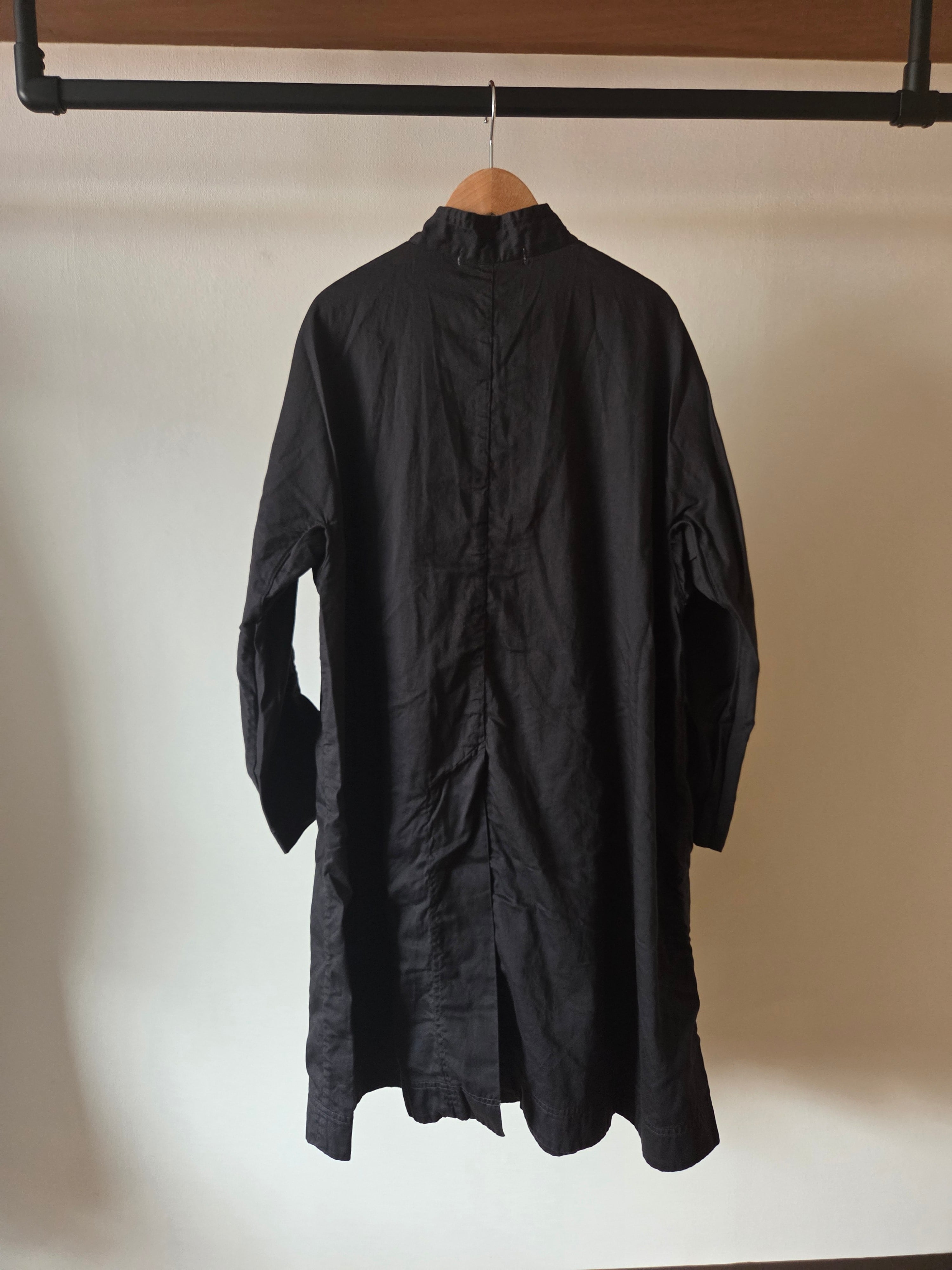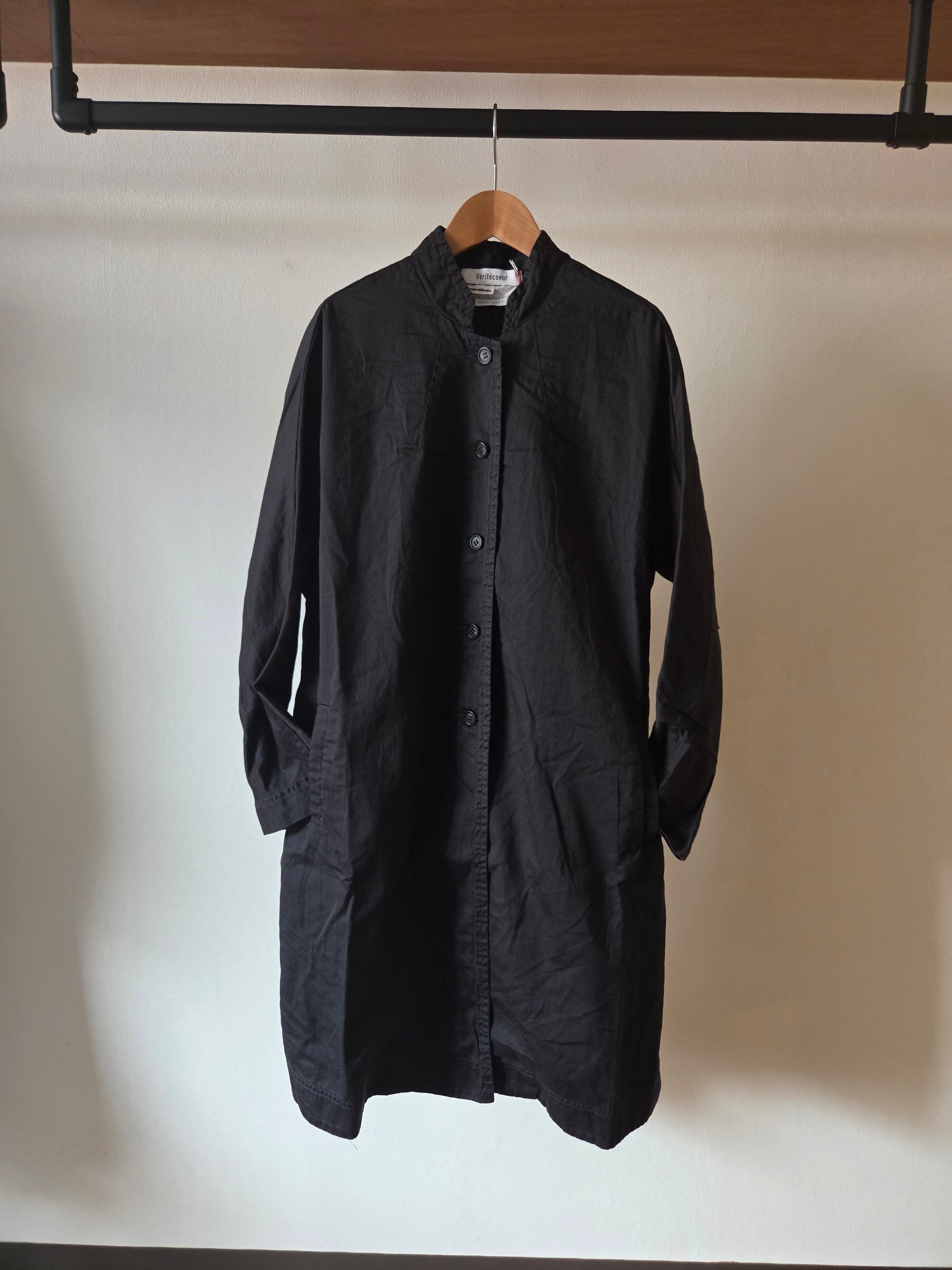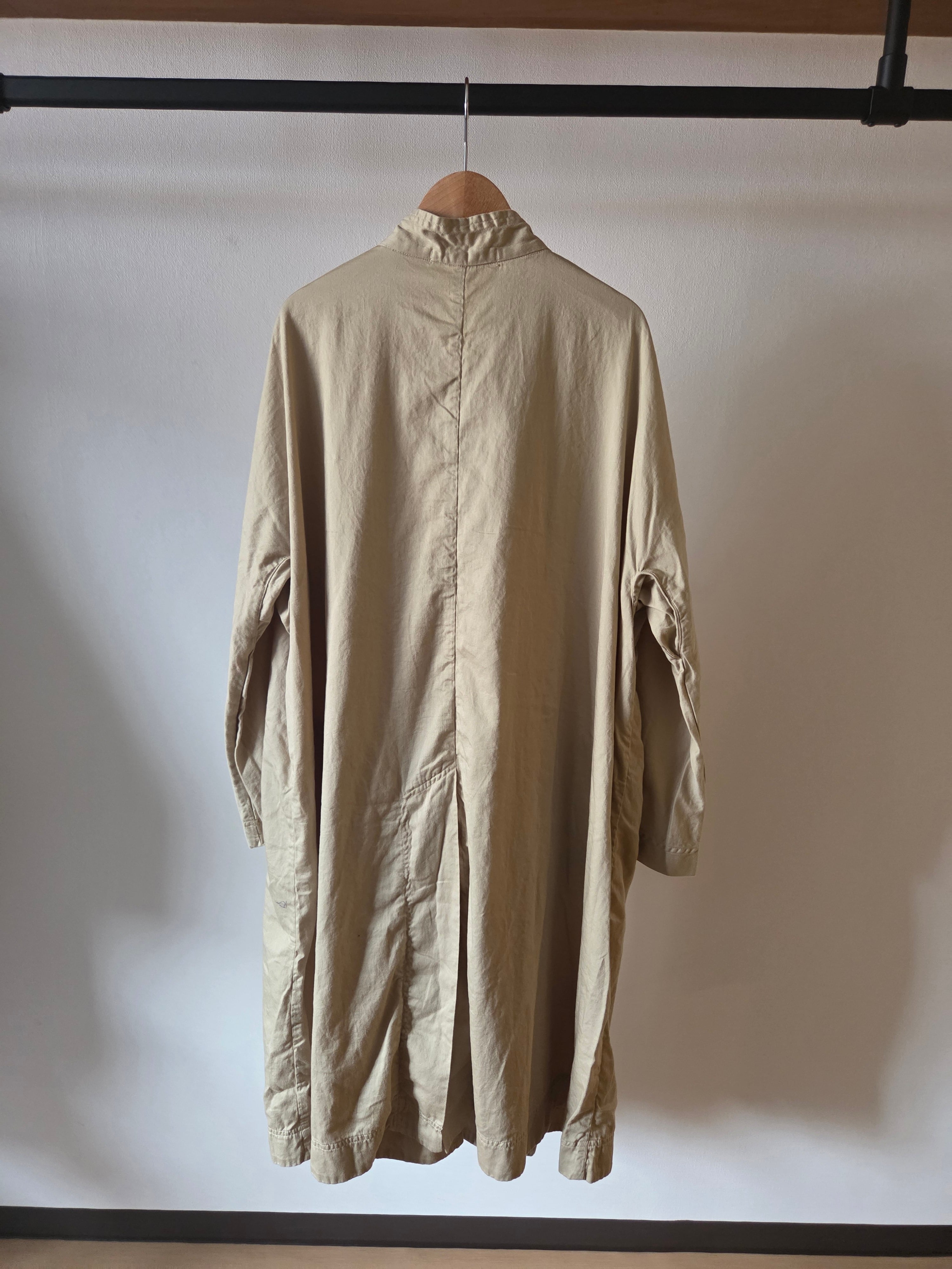 袖の付け根に切り替えがなく、手を広げると矢の様なラインになる事から名付けられたアローコート。着て頂くと生地が肩に沿い、綺麗なシルエットを作ってくれます。後ろには深めのスリットが入っており、動きやすいデザインです。裏地のない軽い着心地で、アウターとしては季節の変わり目に丁度よい生地感です。寒い季節には、室内での羽織りにおすすめです。色違いで揃えても重宝する1着です。 今回より袖巾を広げ、肩回りにゆとりを追加しました。