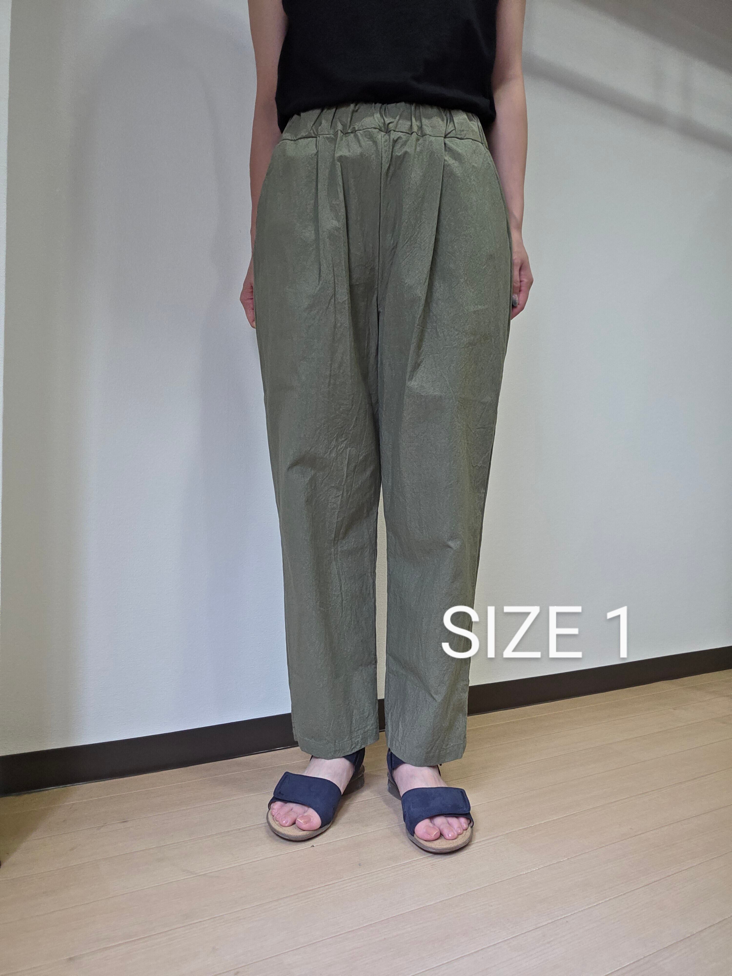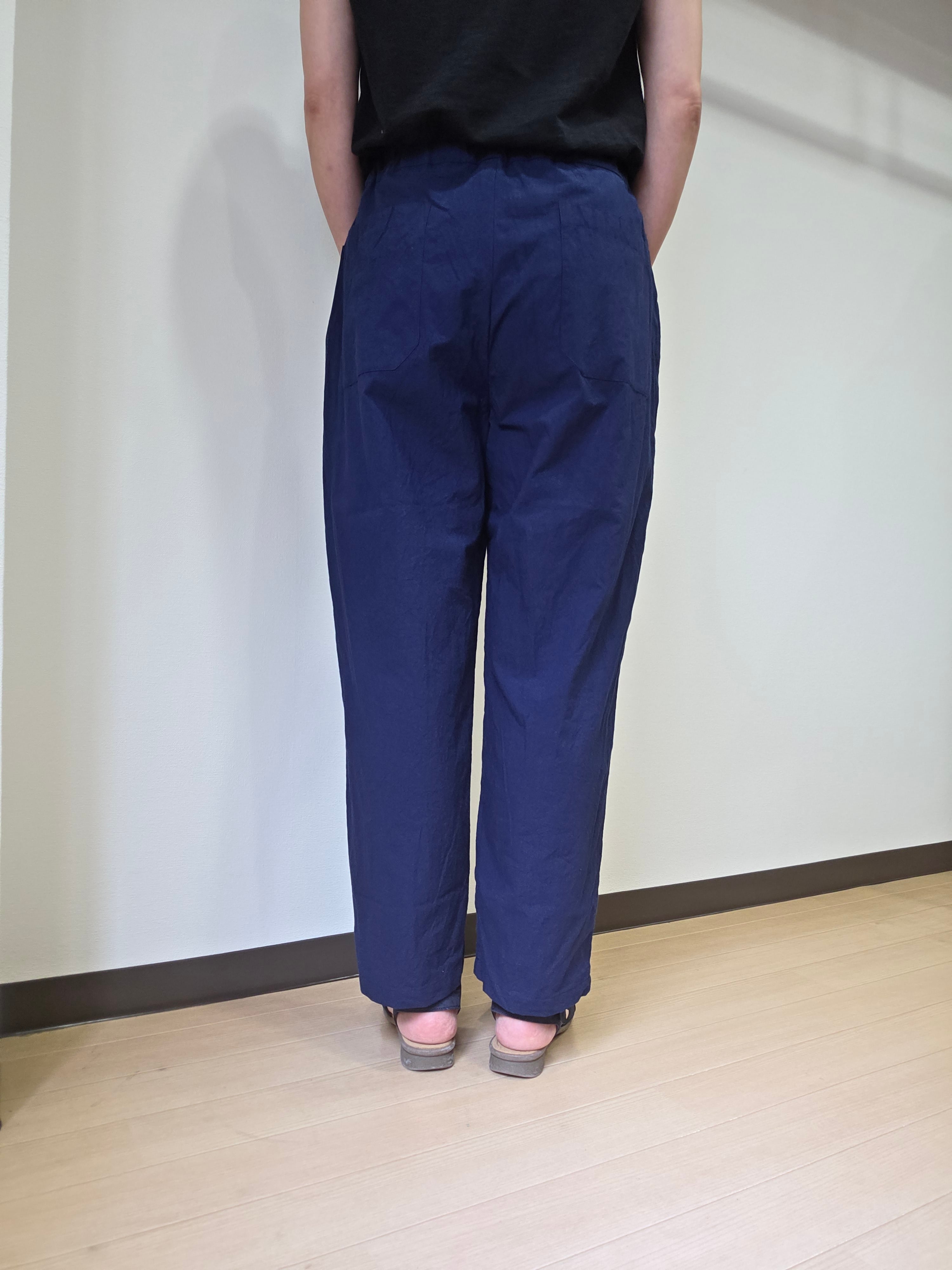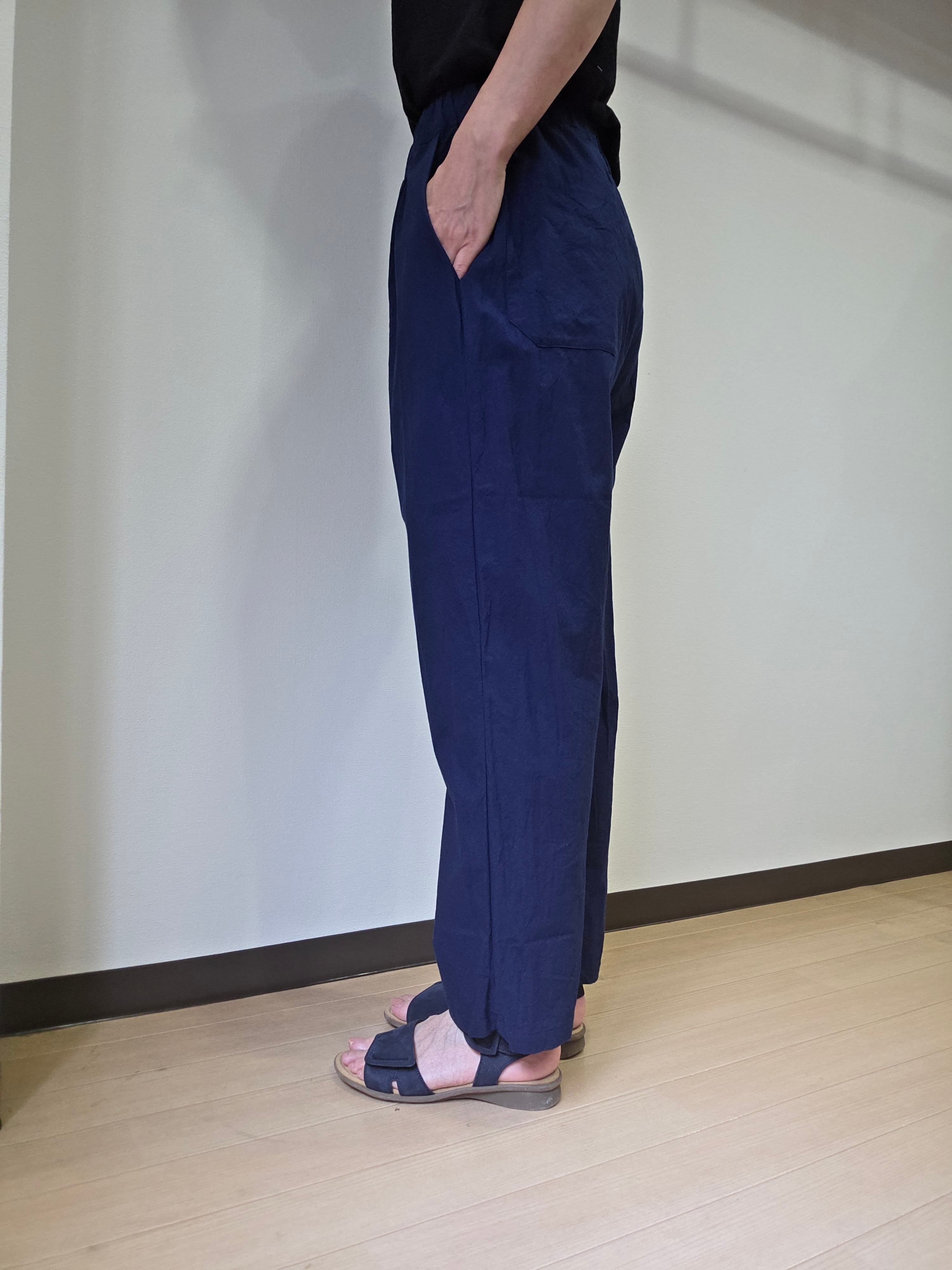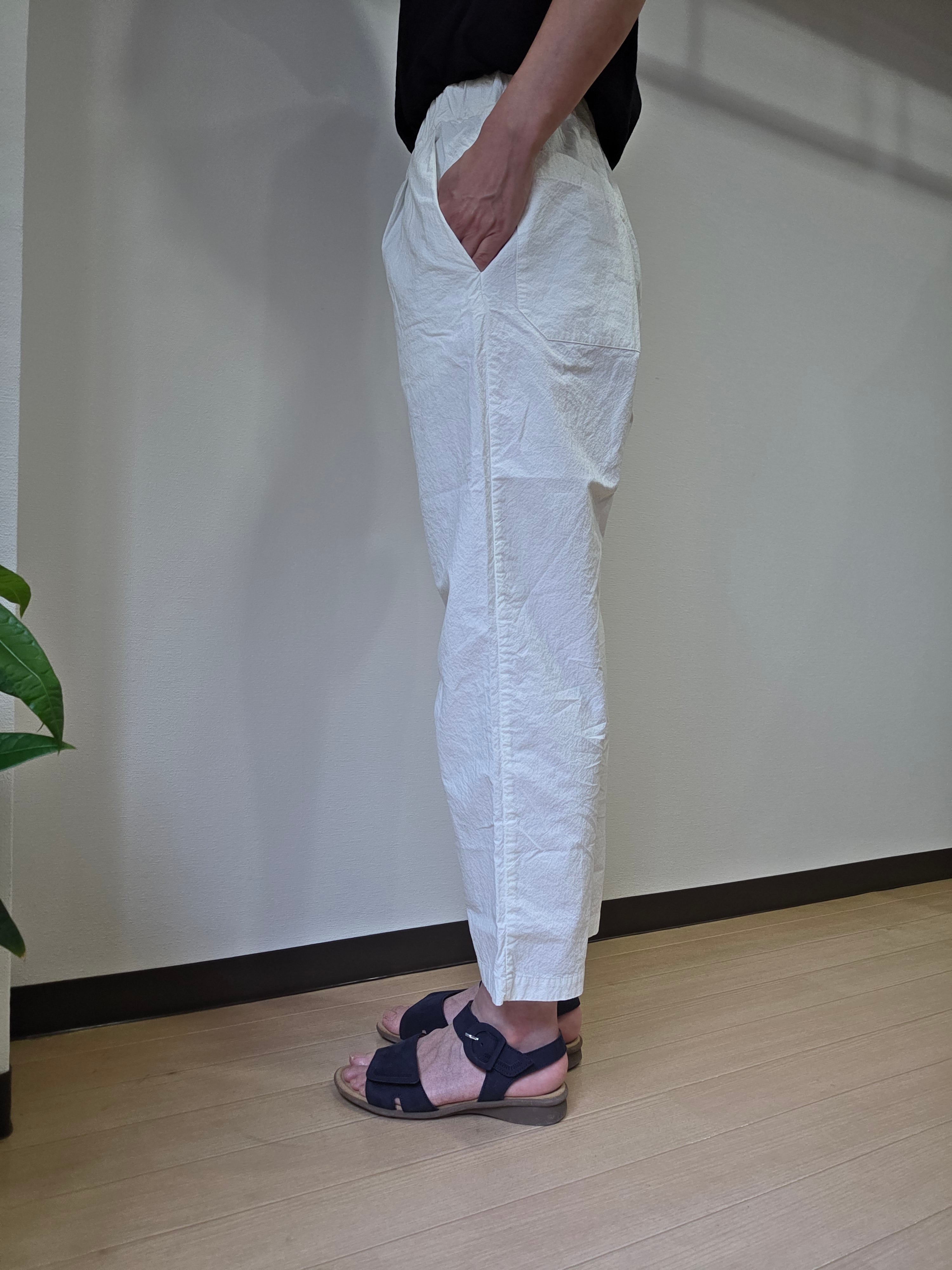 コットン100%の生地を使用したパンツです。生地には、クロスワッシャー加工が施され、洗いざらしの様な自然なシワ感が心地よく魅力的です。ウエスト部分には、タックが入り表情あるシルエットを形成します。ウエストは、ゴムと紐で調節可能です。軽やかな穿き心地で、ワンピースやチュニックのインナーパンツとしてもおすすめです。
