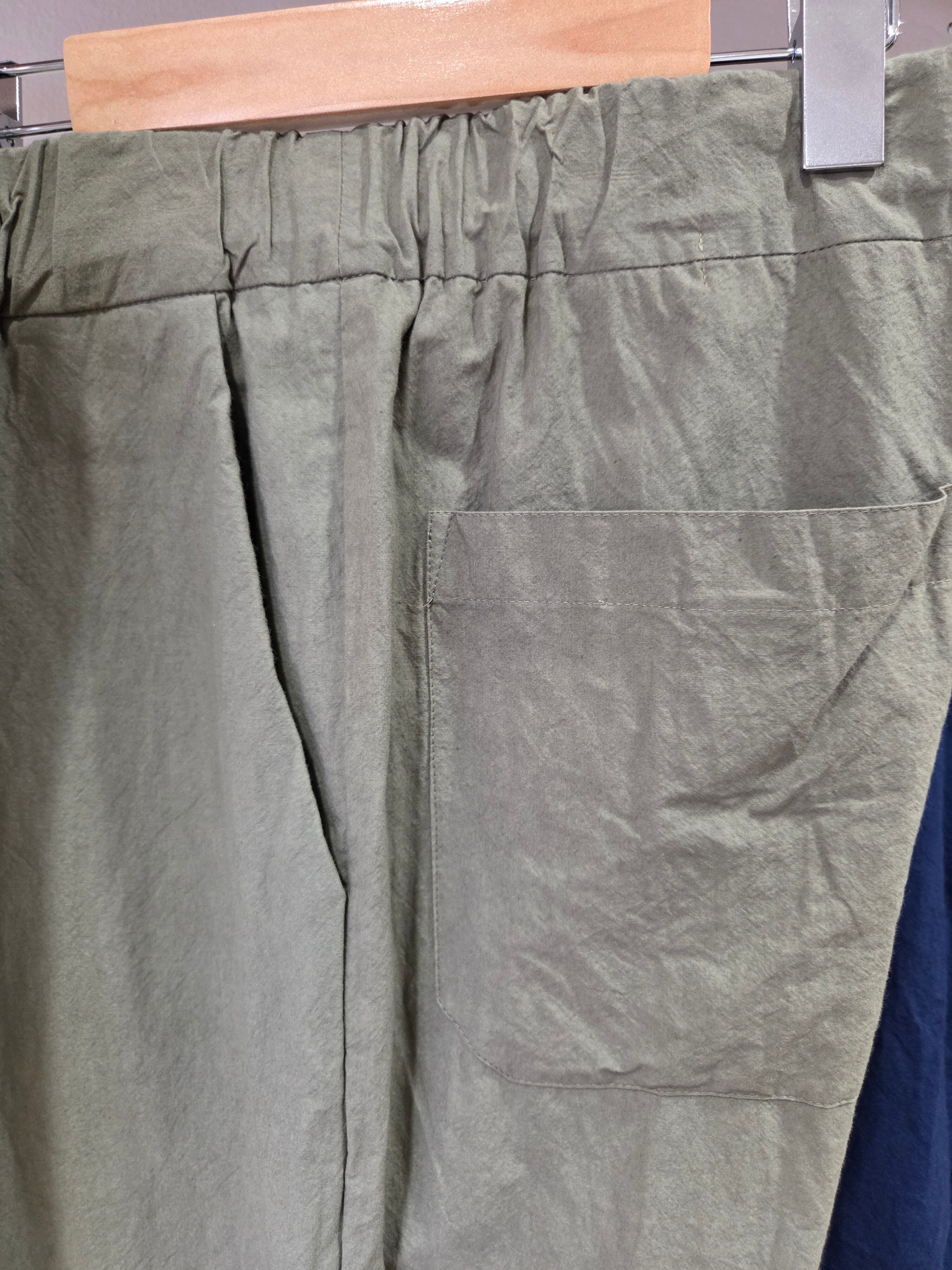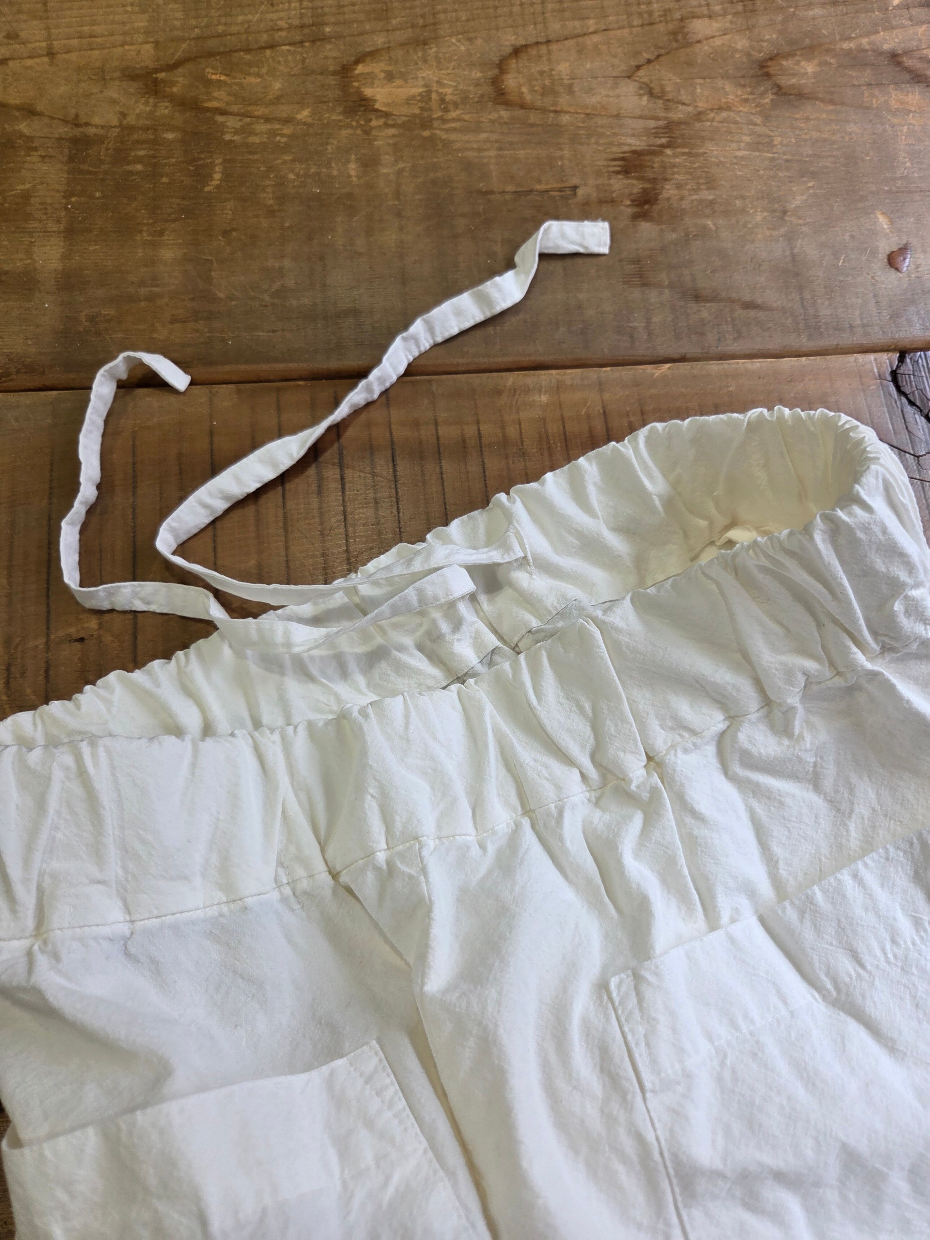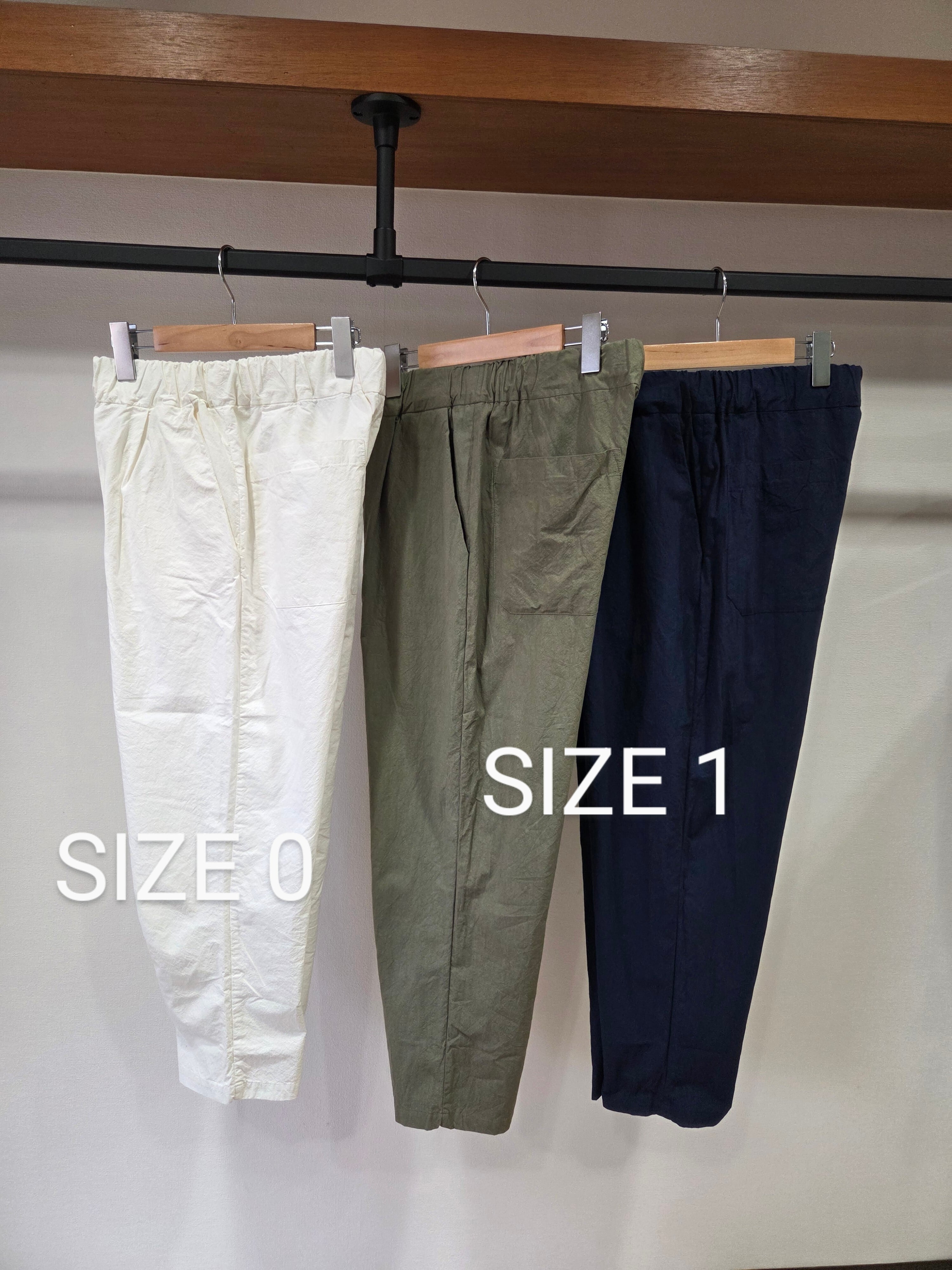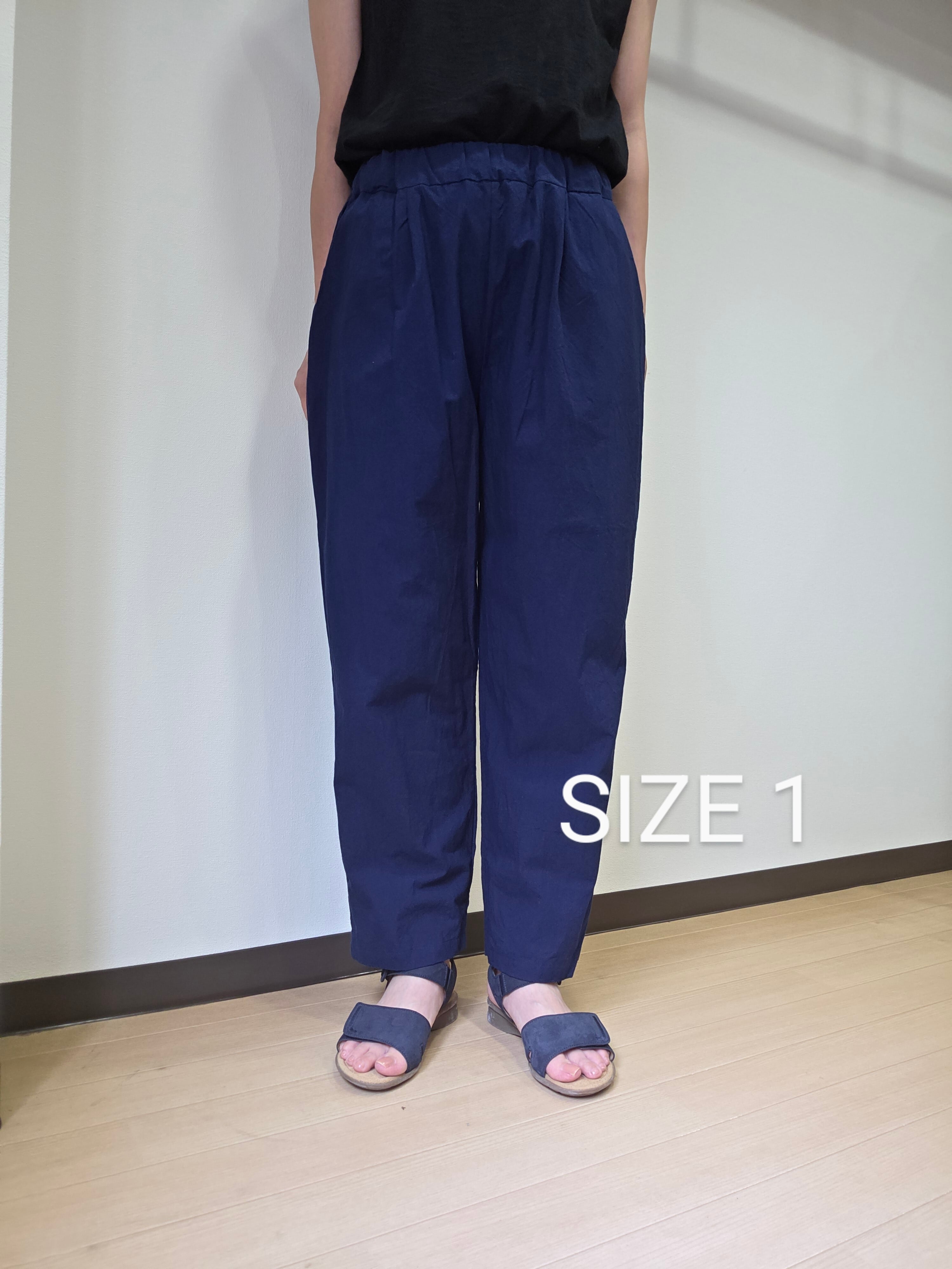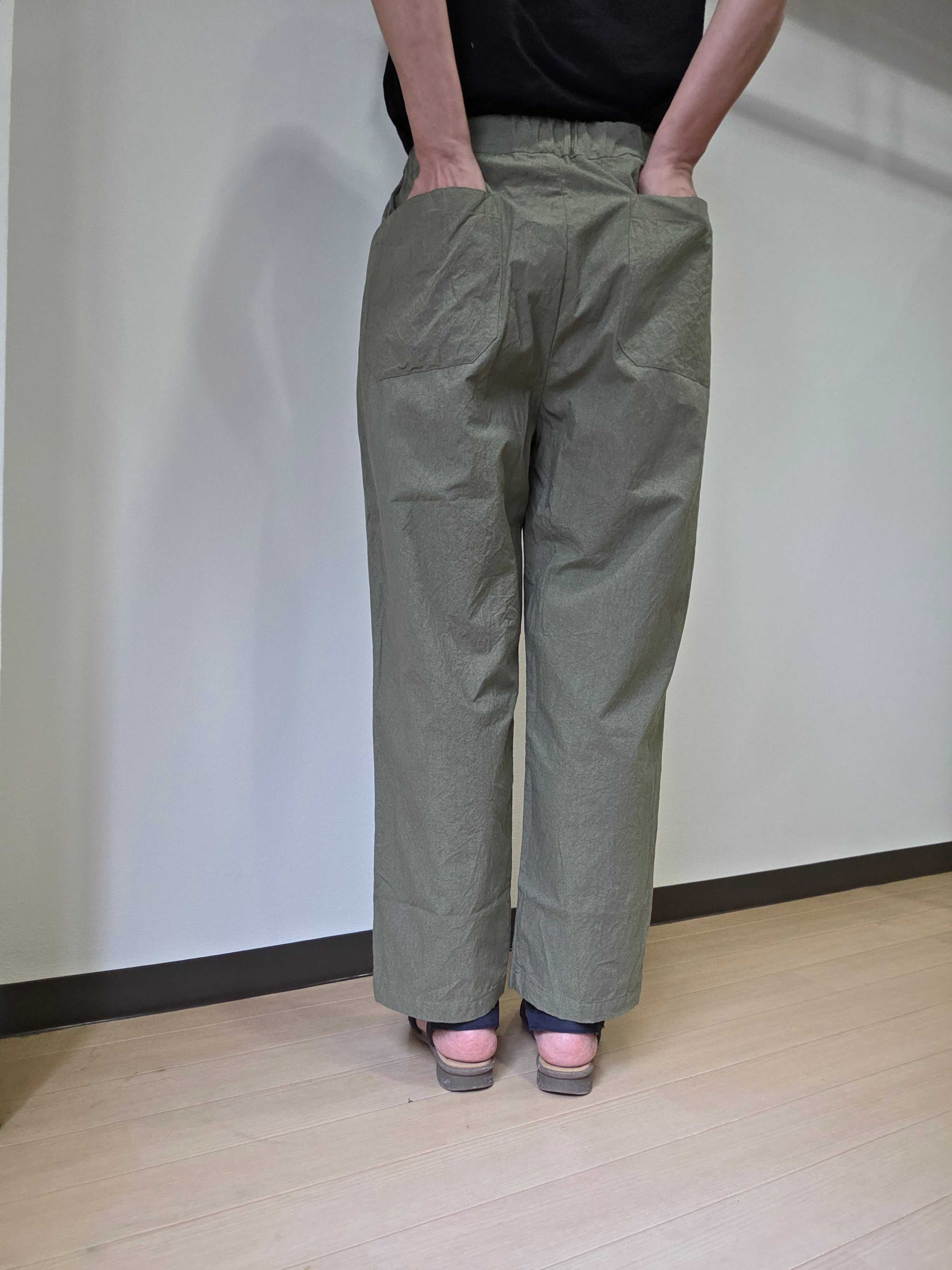 コットン100%の生地を使用したパンツです。生地には、クロスワッシャー加工が施され、洗いざらしの様な自然なシワ感が心地よく魅力的です。ウエスト部分には、タックが入り表情あるシルエットを形成します。ウエストは、ゴムと紐で調節可能です。軽やかな穿き心地で、ワンピースやチュニックのインナーパンツとしてもおすすめです。