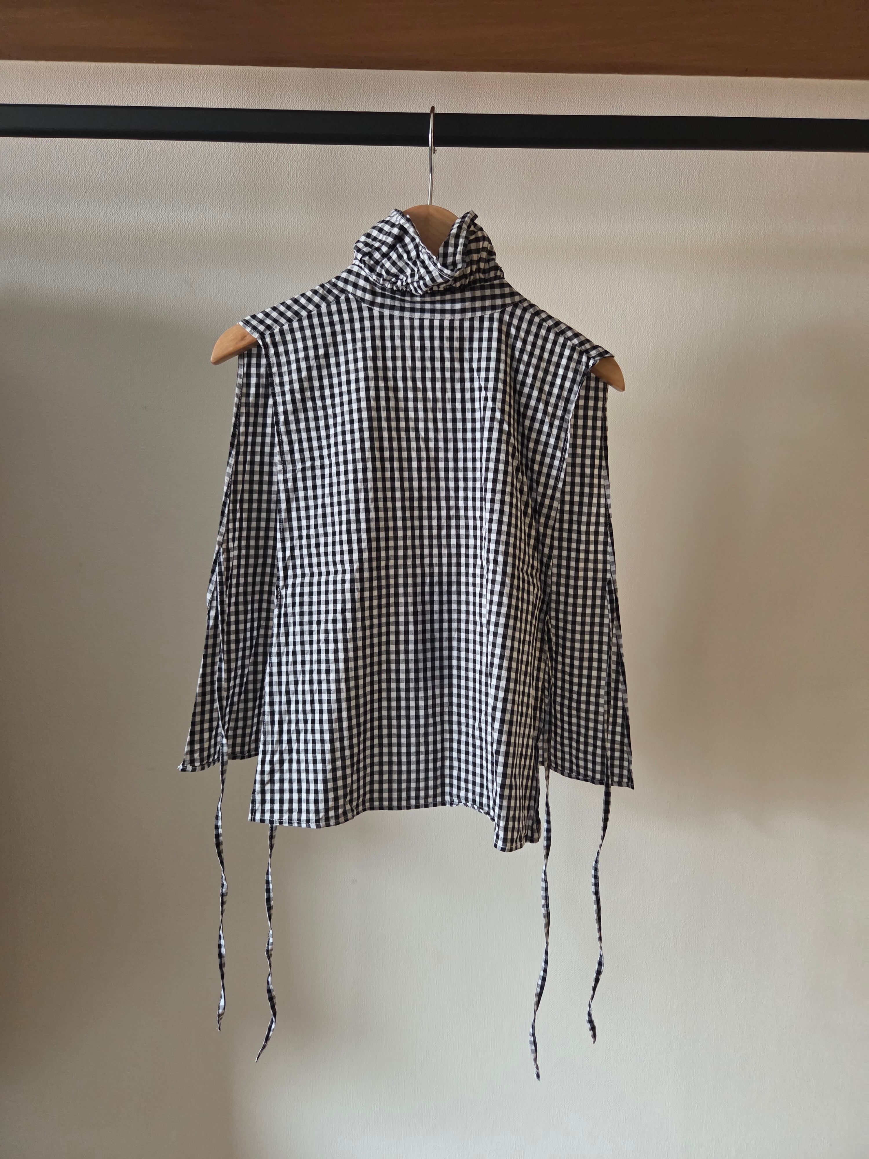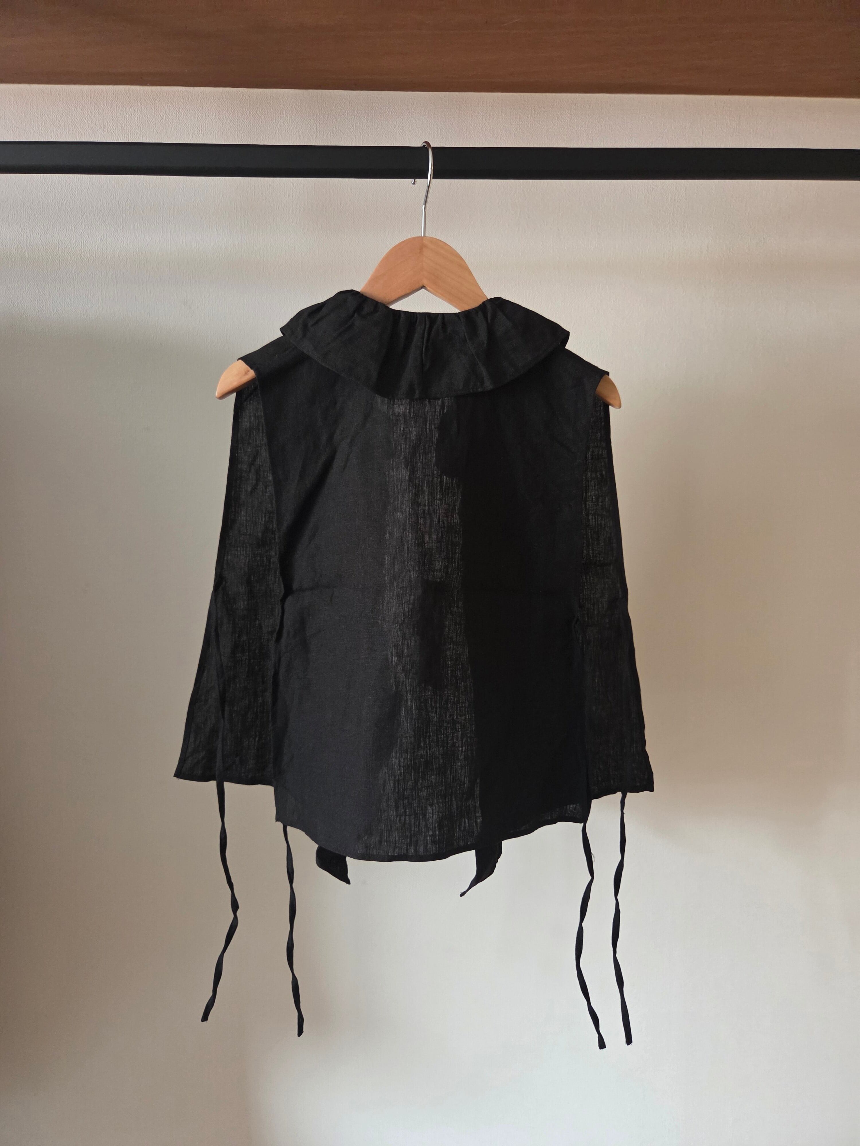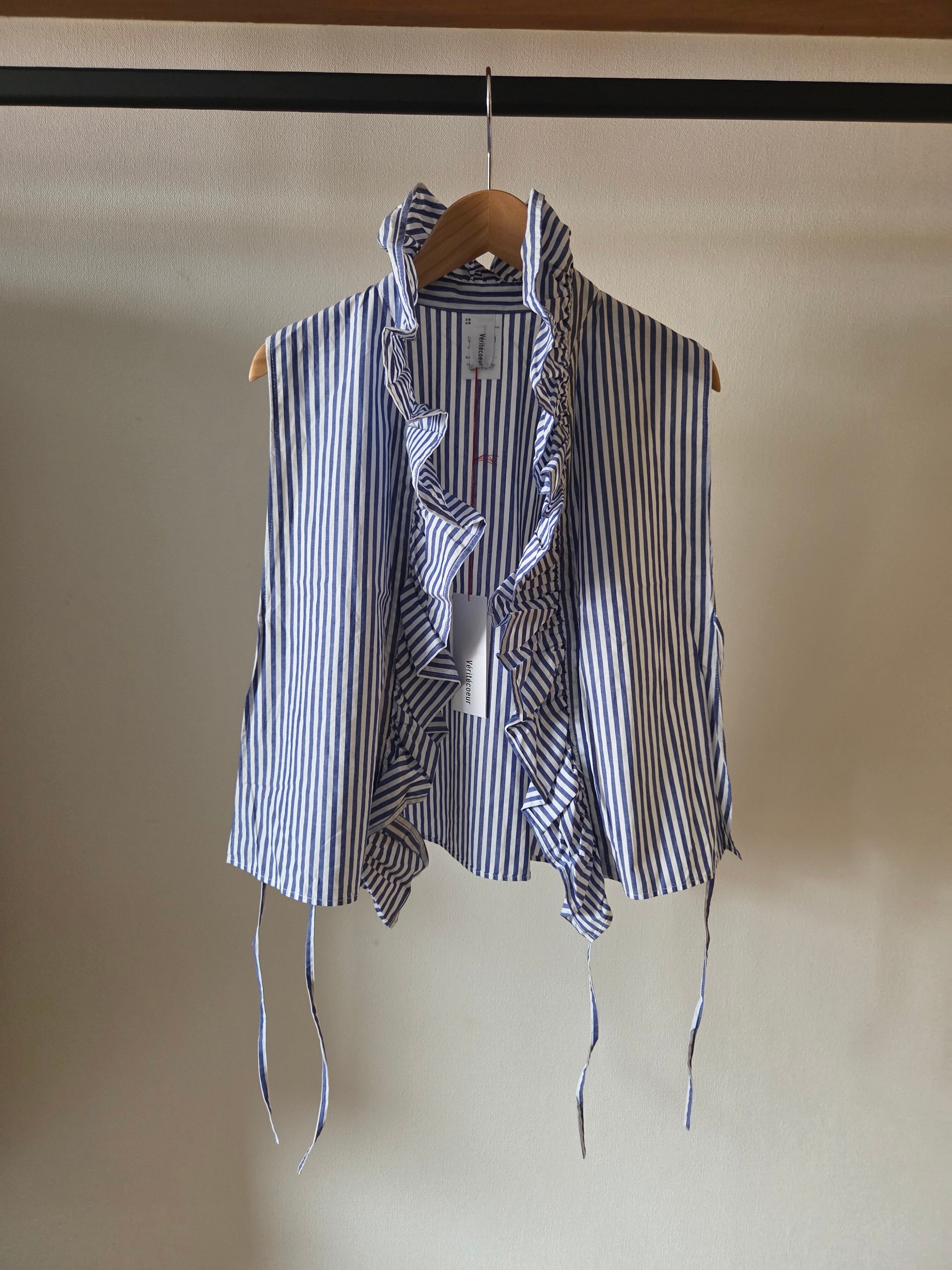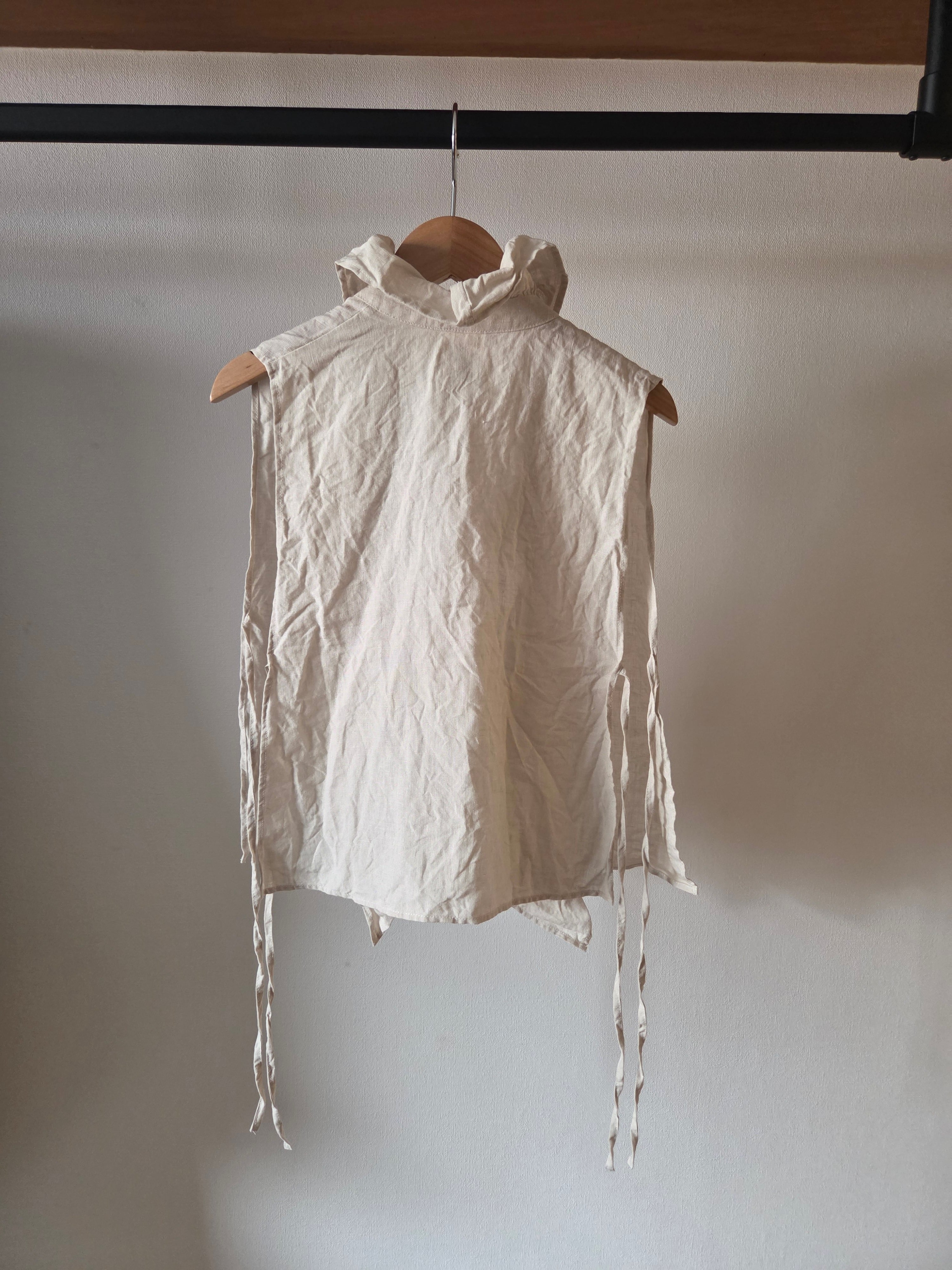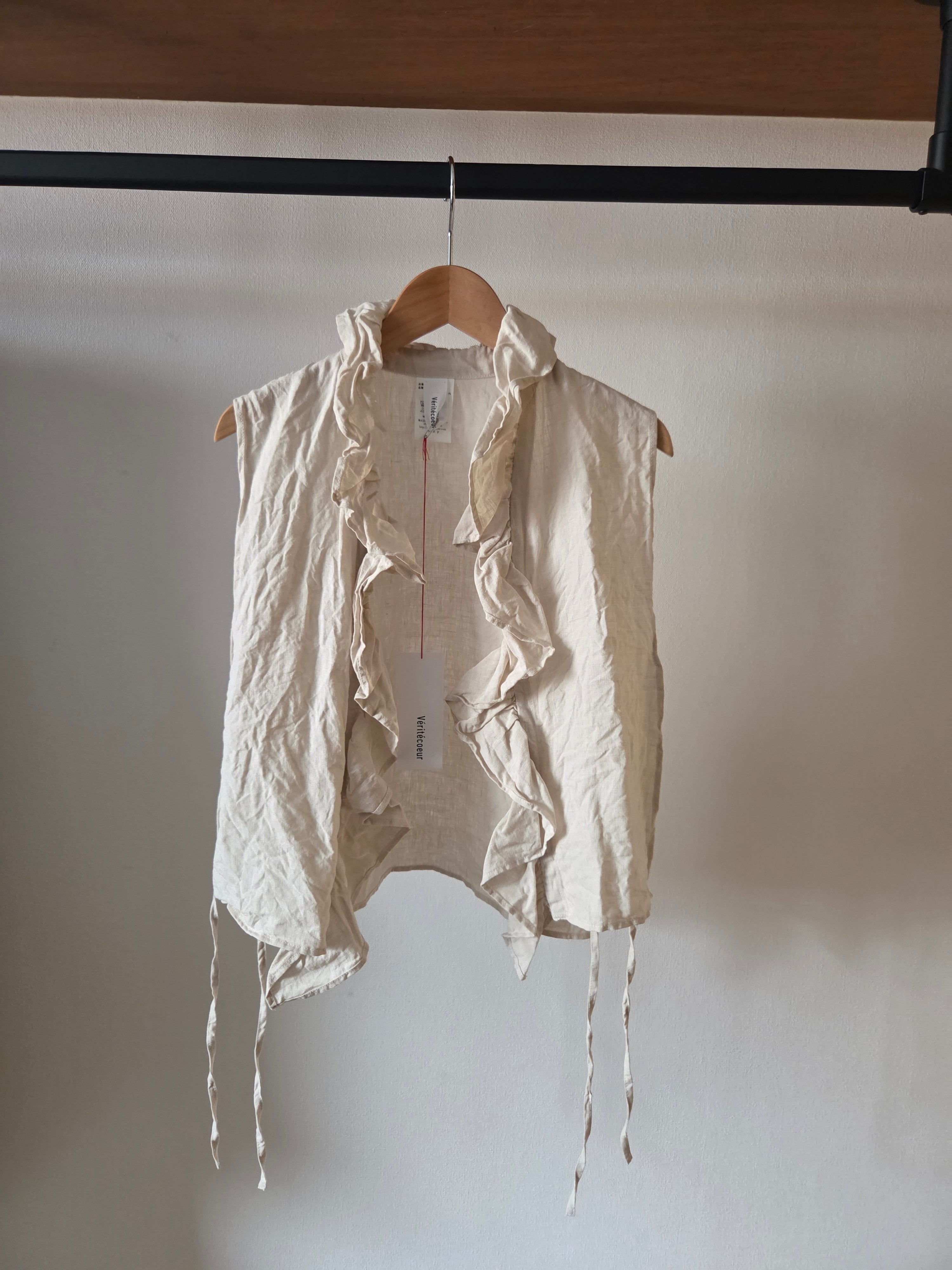 フリルカラーのベストです。脇が開いており、リボンで留めるデザインになっています。 身幅の広い服や袖の太いインナーにも合わせることができ、コーディネートの巾が広がる 1 着です。