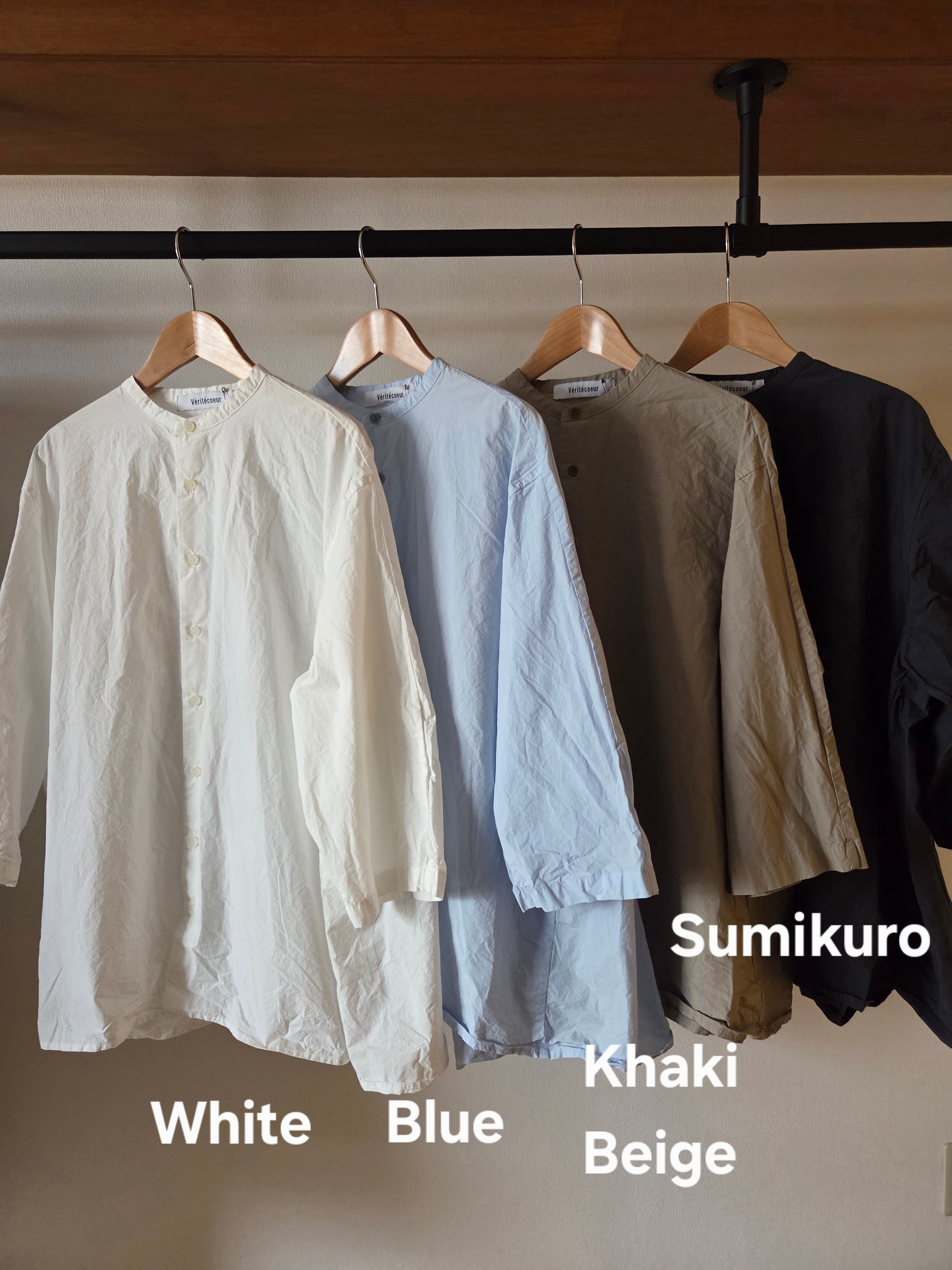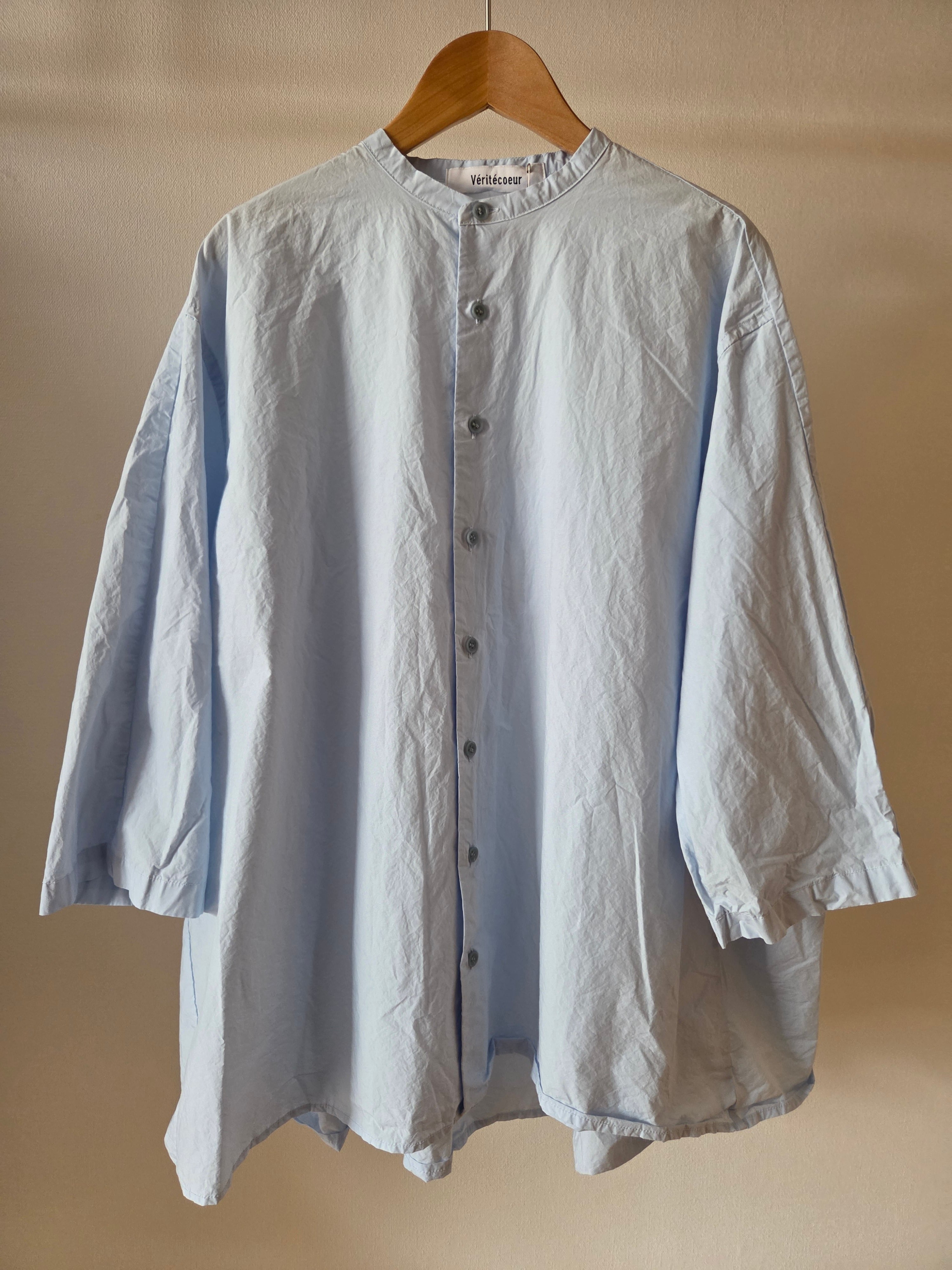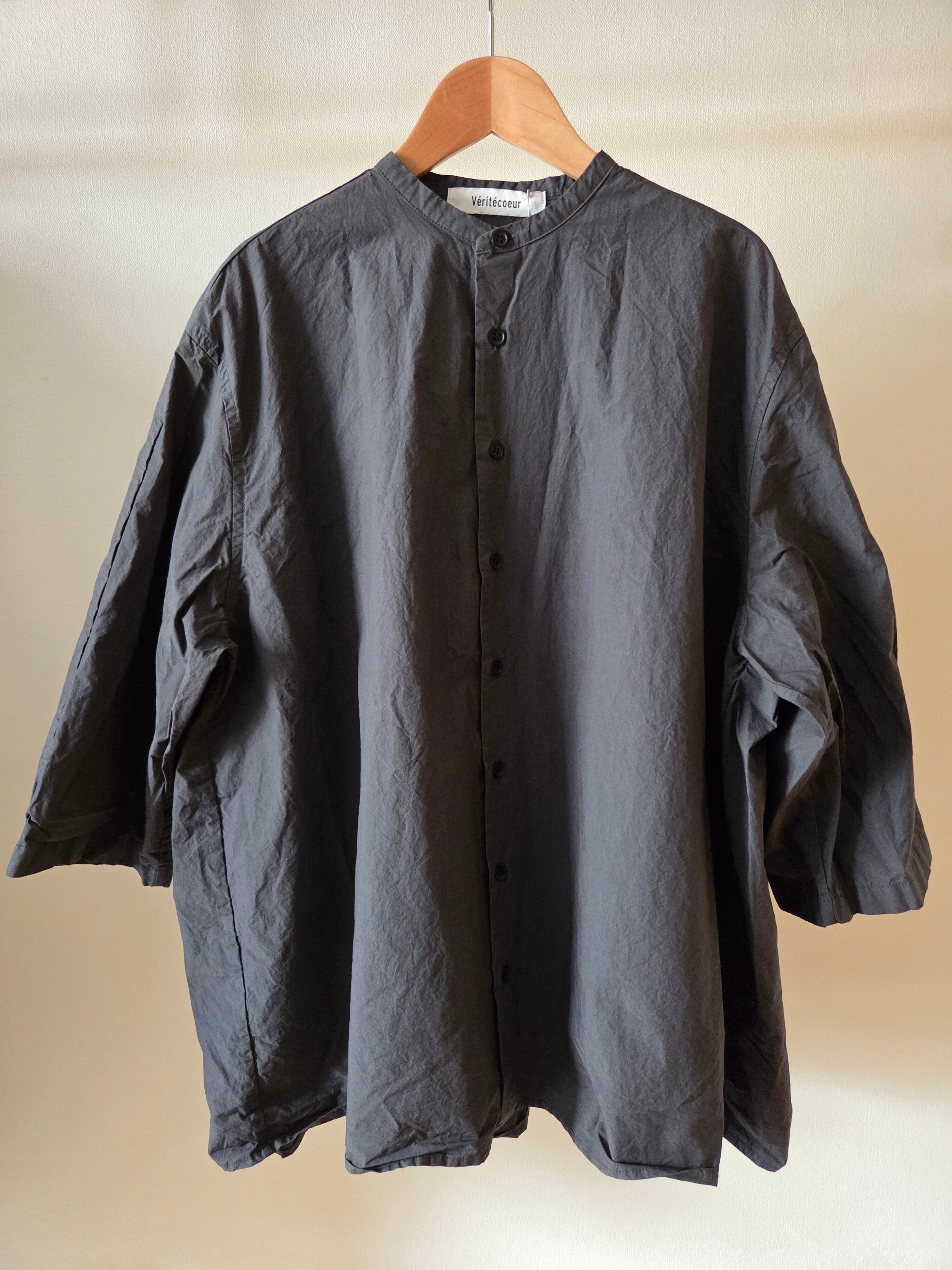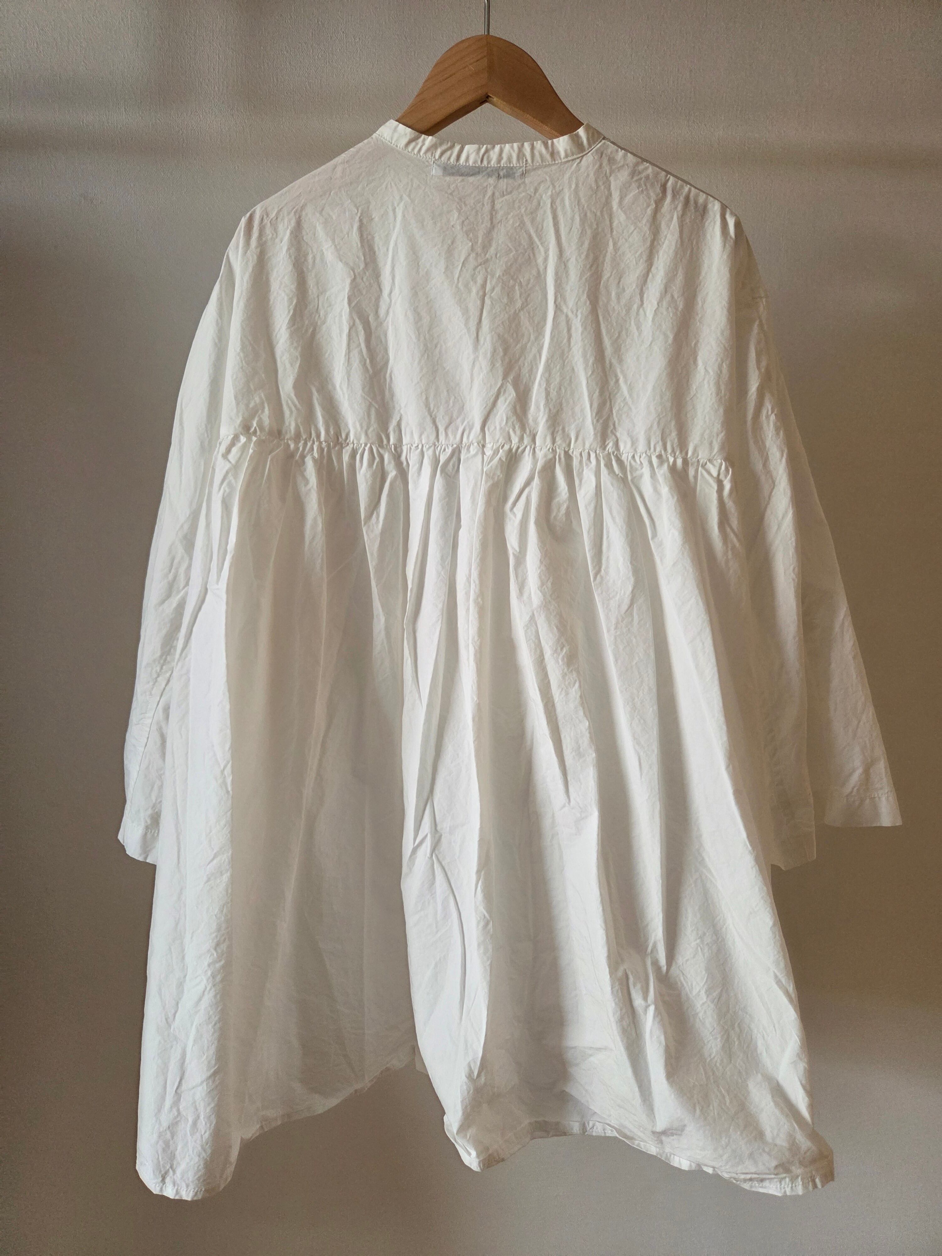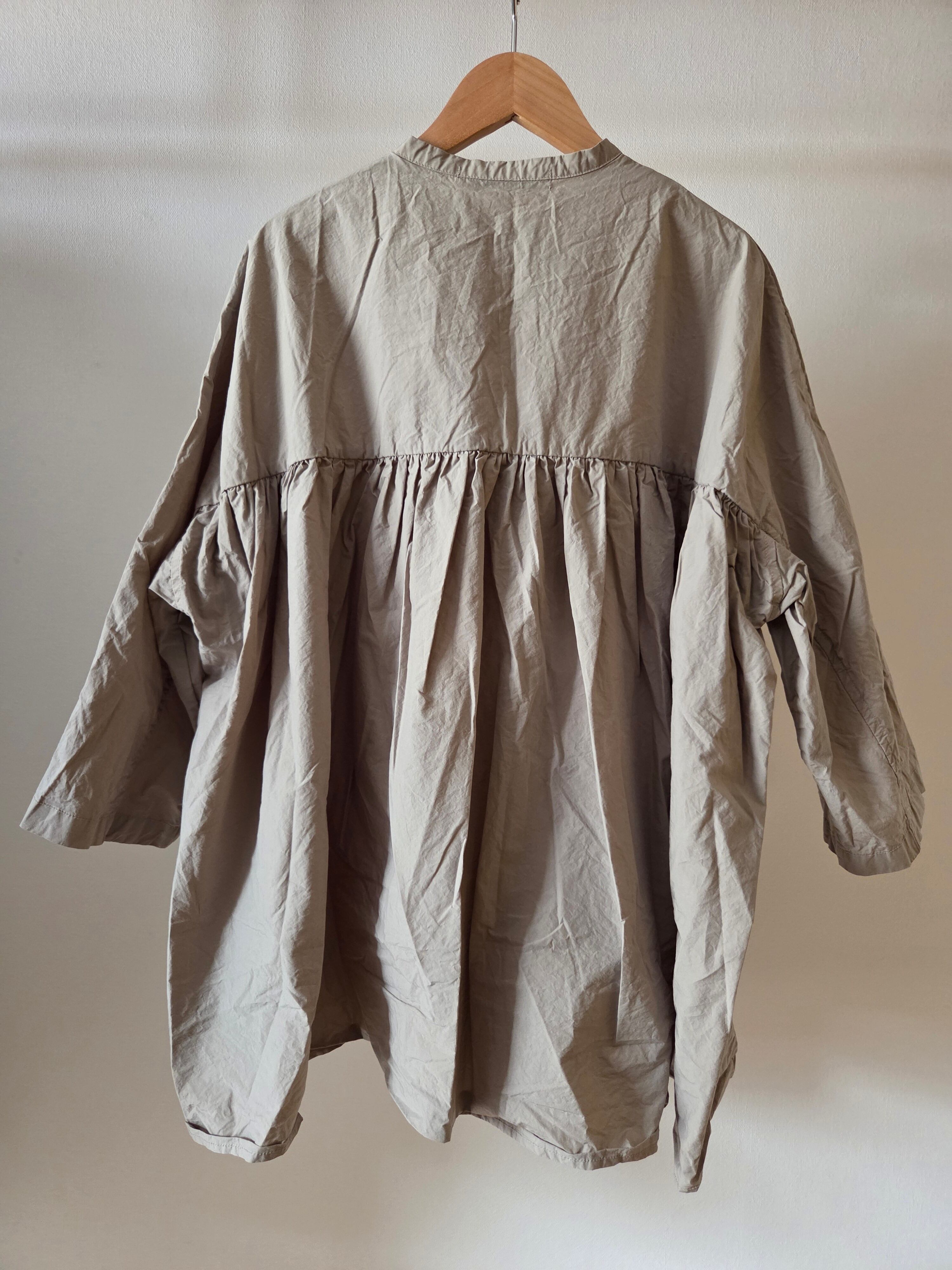 前身頃はシャツスリーブ、後身頃はギャザーの入ったヨークスリーブ。前から見るとシャツ、後ろから見るとチュニックのようなデザインです。袖は七分袖でスッキリとした印象に。前ボタンですので、軽めの羽織物としても着て頂けます。