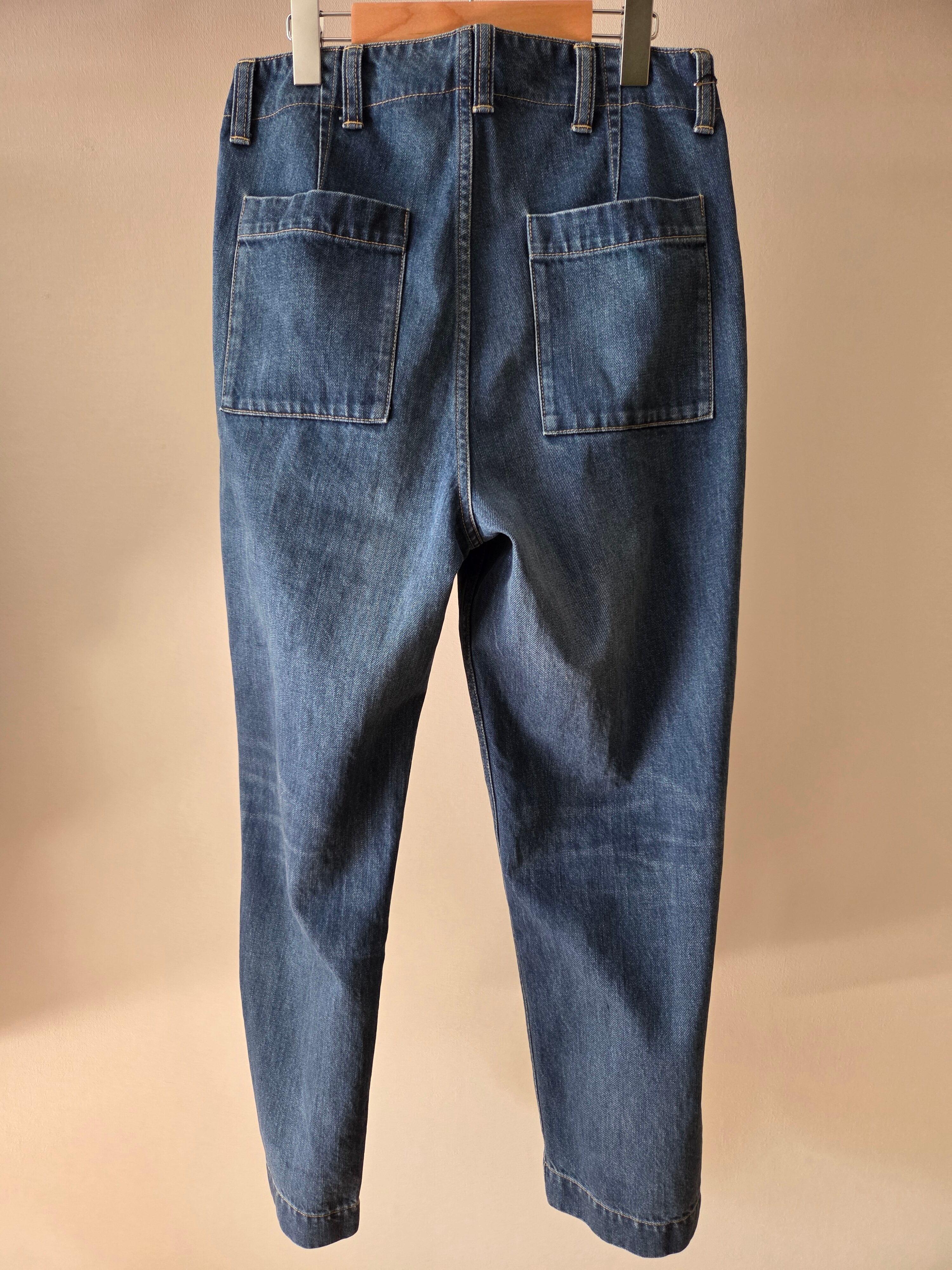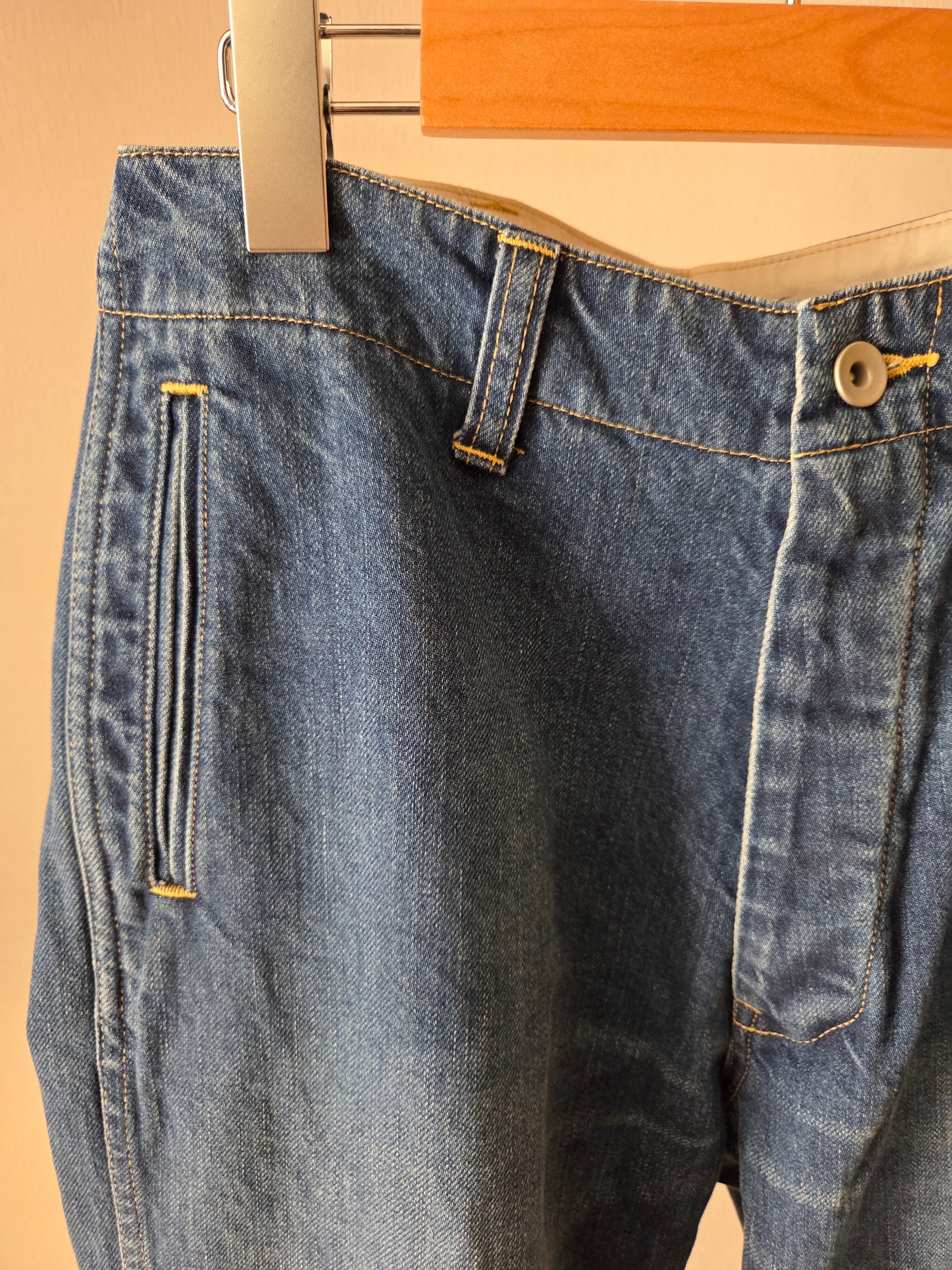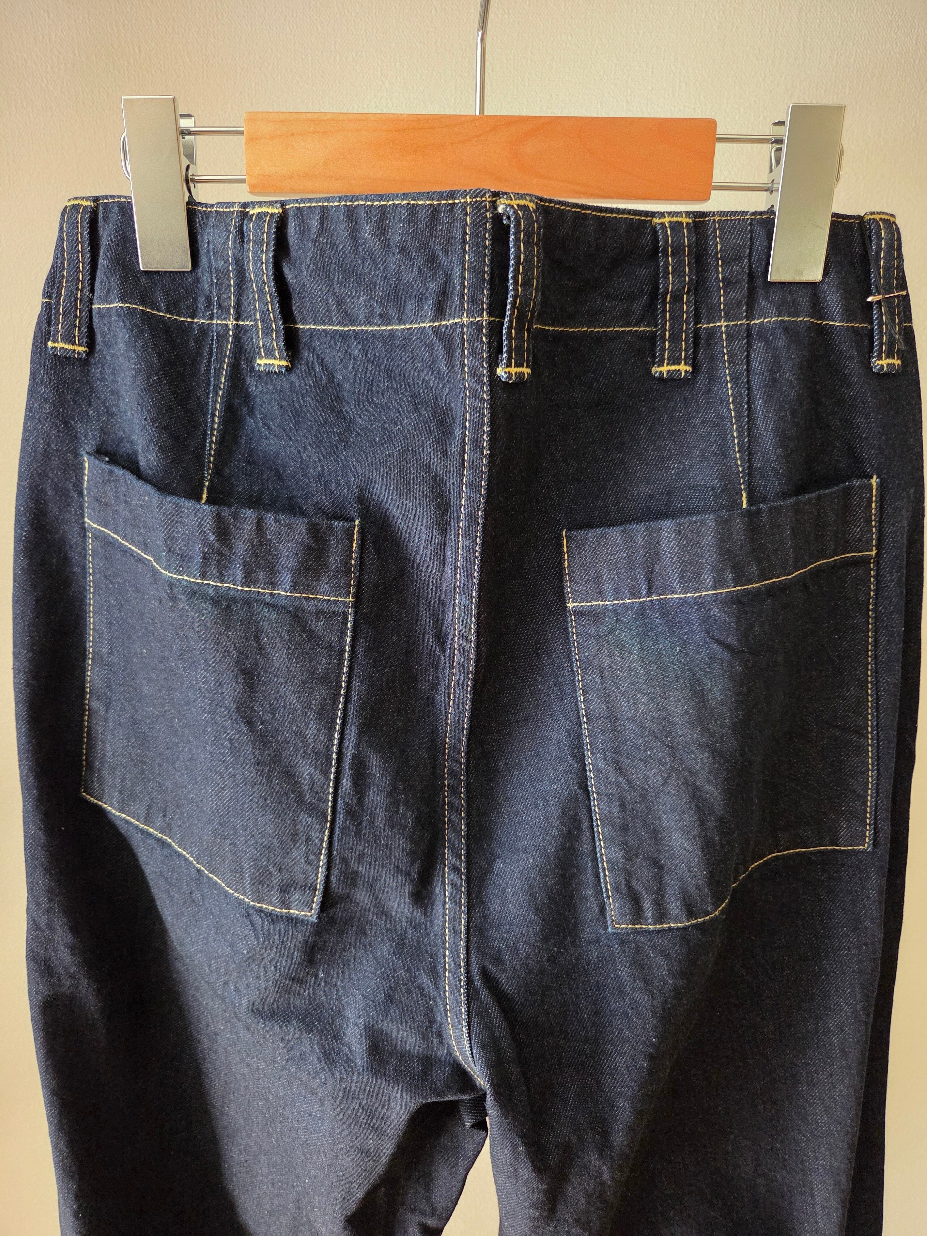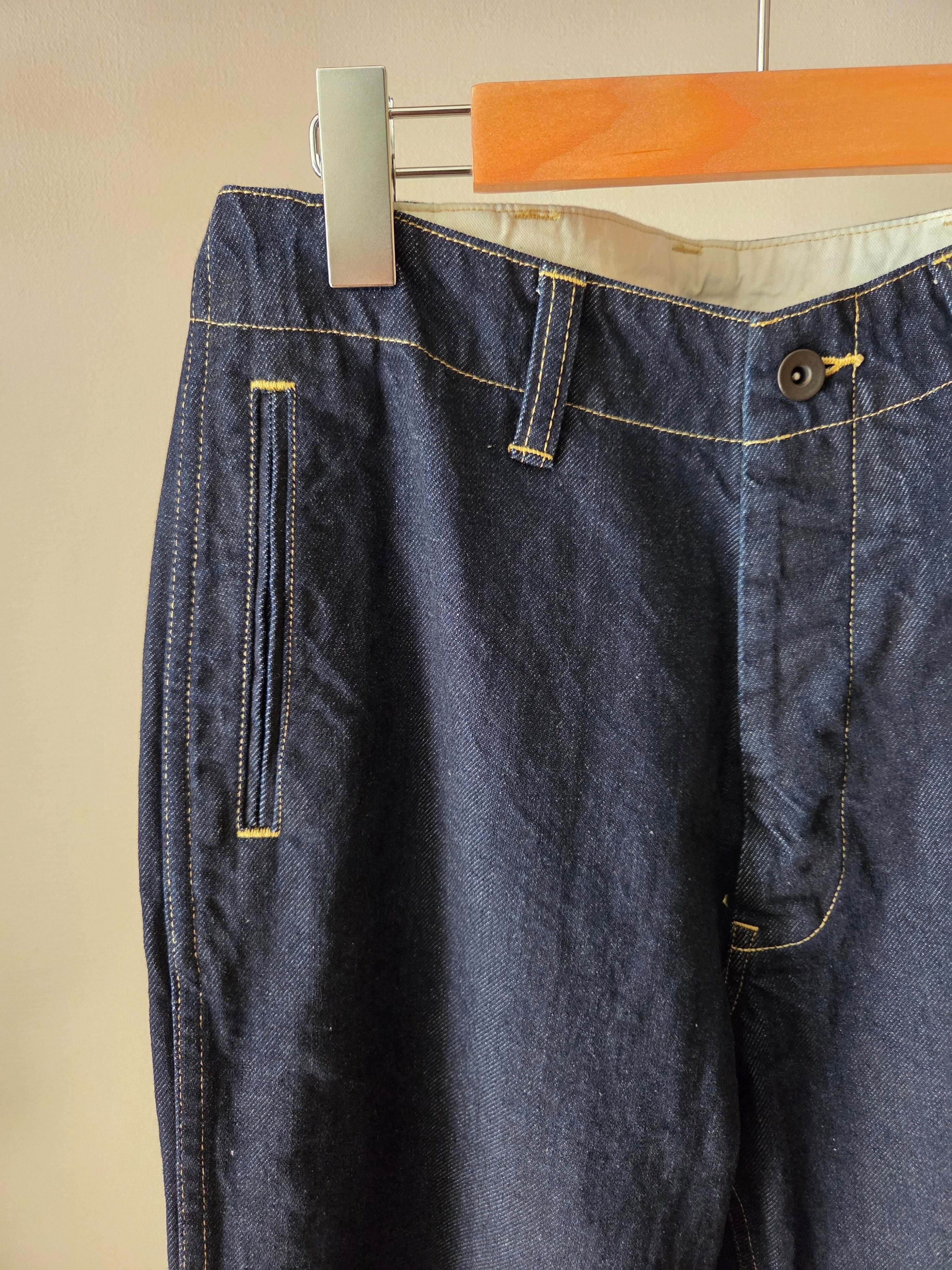 デニムの産地岡山で織られた生地を使用。ピュアインディゴを用いて糸の中心が白く残るロープ染色をしている為、アタリや色落ちの経年変化を楽しんでいただけます。