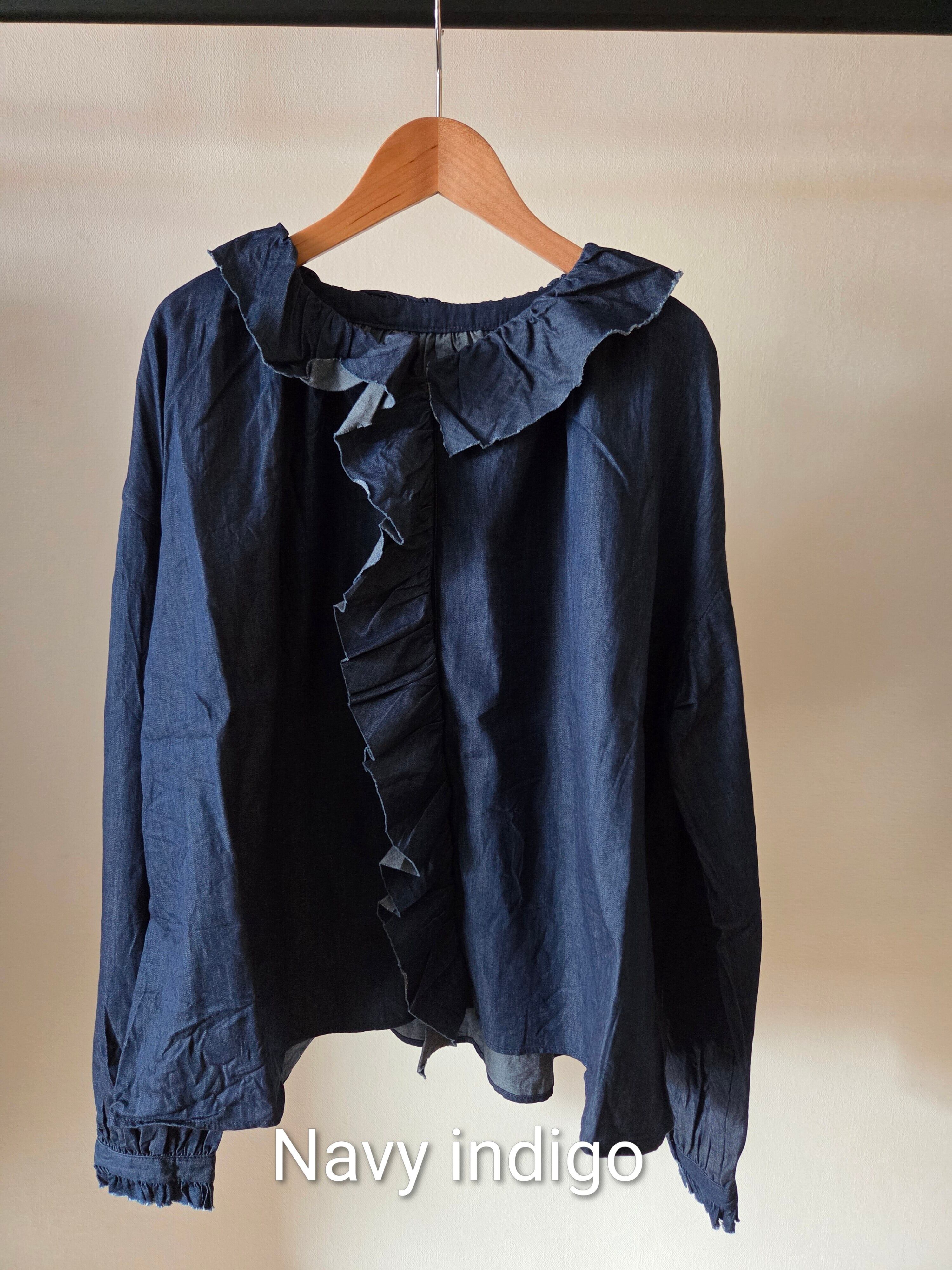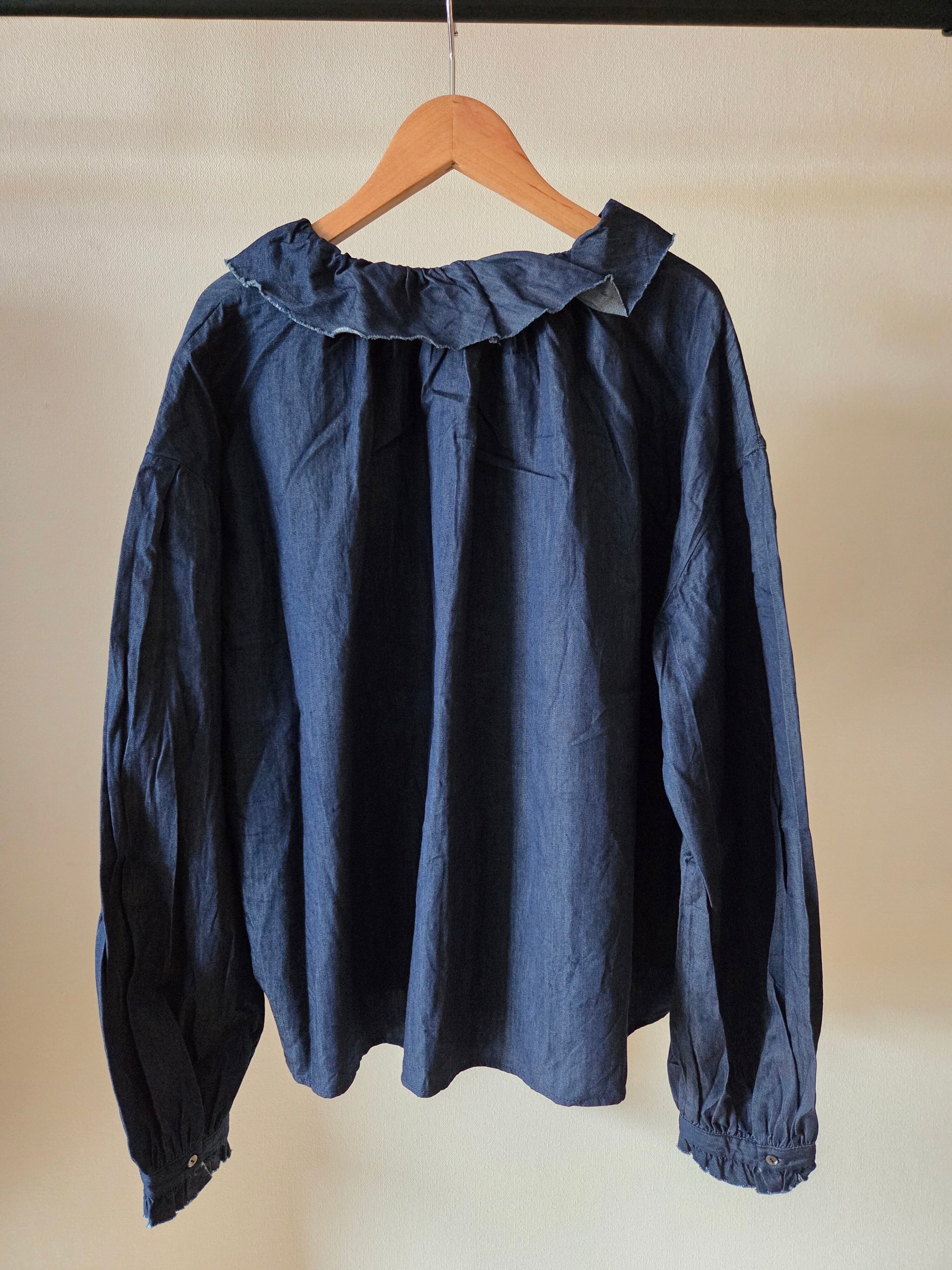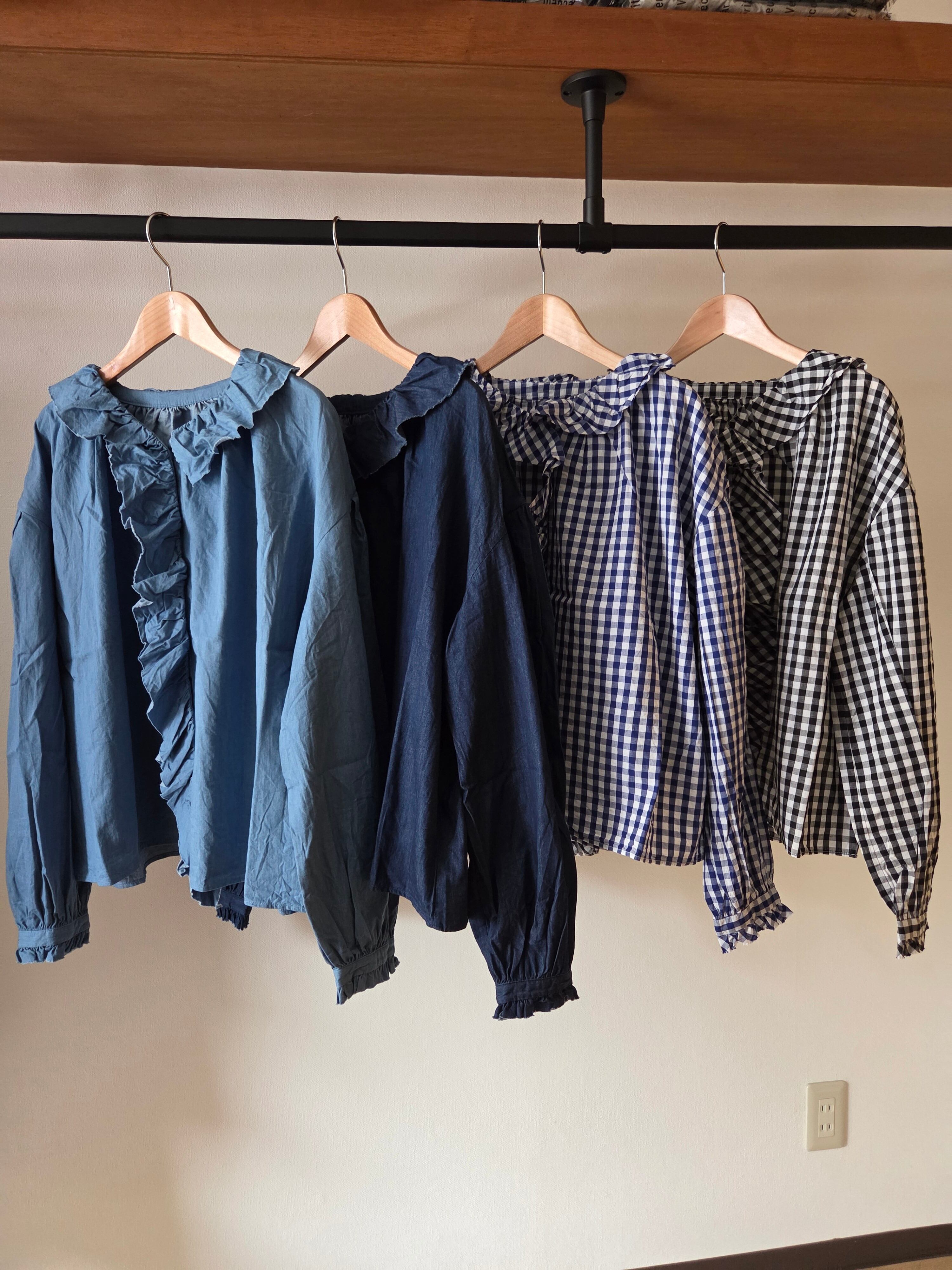 フリルカラーのブラウス。衿ぐりから前端に掛けて寄せられたフリルが特徴的な 1 着。