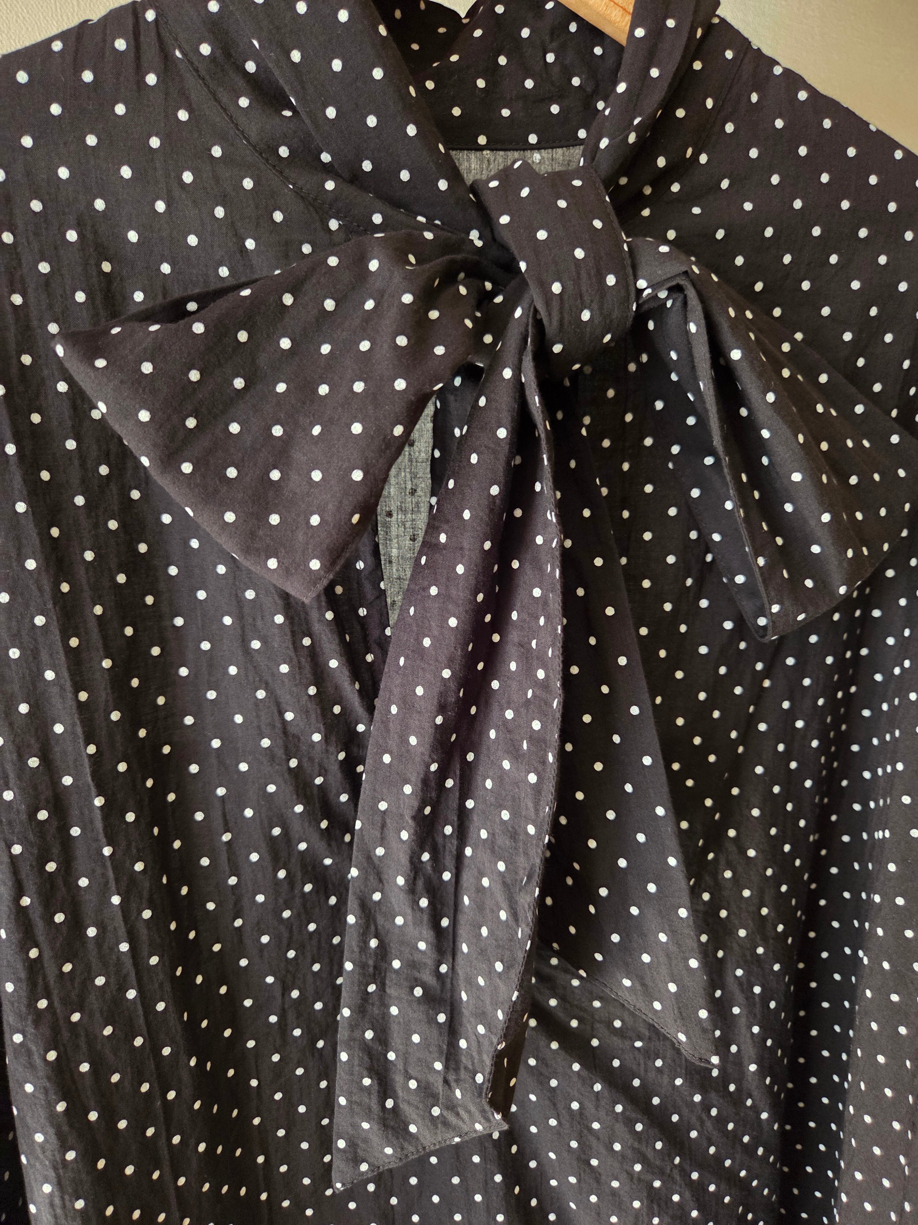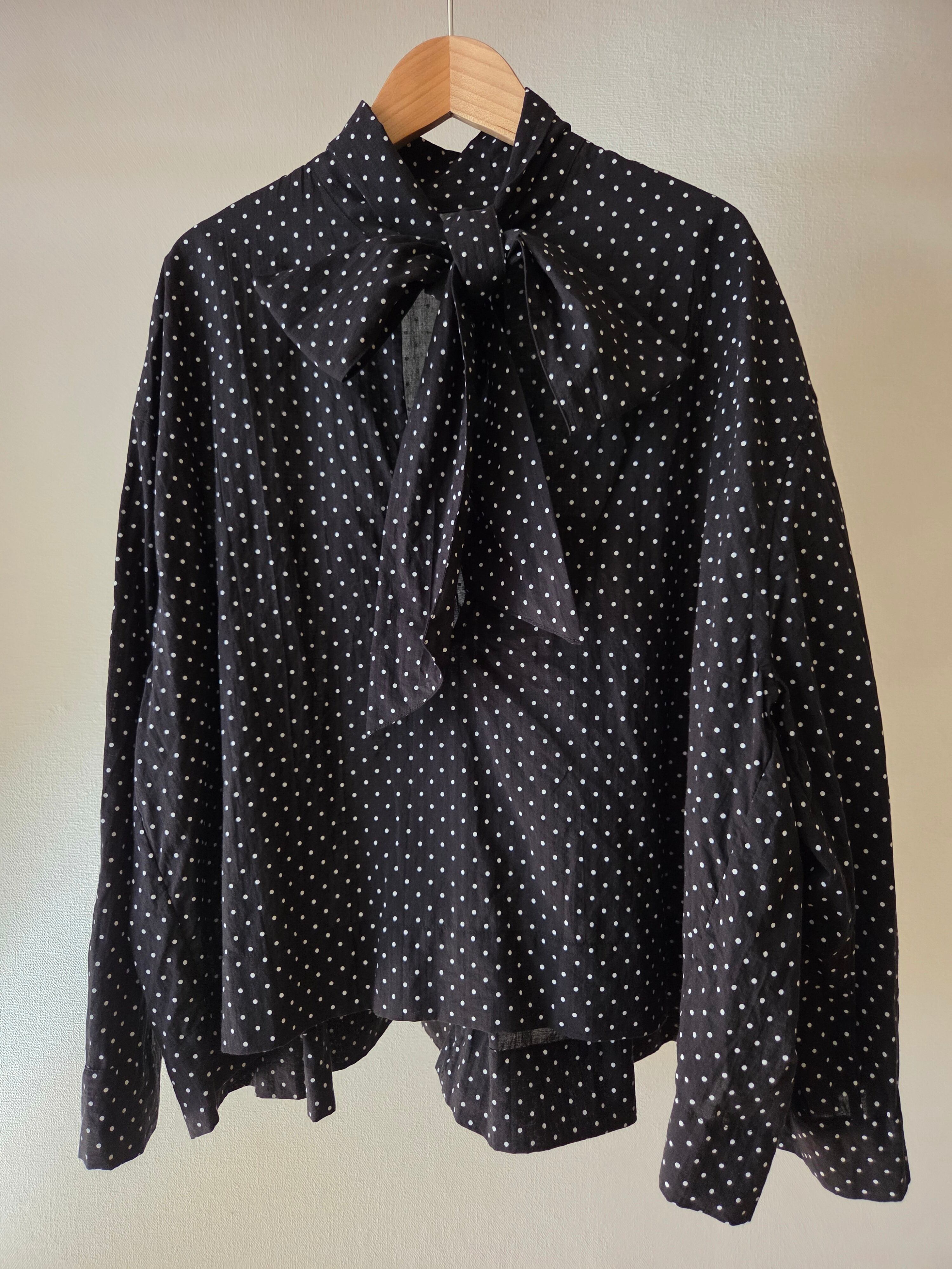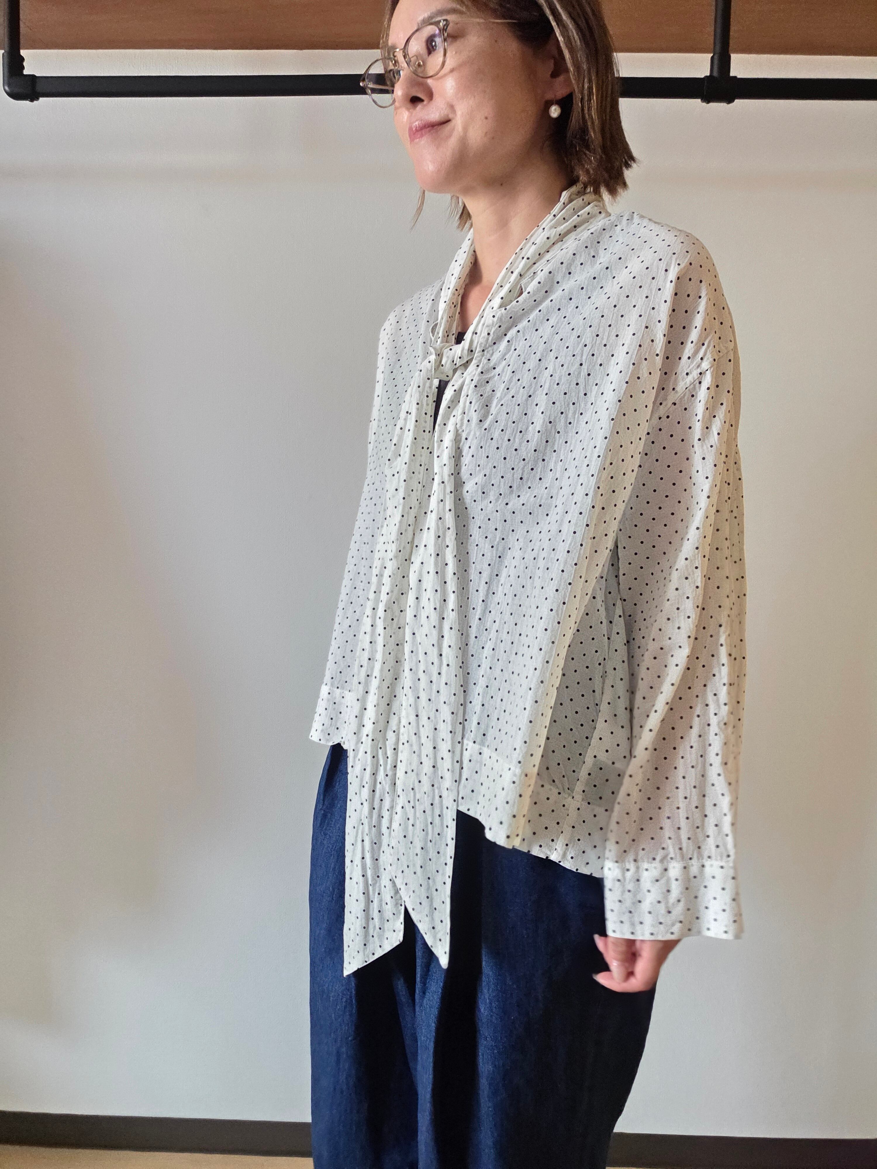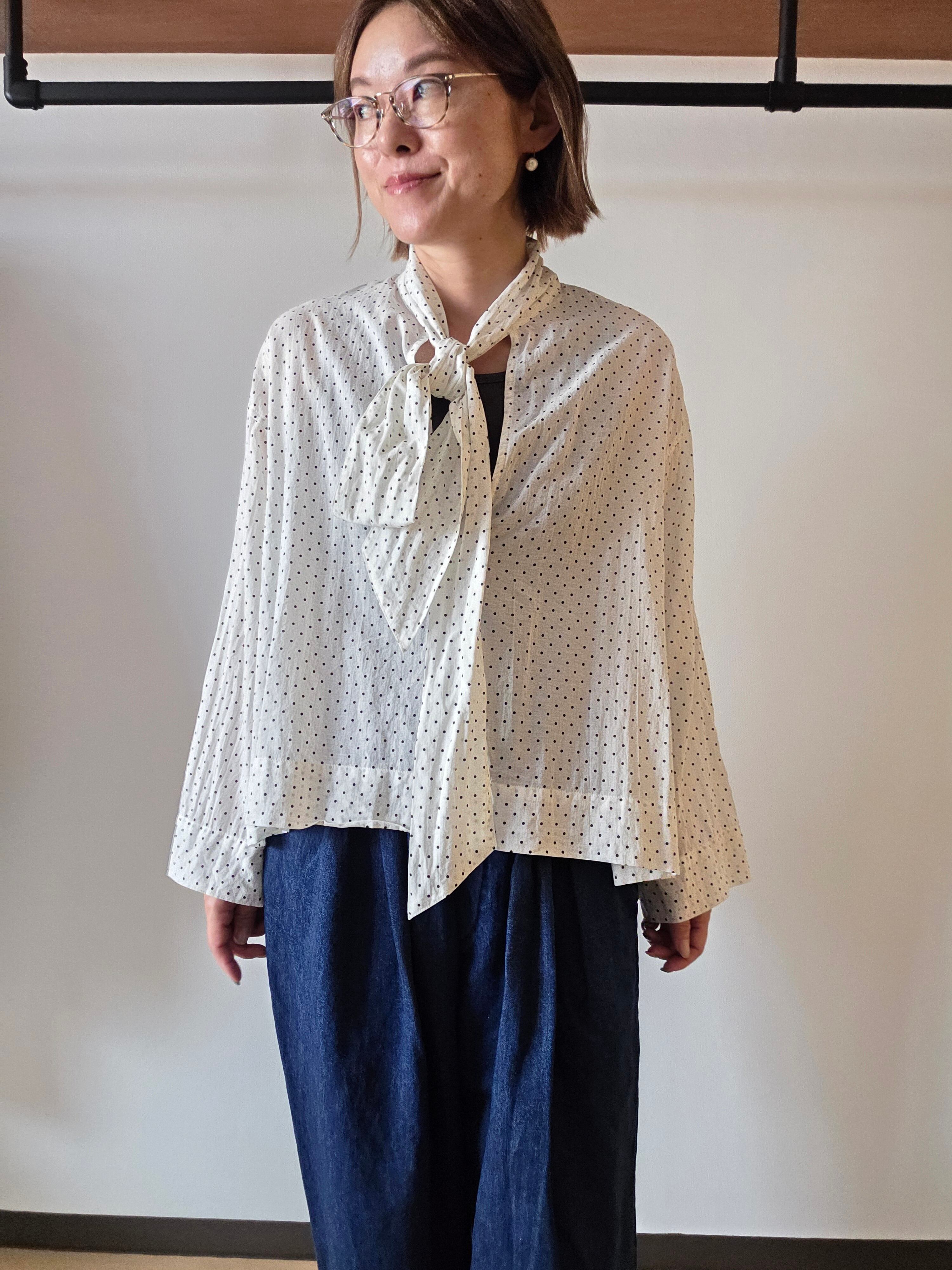 コンパクトな着丈のタイカラーブラウス。タイの結び方によってスタイリングの幅が広がる 1 着。
