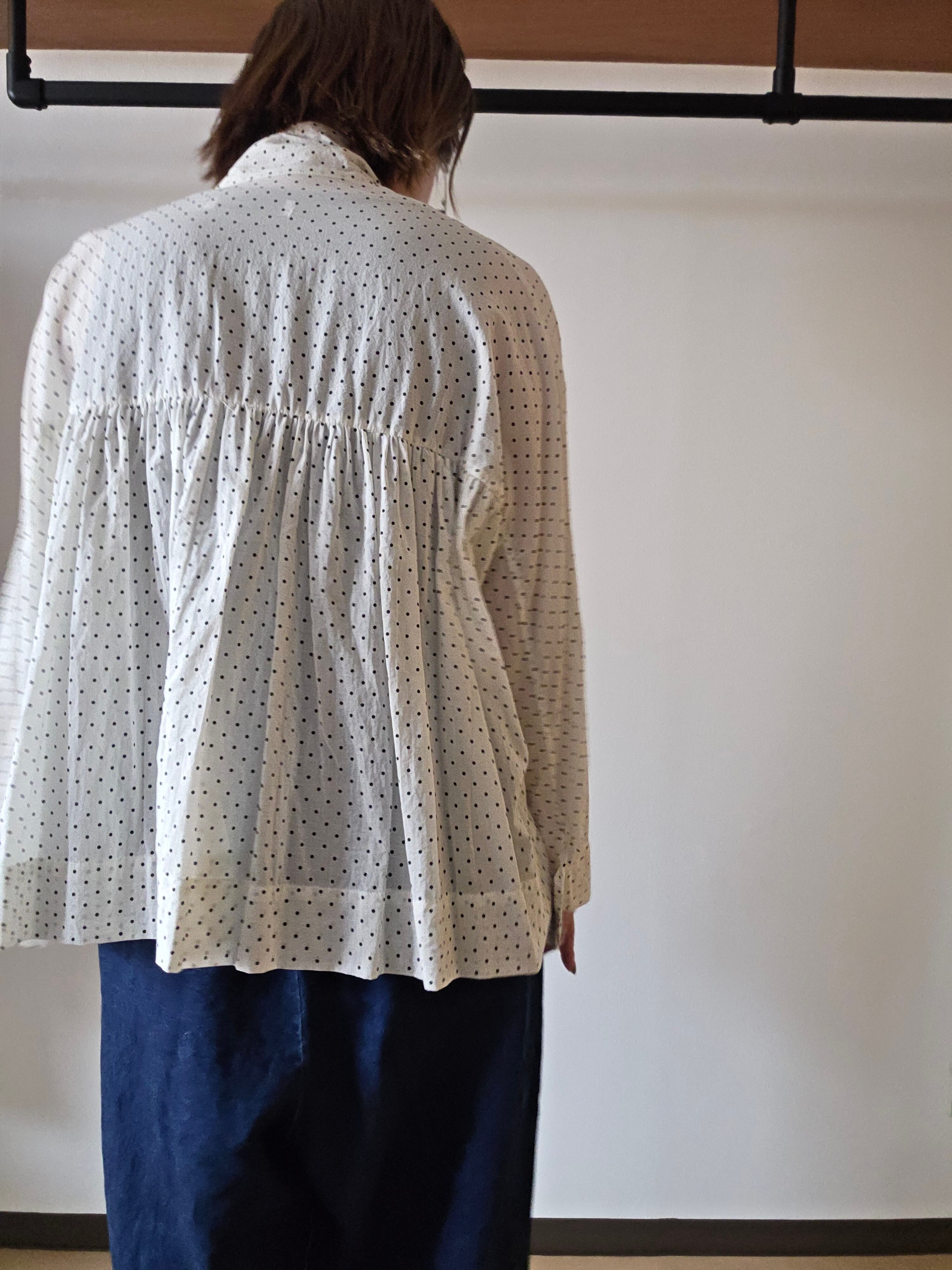 前身頃がシャツスリーブ、後ろがギャザーの入ったヨークスリーブになっており前後で異なる印象が楽しめます。