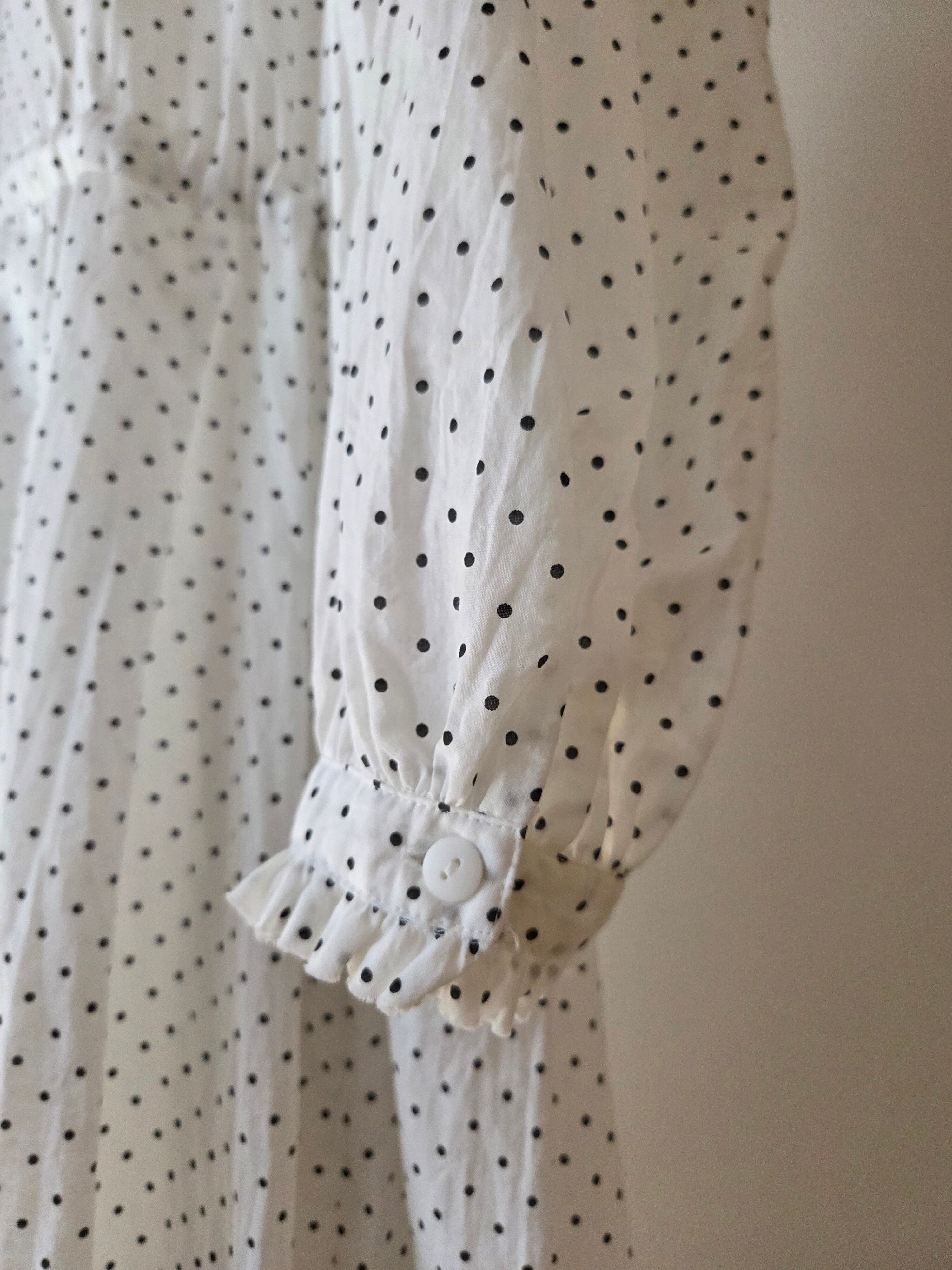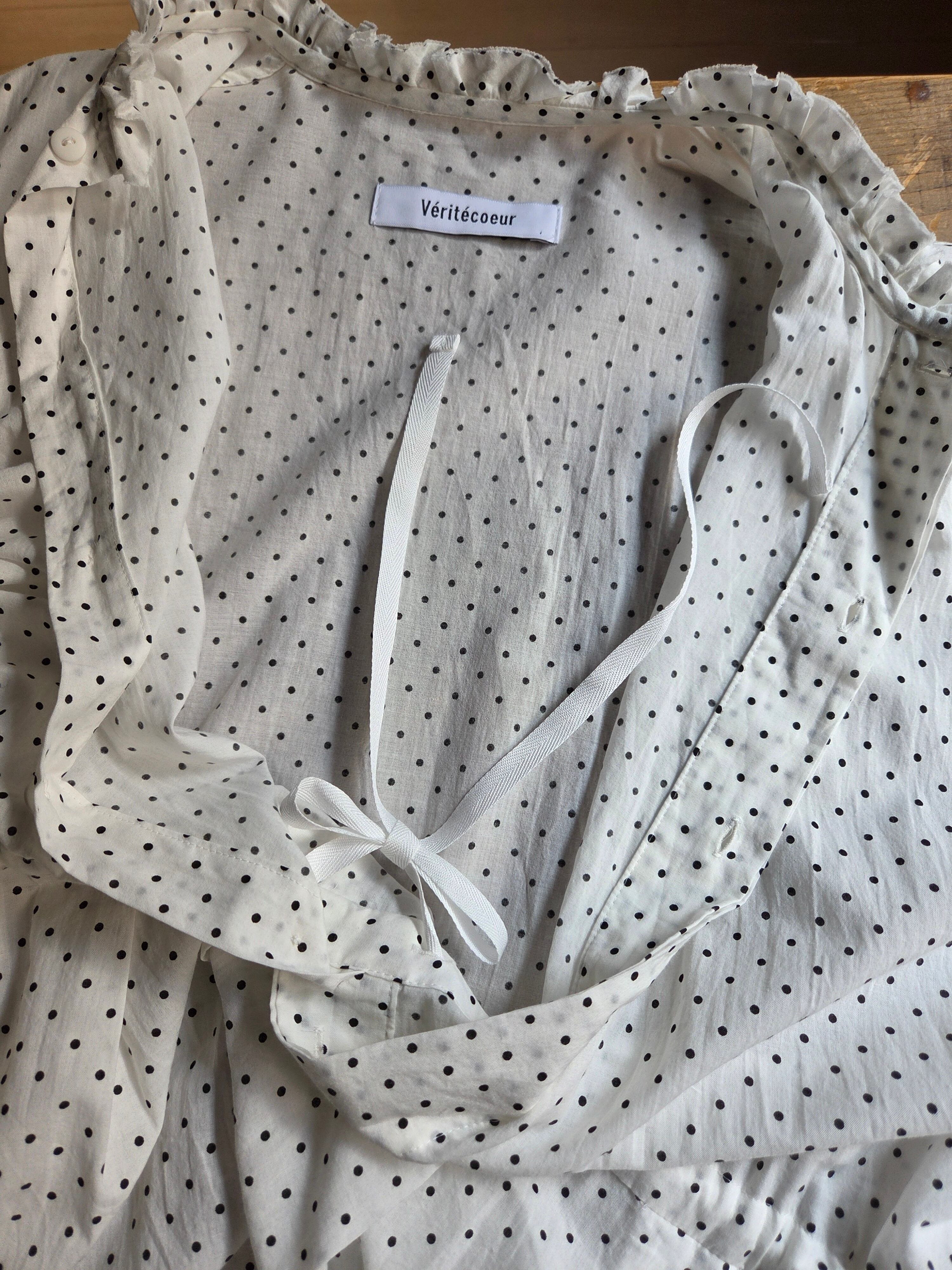 ウエストにぐるりとタックを寄せたワンピース。衿ぐりと袖口に付いたフリルが繊細でフェミニンな印象になっています。