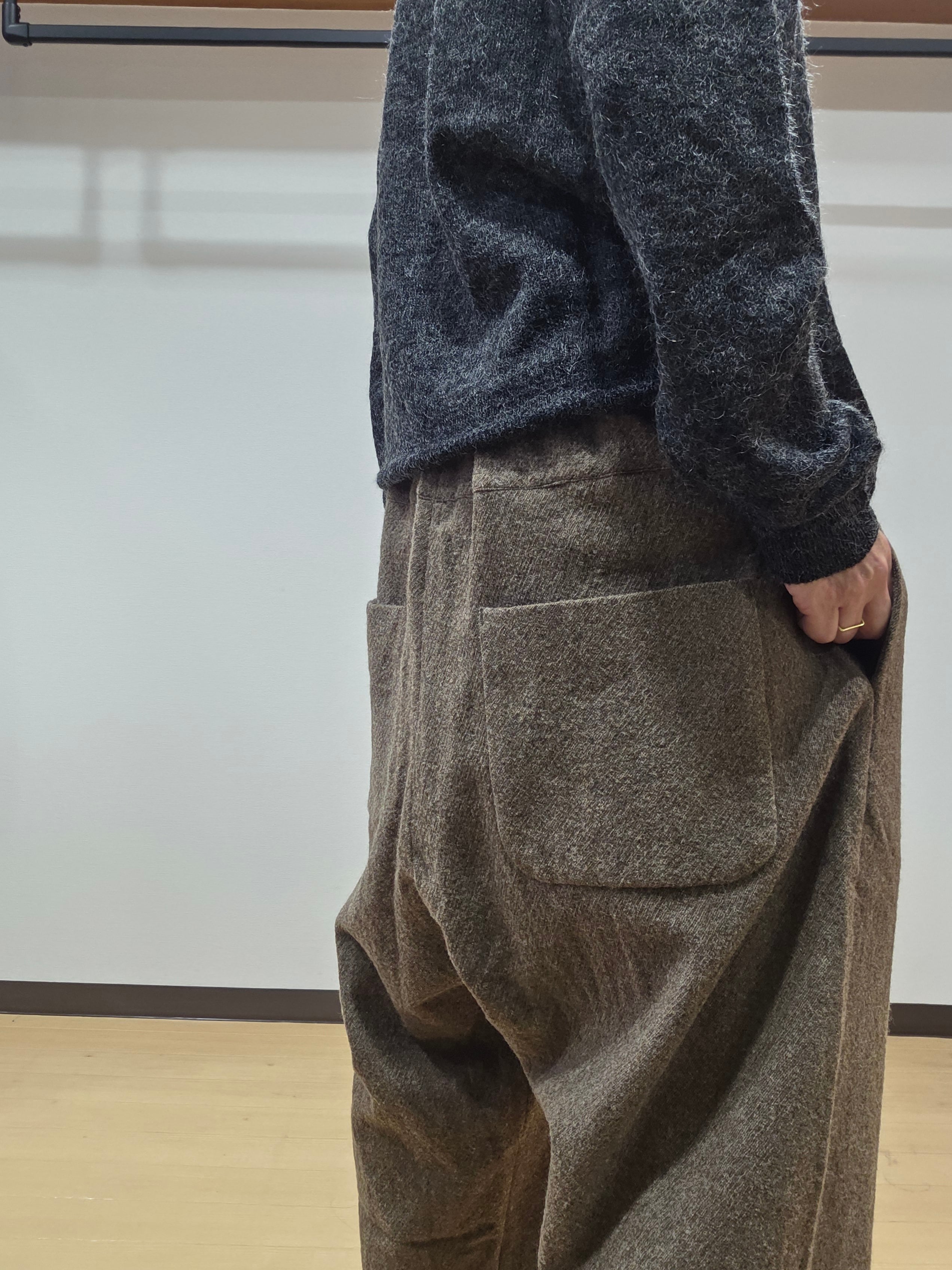 きれい目にも着用いただけるようなサルエルの太さに仕上げております。フォーマルにも、カジュアルにも合わせやすい1枚です。同素材とセットアップのコーディネートもオススメです。