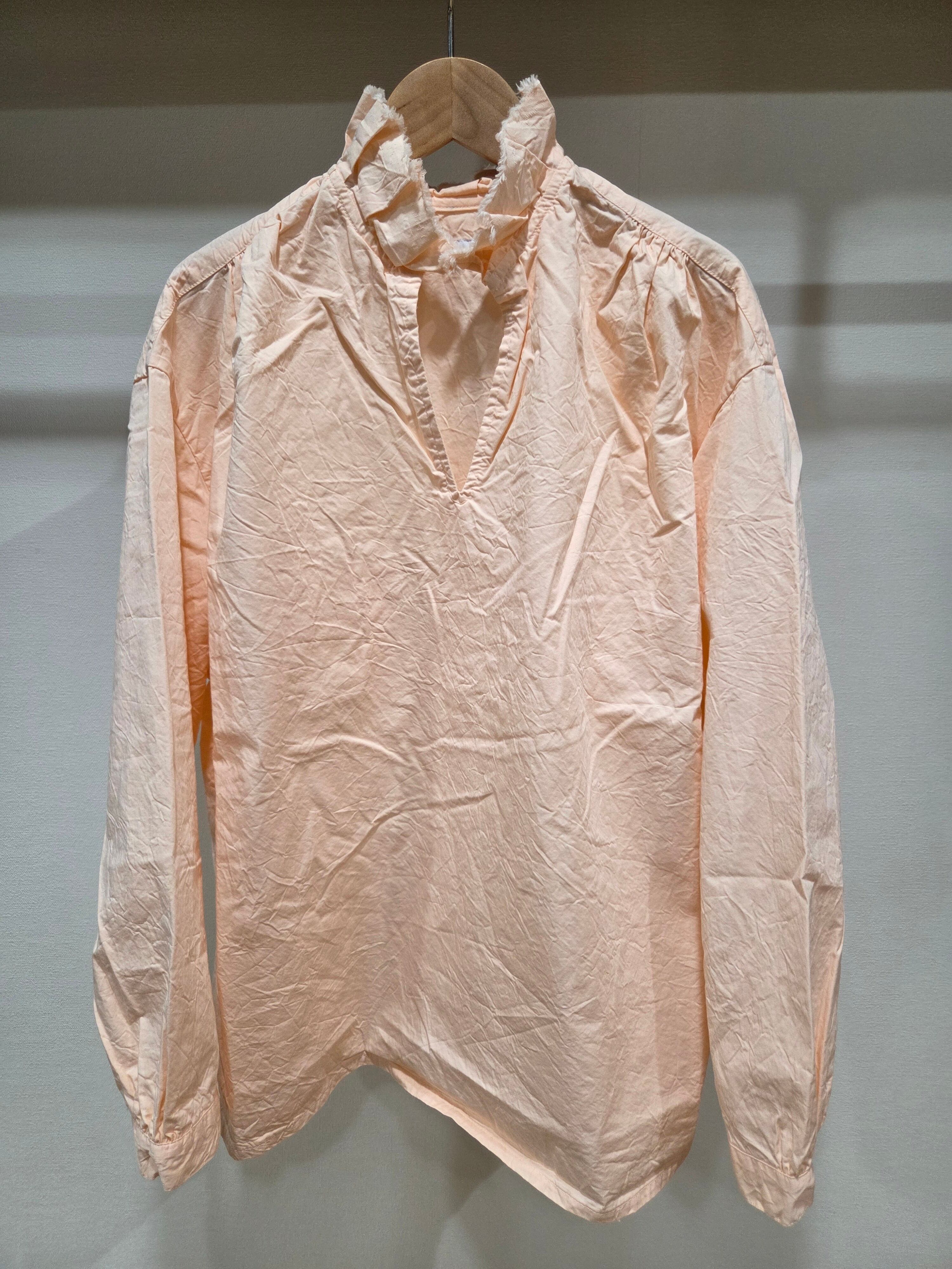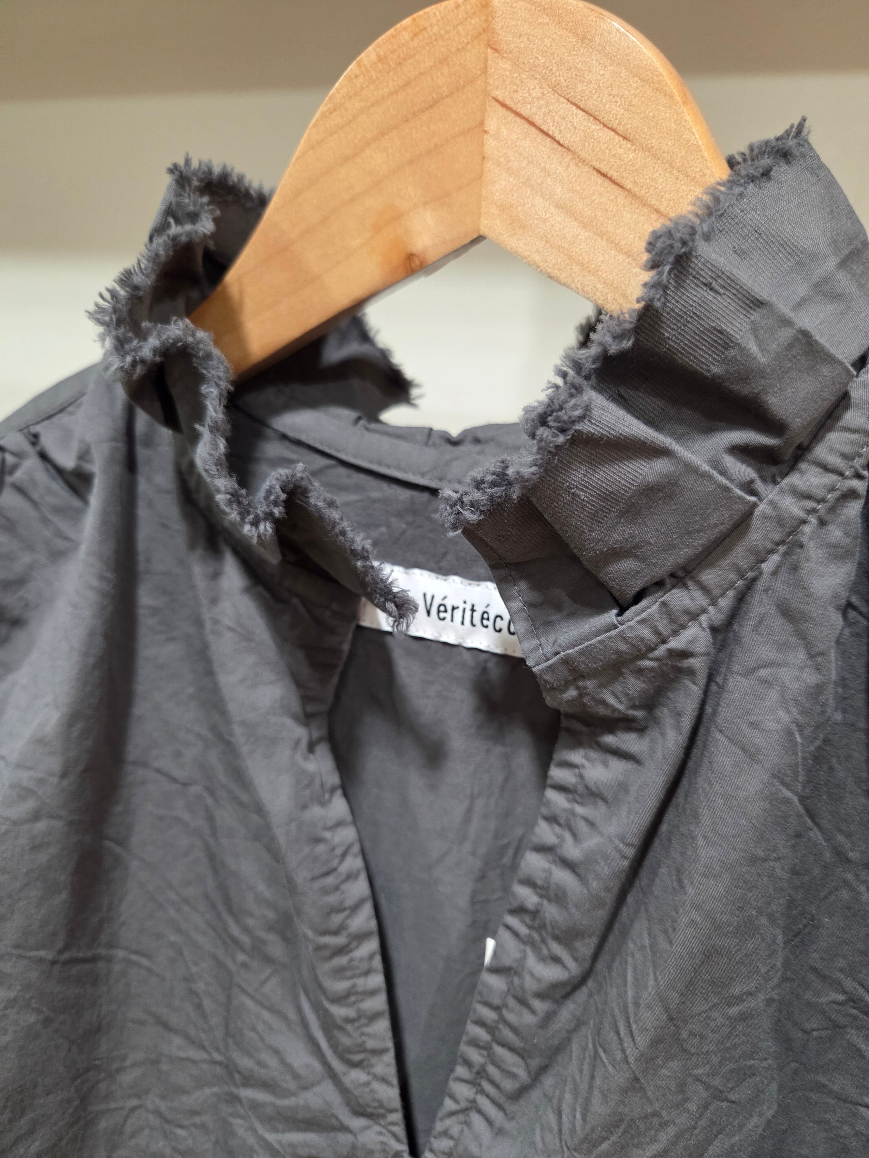 タックフリルを寄せたスタンドカラーが特徴的なブラウス。