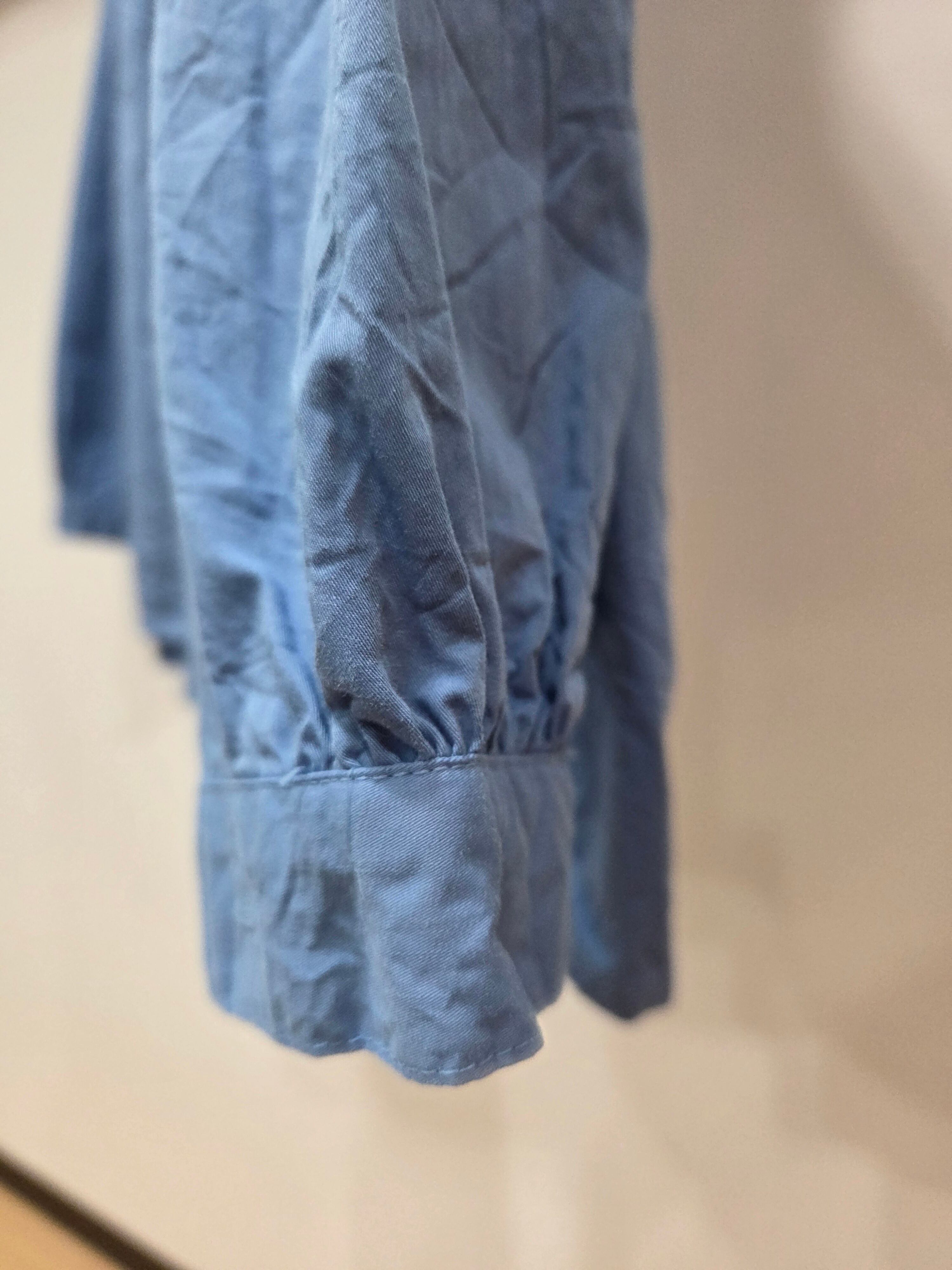 身頃にも随所にタックやギャザーが寄せられ、ふんわりとした A ラインのシルエットになっています。フェミニンなデザインにカジュアルな素材を合わせバランスを取った 1 着です。