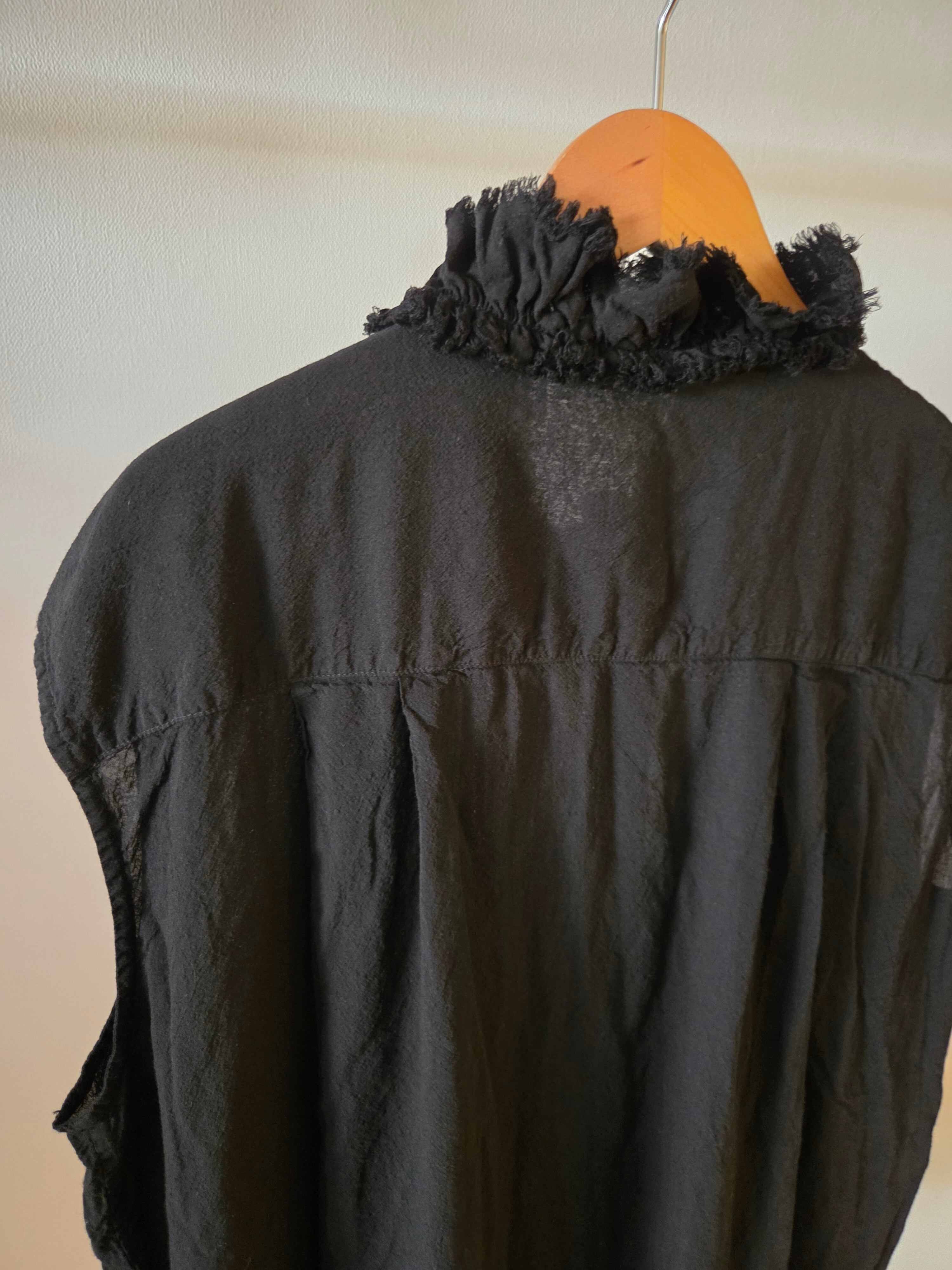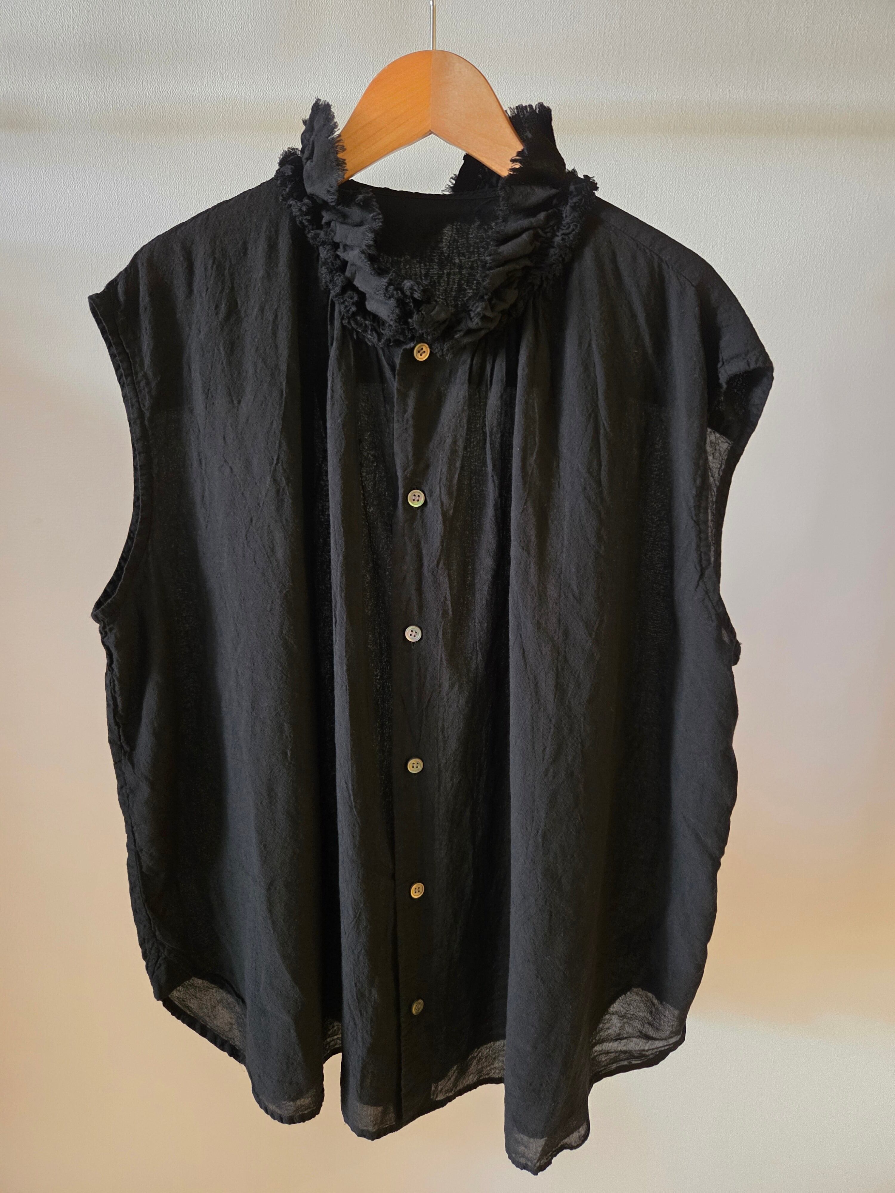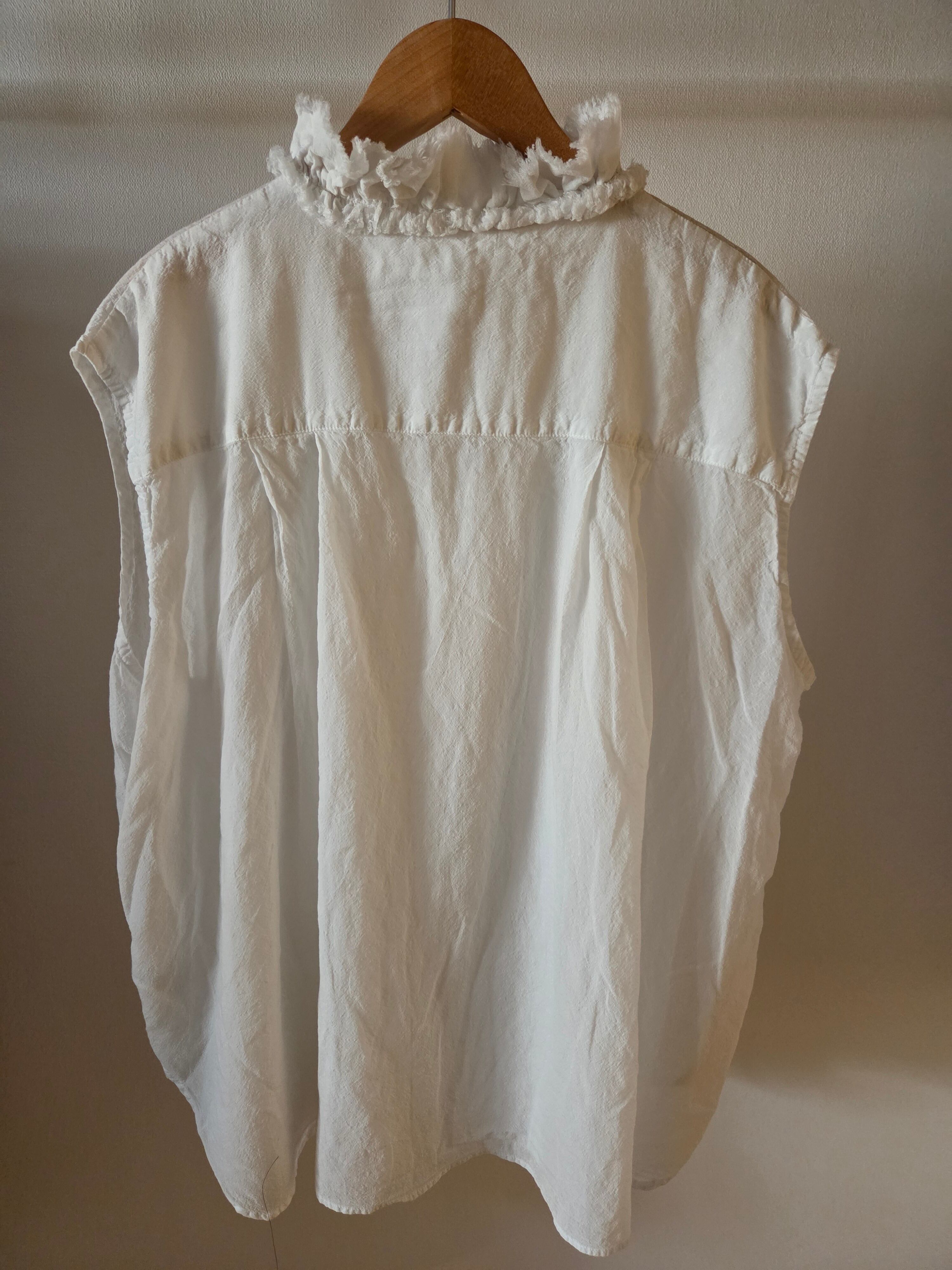 フリルを寄せた衿元が特徴的なノースリーブシャツです。フリルの端をカットオフにすることでラフな雰囲気に仕上げました。