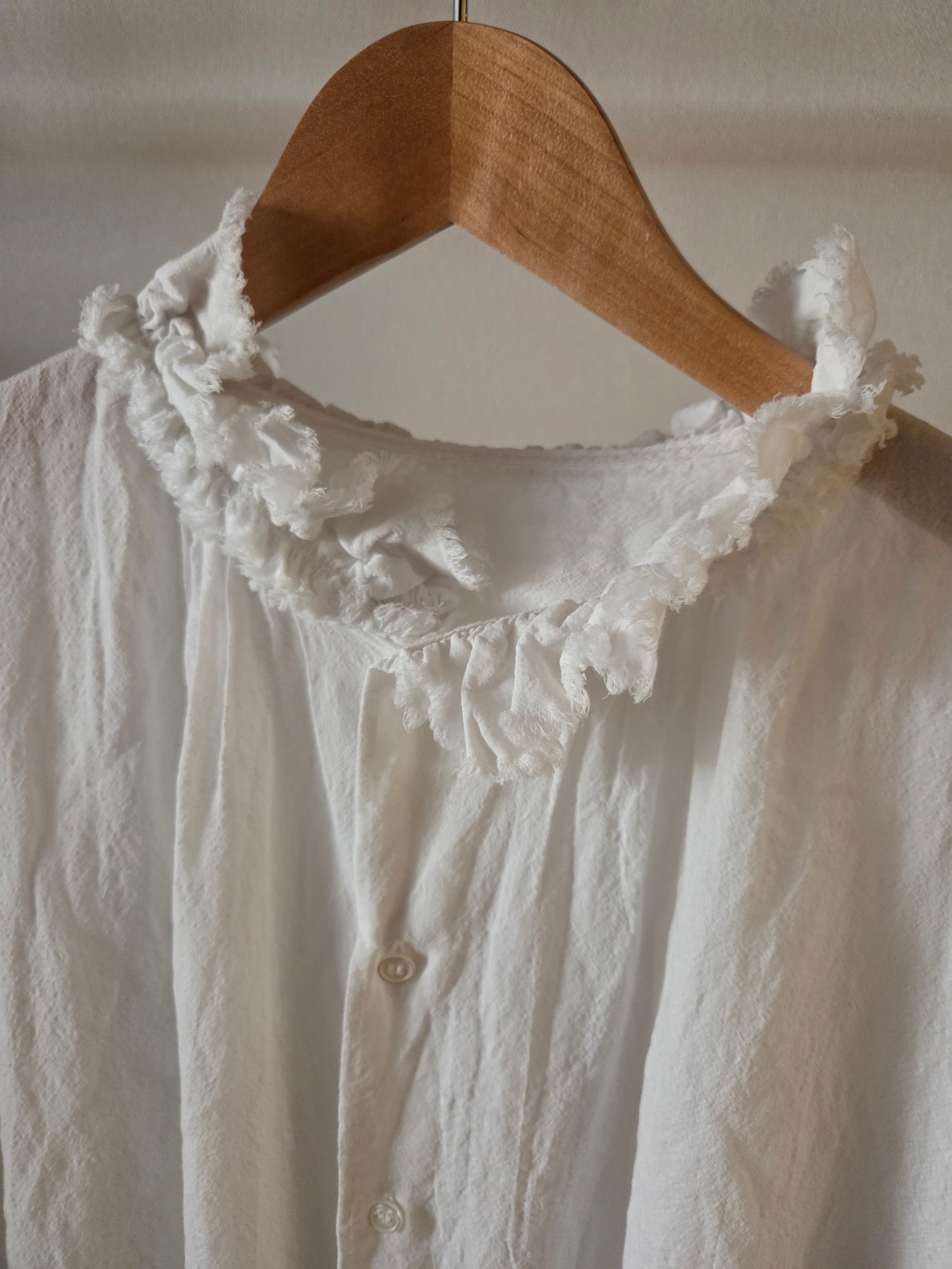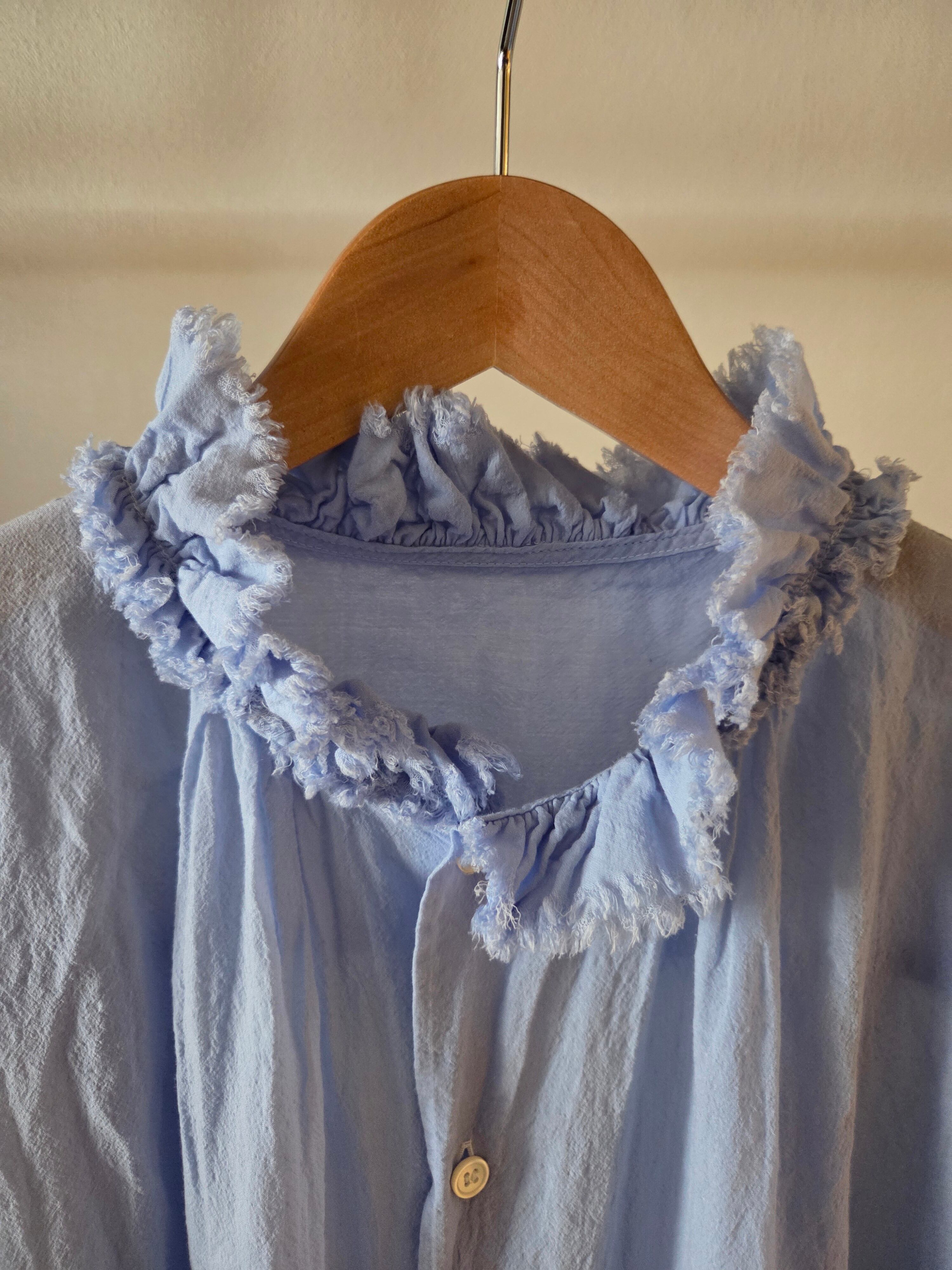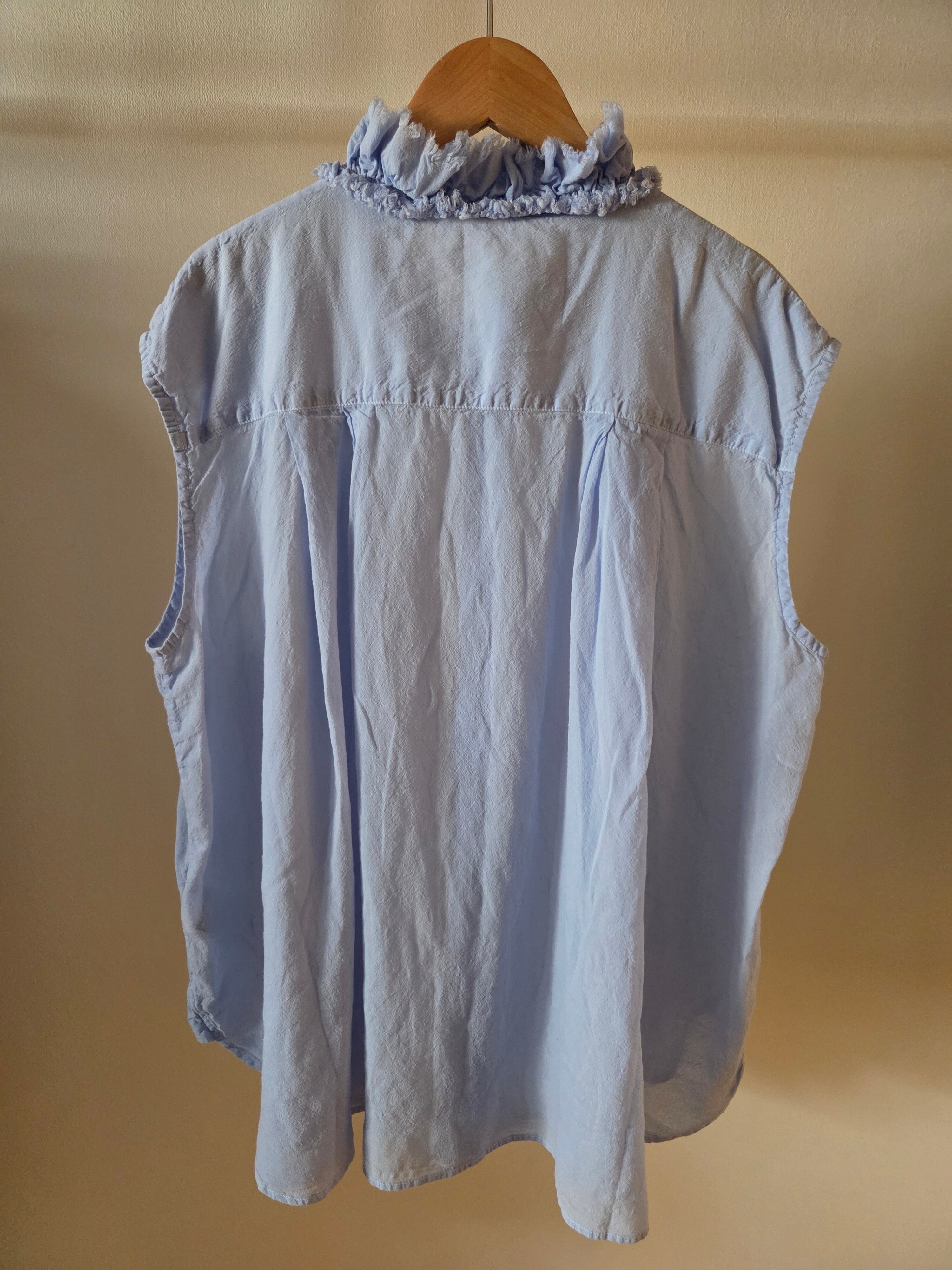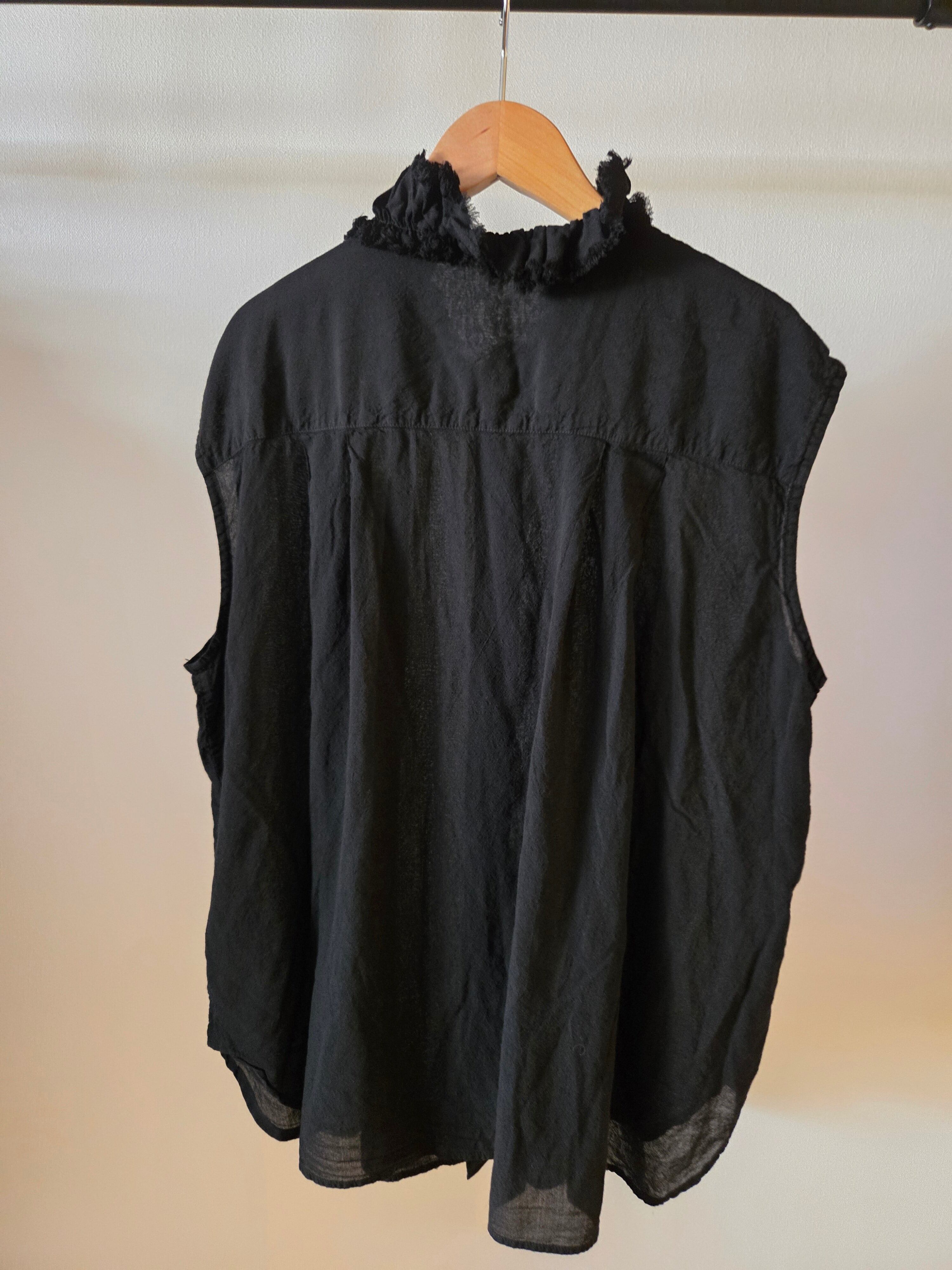 フリルを寄せた衿元が特徴的なノースリーブシャツです。フリルの端をカットオフにすることでラフな雰囲気に仕上げました。