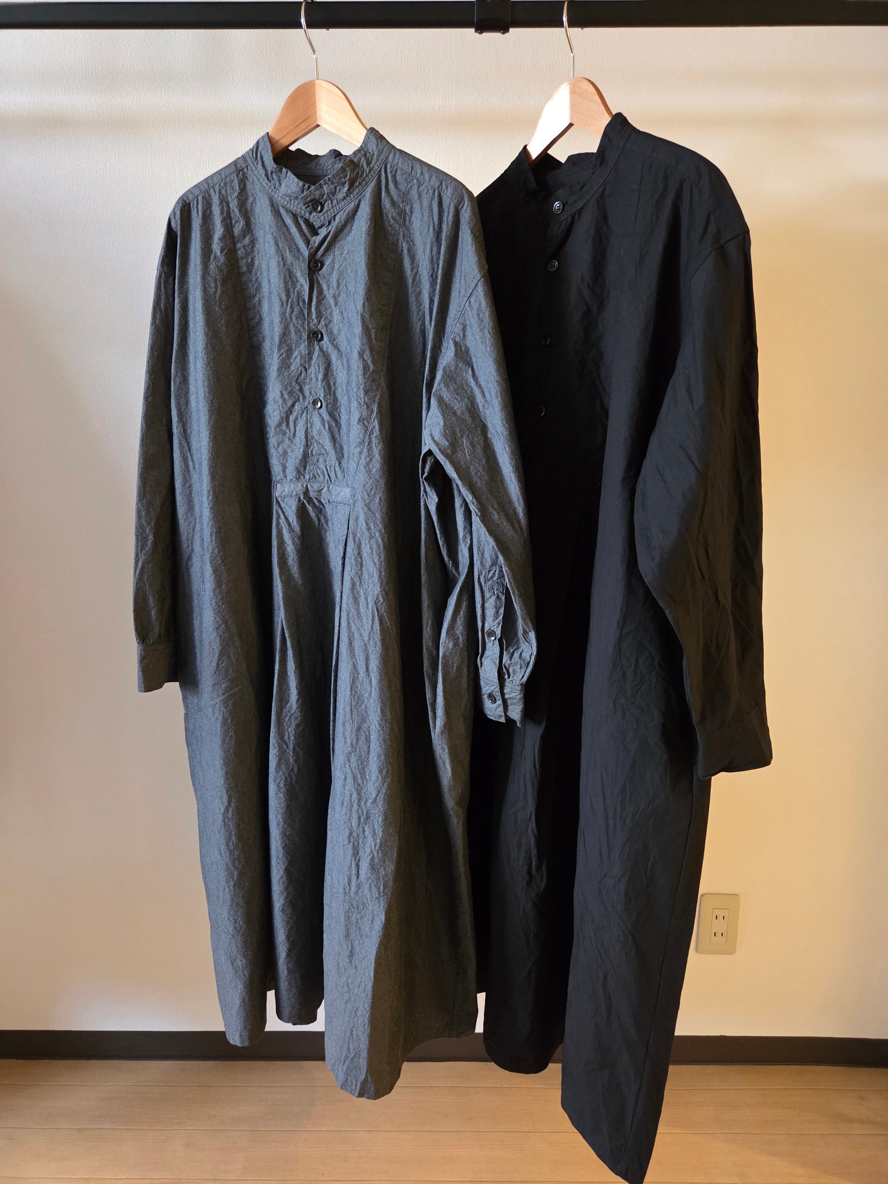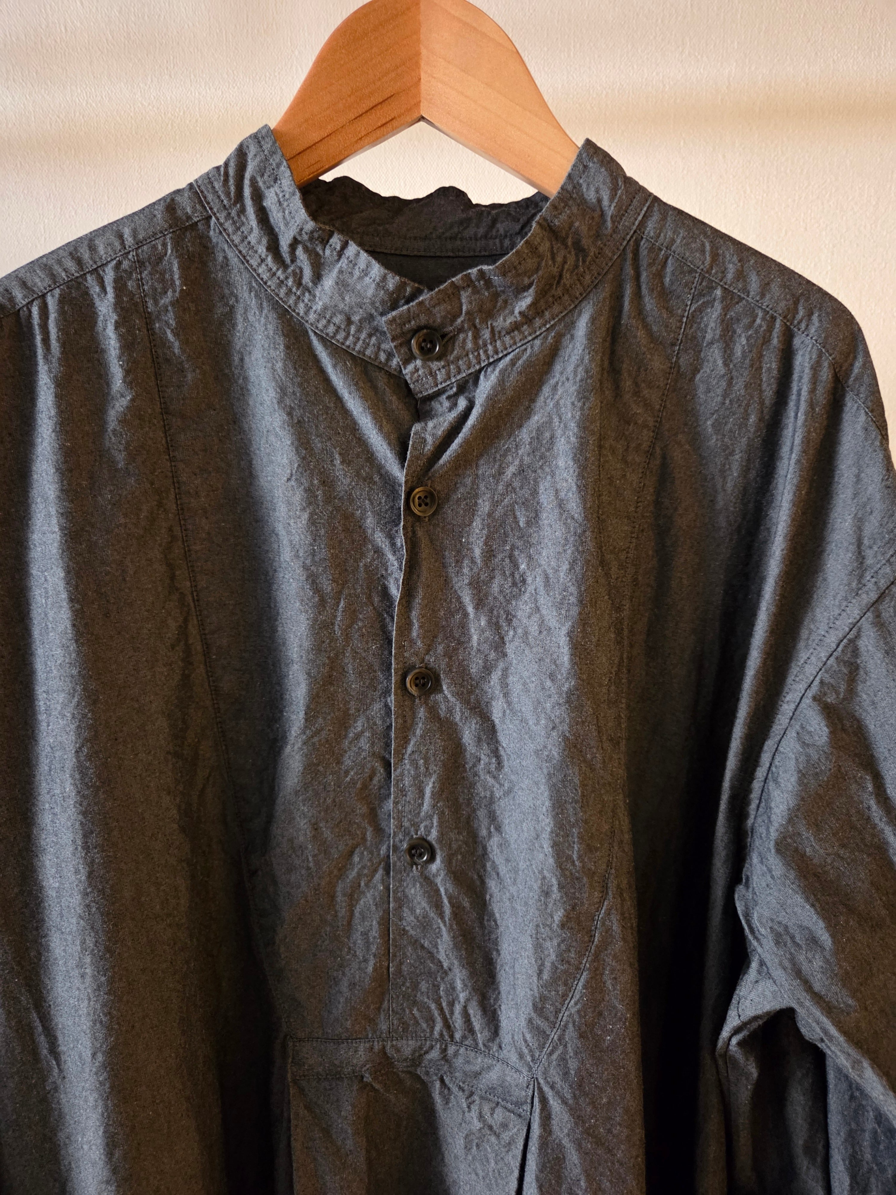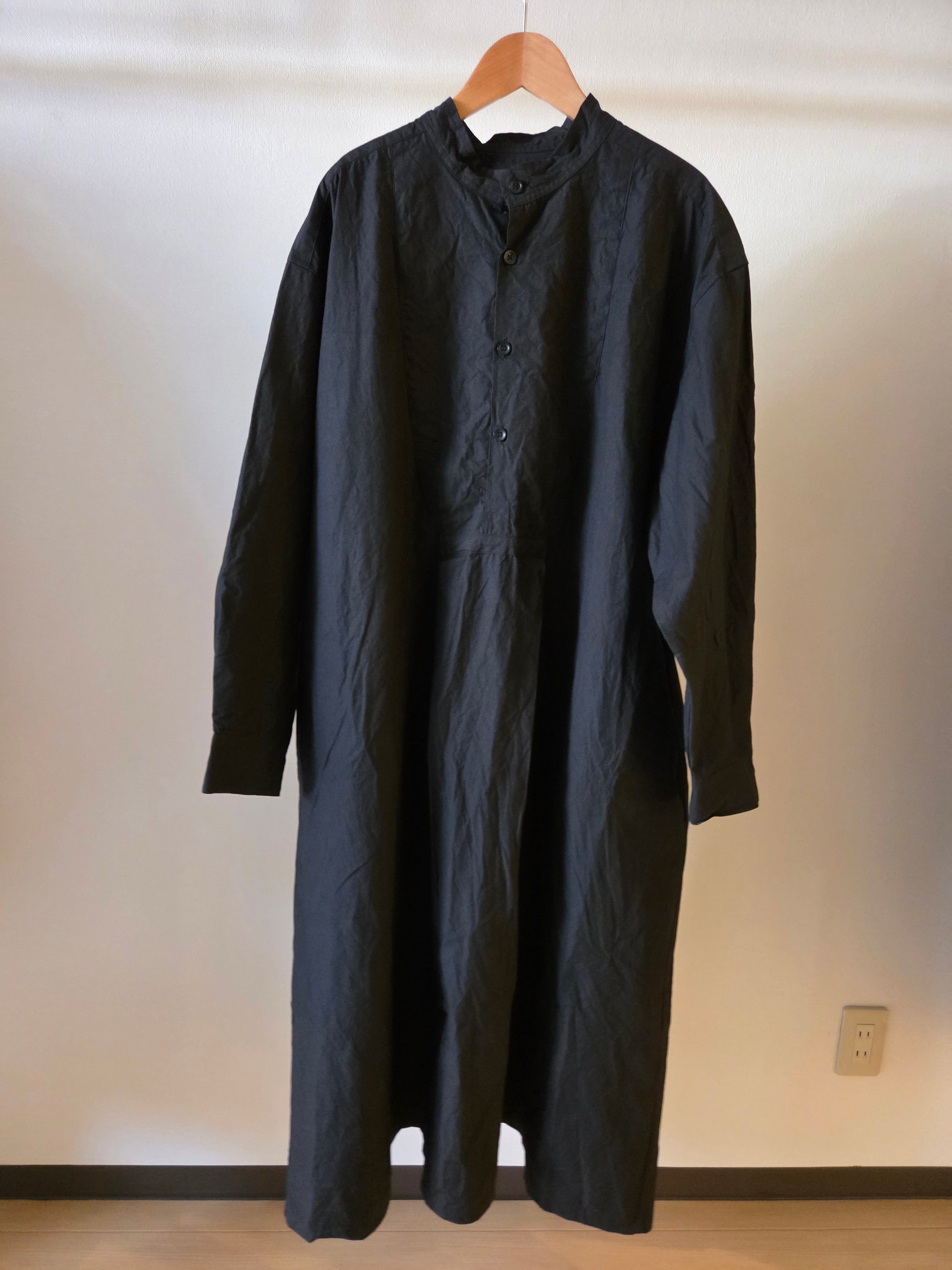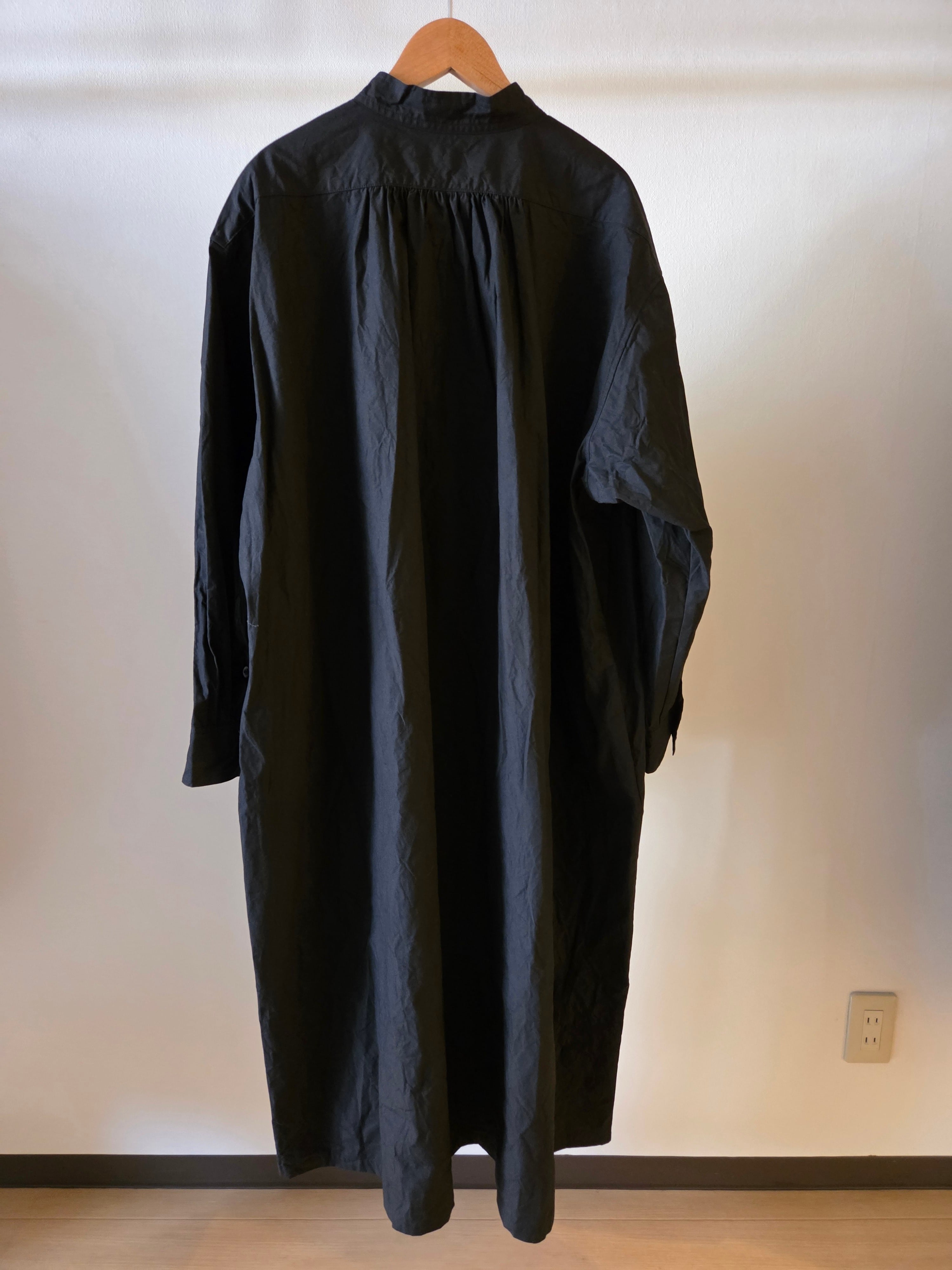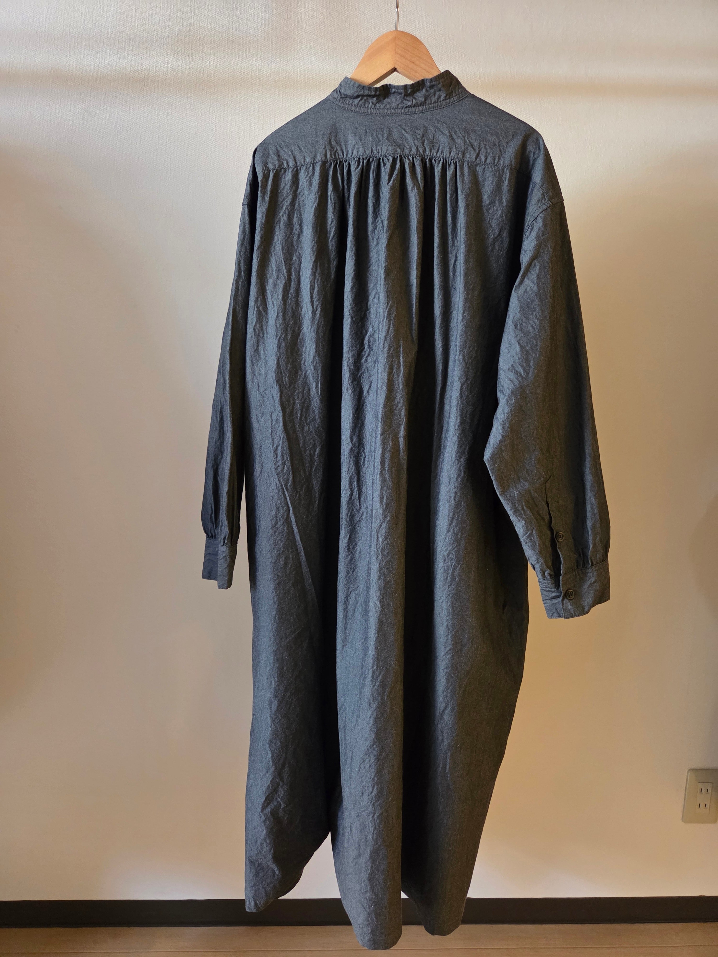 フロントの胸当てや狭く設定された後ろのヨーク切り替えが、ヴィンテージのドレスシャツを彷彿とさせるワンピース。身巾や袖巾にゆとりを持たせ、デイリーに着用しやすいバランスに仕上げています。